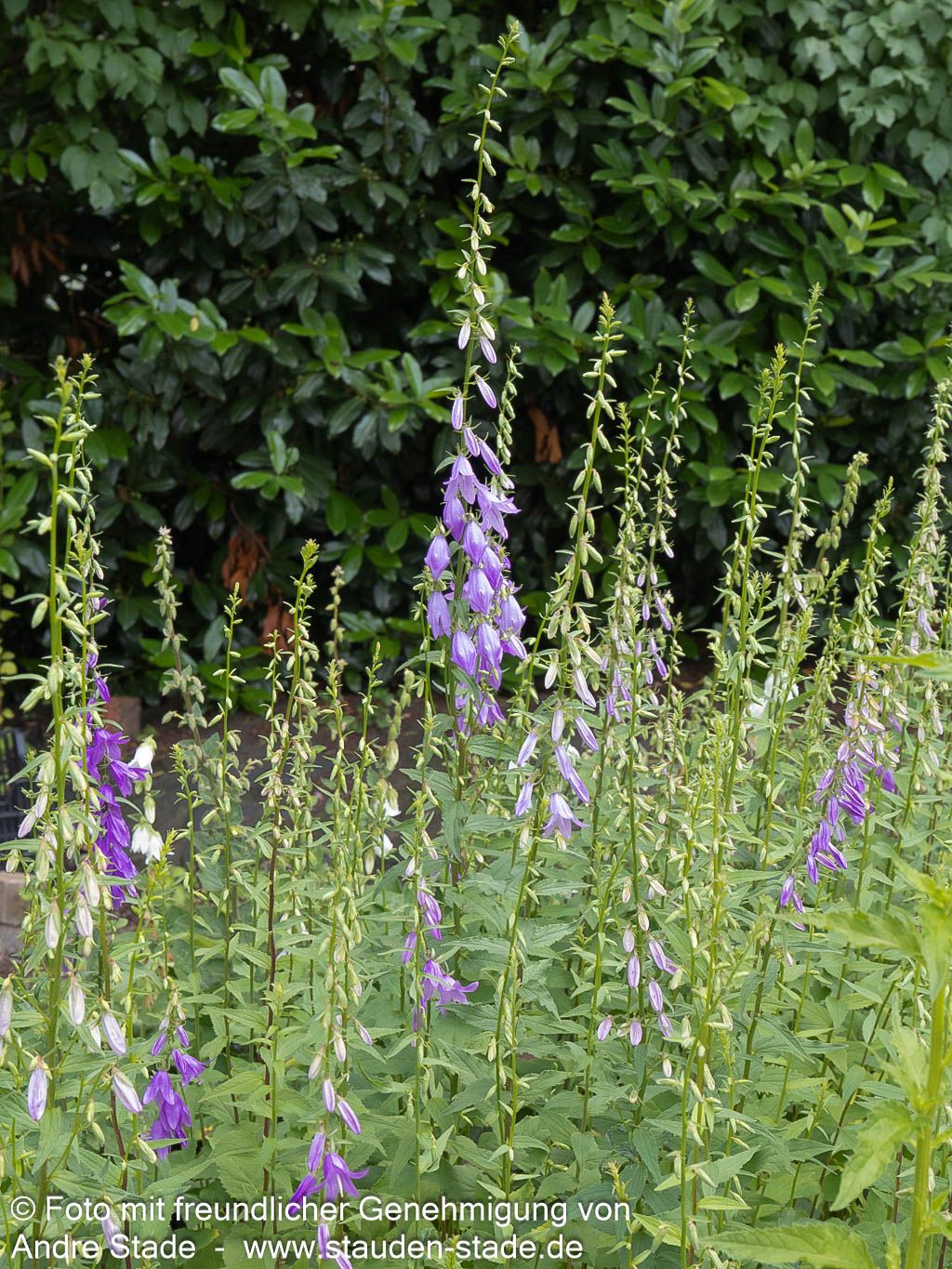 Die Acker-Glockenblume (Campanula rapunculoides) ist eine bezaubernde heimische Staude, die von Juni bis September mit ihren blauvioletten, einfachen Blüten in 50-80 cm Höhe begeistert. Diese robuste Staude wurde nicht umsonst zur Staude des Jahres 2001 gekürt und entwickelt sich mit ihren aufrechten Stängeln und grundständigem Blattschopf zu einem echten Blickfang. Die tief-grünen, sommergrünen Blätter bilden einen wunderschönen Kontrast zu den violettblauen Blüten. Als wertvolle Insektennährpflanze und kulinarisch bedeutsame Art gedeiht sie optimal an sonnigen Standorten auf trockenen bis frischen Böden. Dank ihrer extremen Winterhärte bis -39°C ist diese ausläuferbildende Staude eine dauerhafte Bereicherung für Gehölzränder, Freiflächen und Steppenheiden.