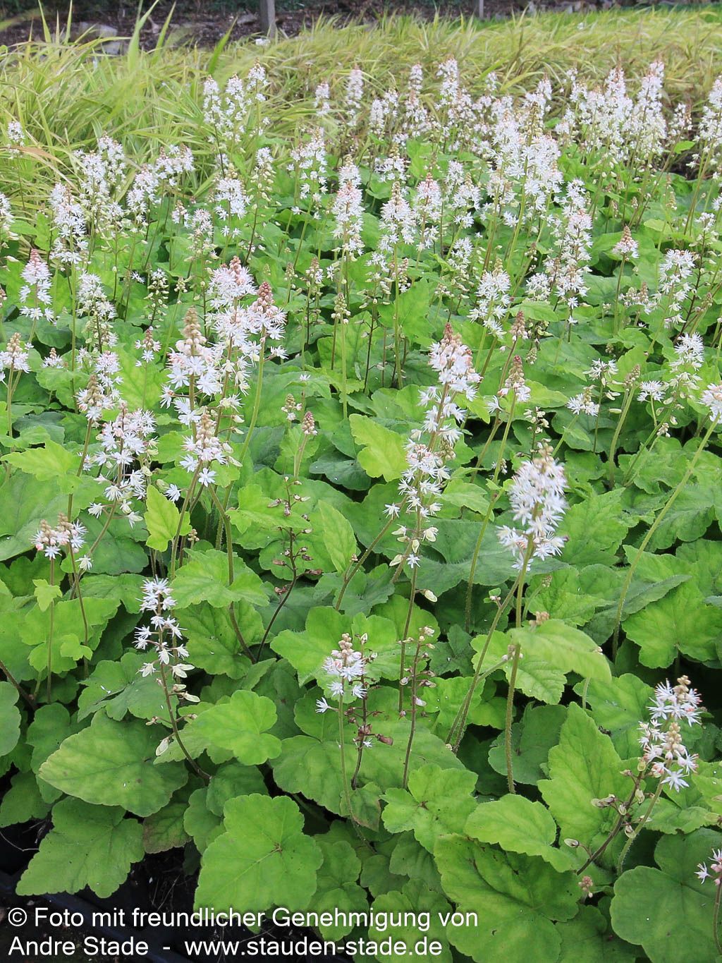Die Amerikanische Schaumblüte (Tiarella wherryi) ist eine bezaubernde Schattenstaude, die mit ihren zarten weißen Blüten von April bis Mai jeden Gartenbereich unter Gehölzen zum Leben erweckt. Diese winterharte Sternensorte bildet attraktive, grüne Blattrosetten und erreicht eine Blütenhöhe von 20-25 cm. Als idealer Bodendecker gedeiht sie perfekt an halbschattigen bis schattigen Standorten mit frischem Boden. Ihre wintergrünen Blätter machen sie zu einer wertvollen Gehölzrandstaude, die sich hervorragend als Begleitstaude zu Rhododendron eignet und mit einem Pflanzabstand von 20-30 cm traumhafte Gartenbilder schafft.