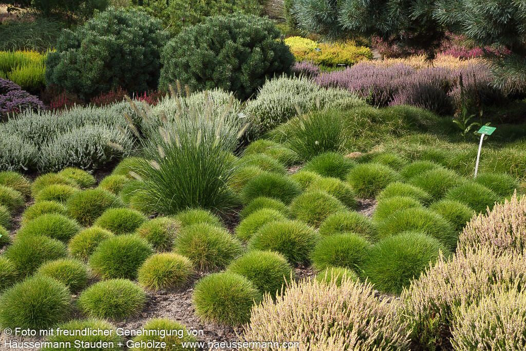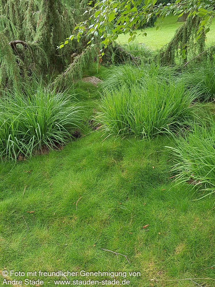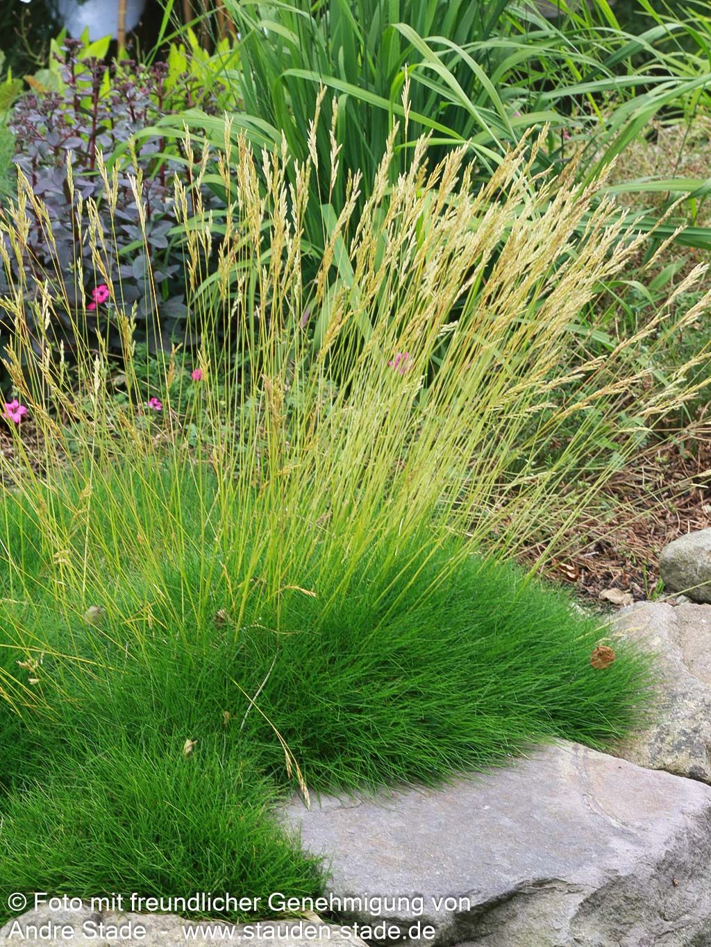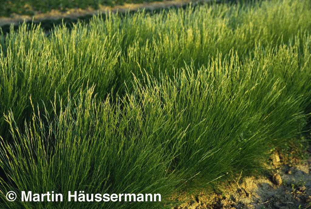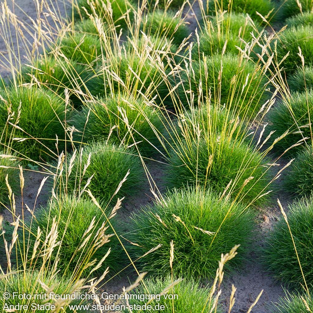 Der Bärenfell-Schwingel (Festuca gautieri) ist ein außergewöhnlich robustes und winterhartes Ziergras, das mit seinem dunkel-grünen, wintergrünen Laub ganzjährig für Struktur im Garten sorgt. Diese Sternensorte der deutschen Staudensichtung wächst polsterartig und halbkugelig und erreicht eine Blattwerkhöhe von 10-15 cm. Von Juni bis August erscheinen die gelbgrünen Blüten, die eine Höhe von 20-25 cm erreichen. Dieses vielseitige Gras gedeiht an sonnigen bis absonnigen Plätzen auf trockenen bis frischen Böden und eignet sich hervorragend für Steinanlagen, Felssteppen, extensive Dachbegrünungen und ist auch für Grabstätten geeignet. Mit seiner Winterhärte bis -28°C ist der Bärenfell-Schwingel eine zuverlässige Wahl für pflegeleichte Gartengestaltung.