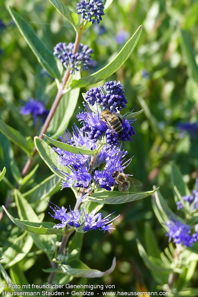 Die Bartblume (Caryopteris clandonensis 'Kew Blue') ist ein kompakter, herb aromatisch duftender Kleinstrauch, der mit seiner spektakulären dunkelblau blühenden Pracht von August bis September jeden Garten verzaubert. Dieser breit aufrecht wachsende Laubgehölz erreicht eine Höhe von bis zu einem Meter und eignet sich perfekt als Insektennährpflanze für kleine Gärten. Die sommergrüne Bartblume 'Kew Blue' liebt sonnige Standorte und gedeiht sowohl auf trockenen als auch frischen Böden. Als echter Blütenschmuck harmoniert sie wunderbar mit Rosen und verwandelt Ihren Garten in ein blaues Blütenmeer, das Bienen und Schmetterlinge magisch anzieht.
