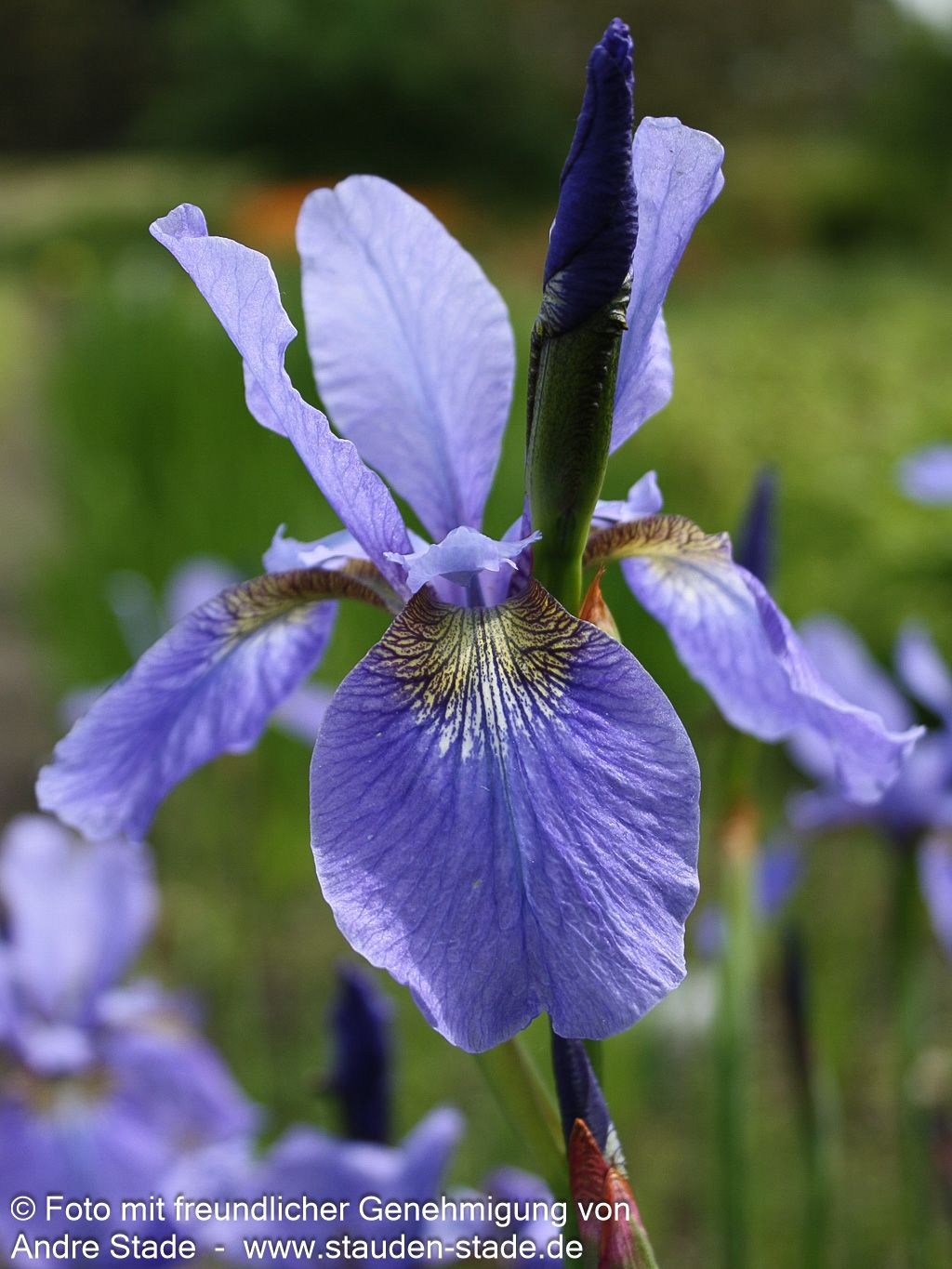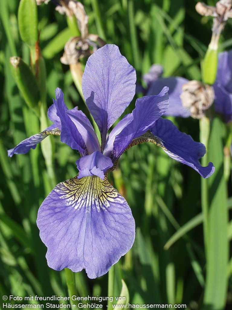 Die Bartlose Wiesen-Schwertlilie (Iris sibirica 'My Love') verzaubert mit ihren eleganten, hell-blauen Blüten von Mai bis Juni und erreicht dabei eine beeindruckende Blütenhöhe von 80 bis 90 cm. Diese prämierte Staude des Jahres 2016 besticht durch ihre aufrecht bis straff aufrechte Wuchsform mit grundständigem Blattschopf und grünem, sommergrünem Laub. Als Sternensorte der deutschen Staudensichtung gedeiht sie optimal an sonnigen Standorten auf feuchten bis frischen Böden. Die winterharte Staude eignet sich hervorragend als Beetstaude und Freiflächenstaude sowie für Schnittzwecke, wobei ein Pflanzabstand von 40 bis 60 cm empfohlen wird.