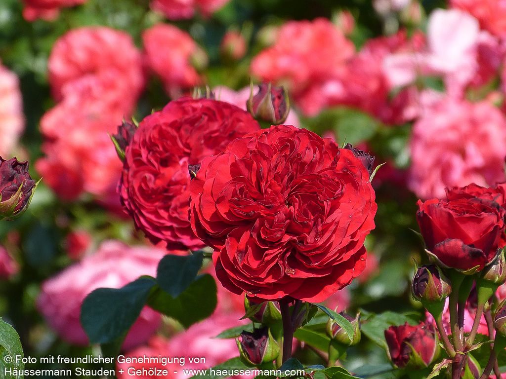 Die Rosa 'Red Leonardo da Vinci' ist eine prächtige Beetrose mit außergewöhnlich dicht gefüllten, johannisbeerroten Blüten. Von Juni bis zum ersten Frost begeistert diese ADR-Rose mit ihren 90-100 Blütenblättern pro Blüte und verströmt dabei einen angenehmen Duft. Der aufrechte Wuchs erreicht eine kompakte Höhe von 40-60 cm, was sie ideal für Beetbepflanzungen macht. Diese robuste Romantica Rose zeichnet sich durch ihre ausgezeichnete Blattgesundheit aus und wurde bereits 2005 mit dem ADR-Prädikat ausgezeichnet. Die reichblühende Sorte überzeugt mit ihrer intensiven purpurroten Farbgebung und gehört zu den besonders widerstandsfähigen roten Rosensorten. Als pflegeleichtes Laubgehölz eignet sich die Red Leonardo da Vinci hervorragend für Gartenneulinge und erfahrene Rosenliebhaber gleichermaßen.