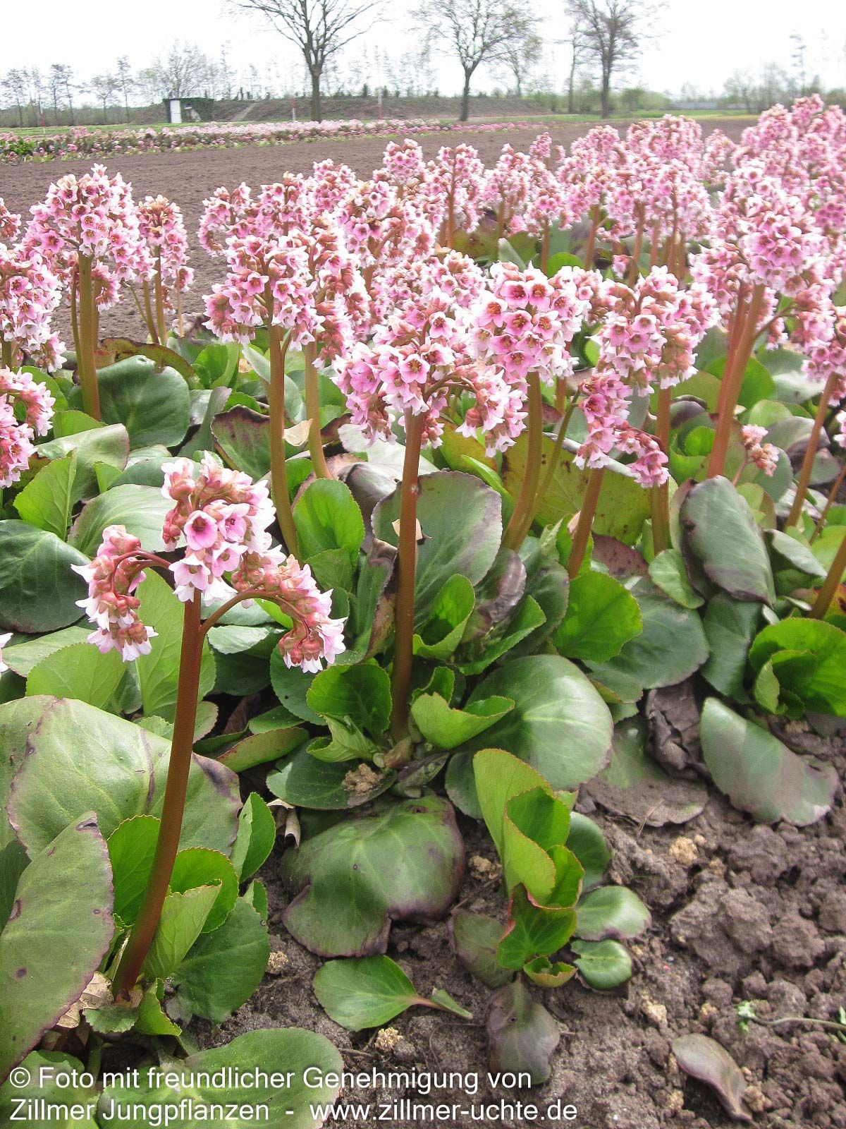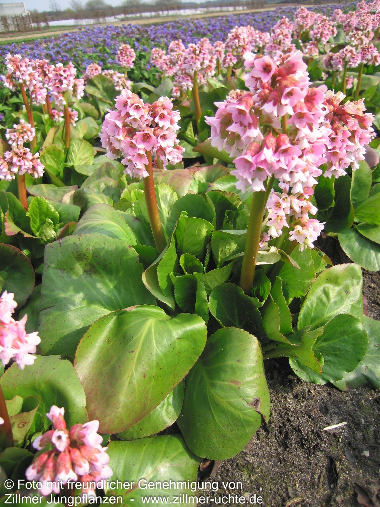 Die Bergenie (Bergenia cordifolia 'Baby Doll') ist eine außergewöhnliche Staude, die als Staude des Jahres 2017 ausgezeichnet wurde und mit ihren zart-rosa Blüten von April bis Mai jeden Garten verzaubert. Diese winterharte Züchtung erreicht eine Blütenhöhe von 20-25 cm und begeistert mit ihren charakteristischen grünen, wintergrünen Blättern, die eine besondere Textur aufweisen und ganzjährig für Struktur im Garten sorgen. Die robuste Staude gedeiht optimal an absonnigen bis halbschattigen Standorten auf frischem Boden und eignet sich hervorragend als Leitstaude oder Gerüststaude. Mit ihrer ausladenden, flächigen Wuchsform und dem rhizombildenden Wuchsverhalten ist sie ideal für Gehölzränder, Freiflächen und Steinanlagen geeignet. Diese vielseitige Insektennährpflanze passt perfekt in den Bauerngarten, eignet sich für die Floristik und ist sogar für Grabstätten geeignet.