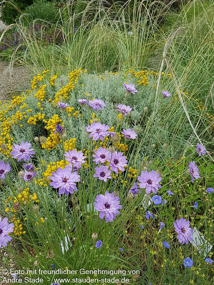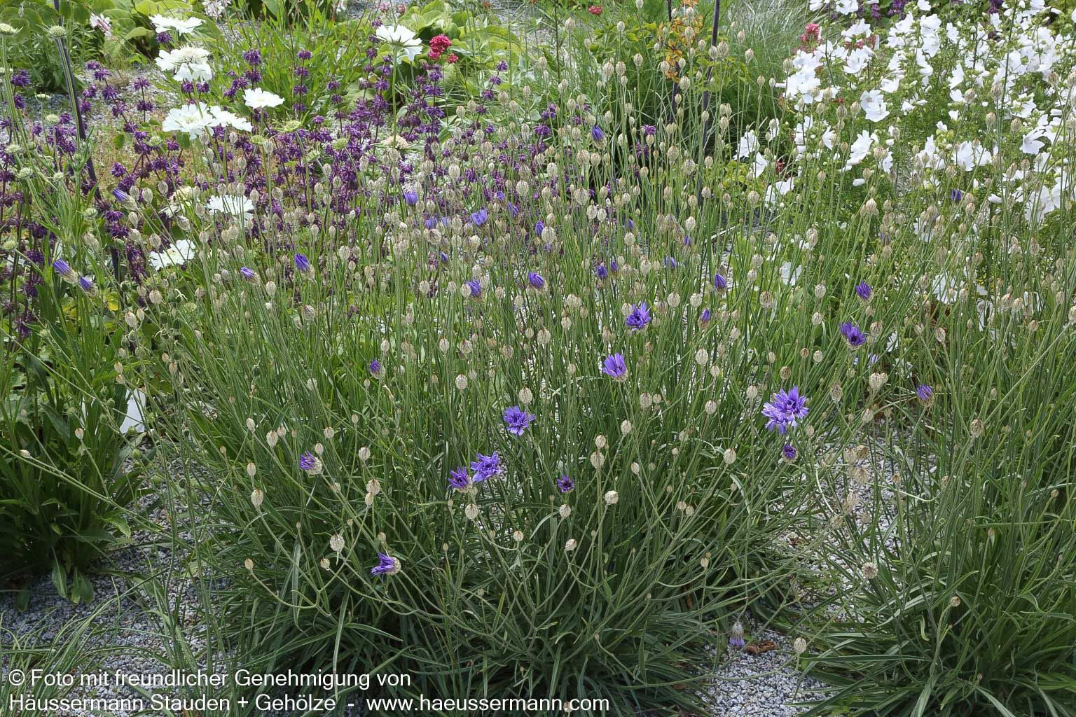 Die Blaublühende Rasselblume (Catananche caerulea) ist eine bezaubernde Staude, die von Juni bis September mit ihren violettblauen, einfachen Blüten in 40-60 cm Höhe begeistert. Diese rosettenartig wachsende Pflanze bildet aufrechte Stängel mit einem grundständigen Blattschopf aus graugrünen, sommergrünen Blättern. Perfekt für sonnige Standorte mit trockenen Böden eignet sie sich hervorragend für Steinanlagen, Felssteppen und Freiflächenpflanzungen. Als Gerüststaude sollten 3-5 Stück pro Gruppe mit einem Pflanzabstand von 30 cm gesetzt werden. Die winterharte Staude ist bis -17°C frostresistent und eignet sich dank ihrer langen Haltbarkeit hervorragend für Schnittzwecke und Floristik.