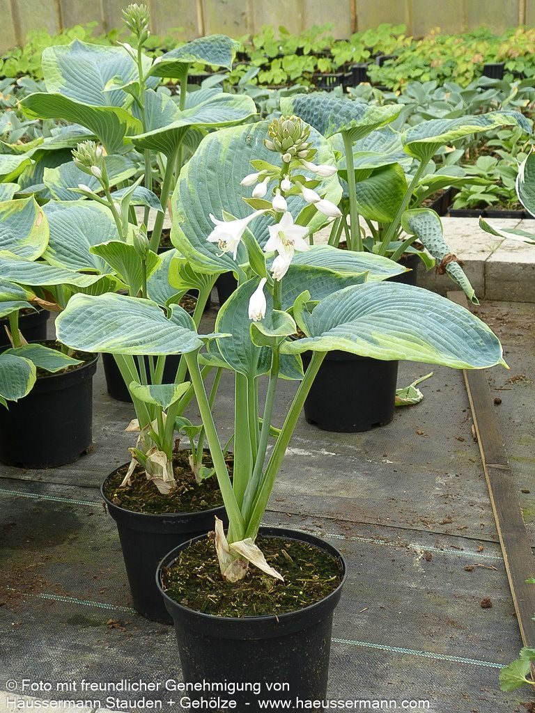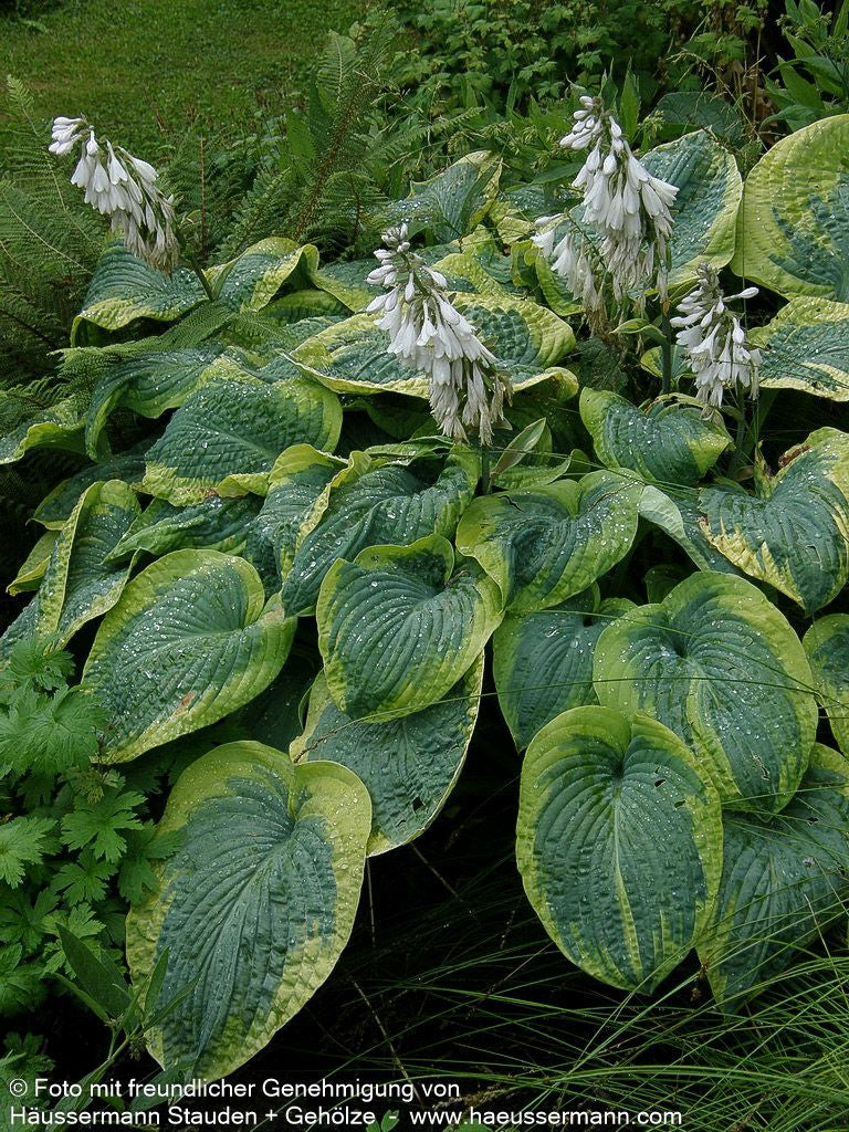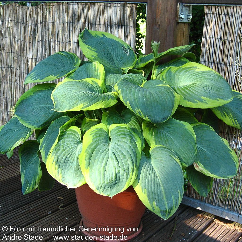 Die Blaue Gelbrand-Funkie (Hosta sieboldiana 'Frances Williams') ist eine prächtige Blattschmuckstaude, die als Staude des Jahres 2009 ausgezeichnet wurde und zu den Sternesorten der deutschen Staudensichtung gehört. Diese imposante Staude begeistert mit ihrer besonderen Blattform und außergewöhnlichen Blattfarbe - die großen, herzförmigen Blätter zeigen eine faszinierende blaugraue Grundfärbung mit leuchtend gelbem Rand. Von Juni bis August erscheinen die zarten hell-violetten Blüten in 70-80 cm Höhe über dem 50-60 cm hohen Blattwerk. Diese starkwüchsige Staude gedeiht optimal an halbschattigen bis schattigen Plätzen mit frischem Boden und ist mit ihrer Winterhärte bis -28°C absolut zuverlässig. Als vielseitige Beetstaude und Gehölzrandstaude eignet sie sich perfekt als Leitstaude und harmoniert wunderbar mit Rhododendron-Pflanzungen.