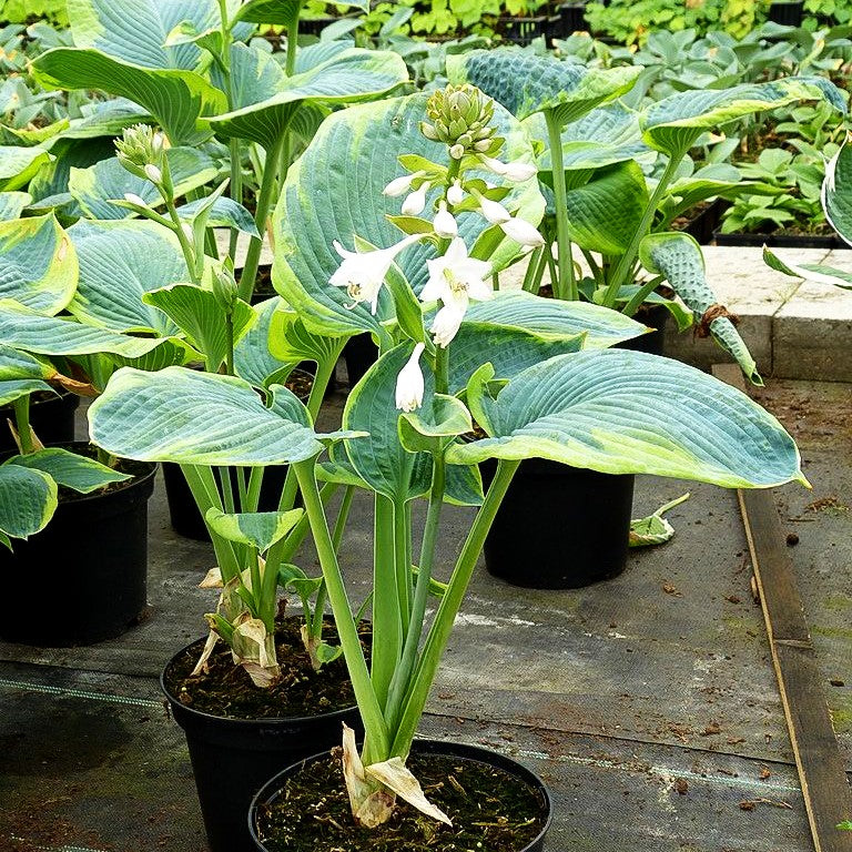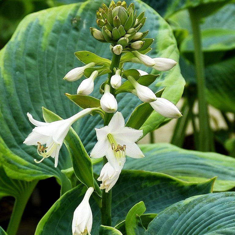 Die Blaue Gelbrand-Funkie (Hosta sieboldiana 'Frances Williams') gehört zu den eindrucksvollsten Stauden für schattige Gartenbereiche. Diese prämierte Sternensorte und Staude des Jahres 2009 begeistert mit ihrer besonderen Blattfarbe: Die großen, herzförmigen Blätter zeigen ein faszinierendes Zusammenspiel aus blaugrauer Mitte und gelbem Rand. Das sommergrüne Blattwerk erreicht eine Höhe von 50-60 cm und entwickelt eine ausladende, bogige Wuchsform.
