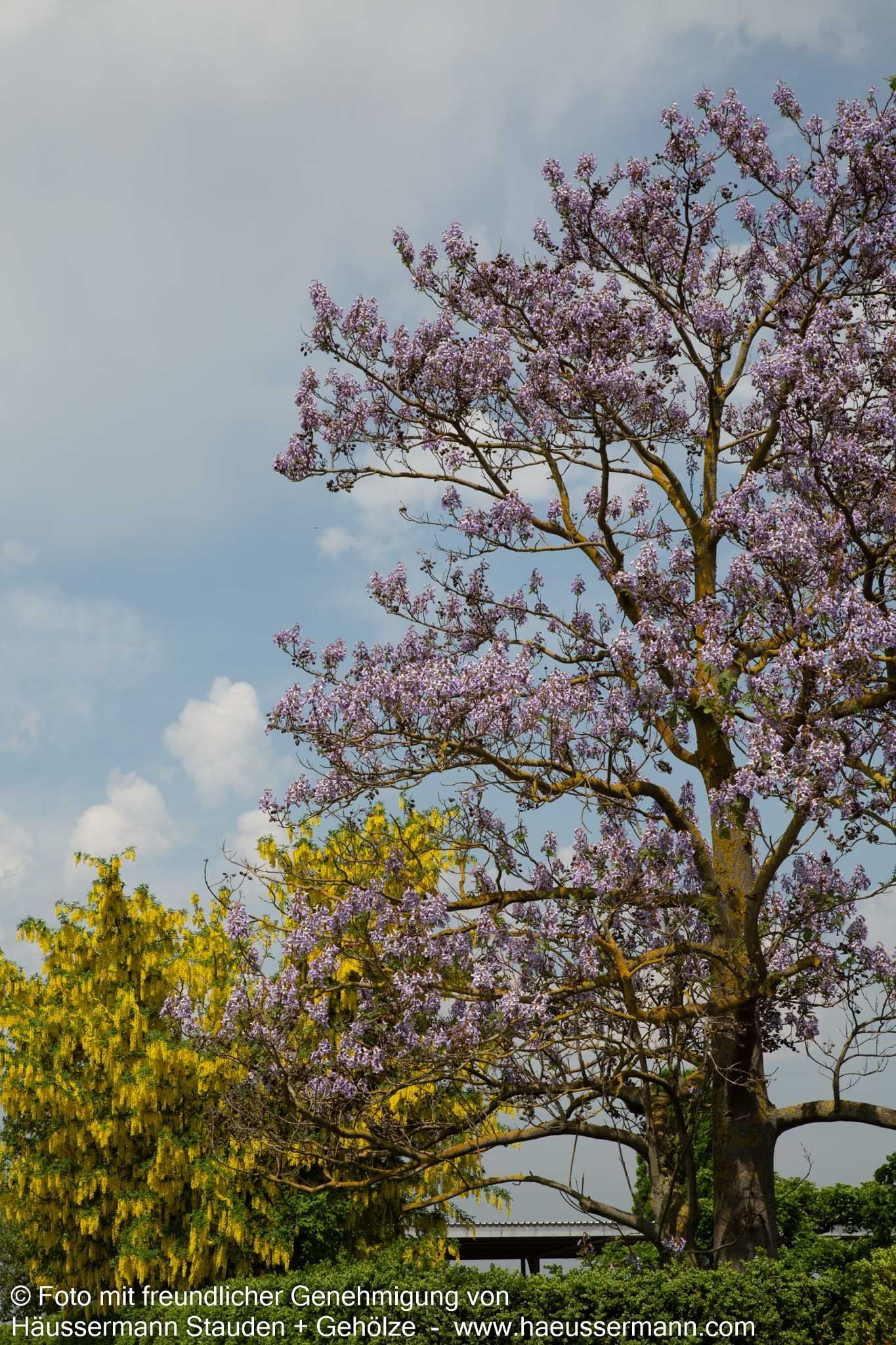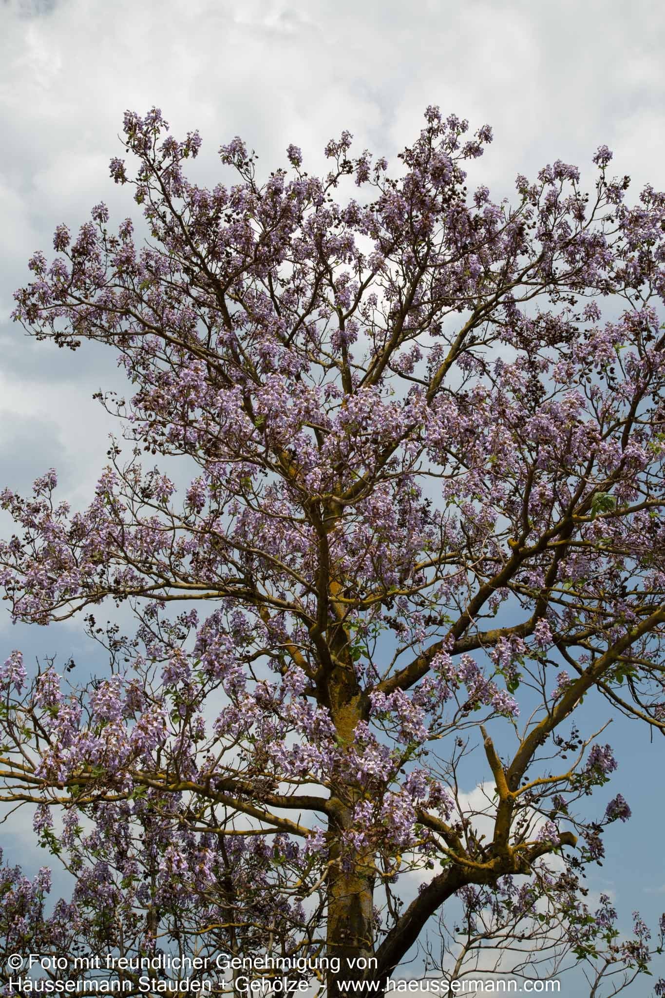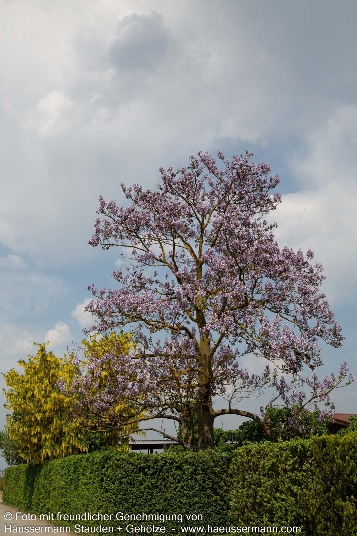Der Blauglockenbaum (Paulownia tomentosa) ist ein spektakulärer mittelgroßer Baum, der mit seiner außergewöhnlichen Blütenpracht und den imposanten Blättern jeden Garten zu einem besonderen Erlebnis macht. Als mittelhoher Baum erreicht er eine Höhe von 12-15 Metern und entwickelt eine charakteristisch breit ausladende Krone. Das besondere Highlight dieses Laubgehölzes sind seine violettblauen Glockenblüten, die bereits im April und Mai vor dem Laubaustrieb erscheinen und einen atemberaubenden Blütenschmuck bieten. Die hellgrünen, herzförmigen Blätter zeigen eine besondere Blattform und können bis zu 40 cm groß werden. Dieser wärmeliebende Baum gedeiht optimal an sonnigen Standorten mit frischen Böden und ist mit seiner Winterhärtezone Z7b eine exotische Bereicherung für milde Lagen.