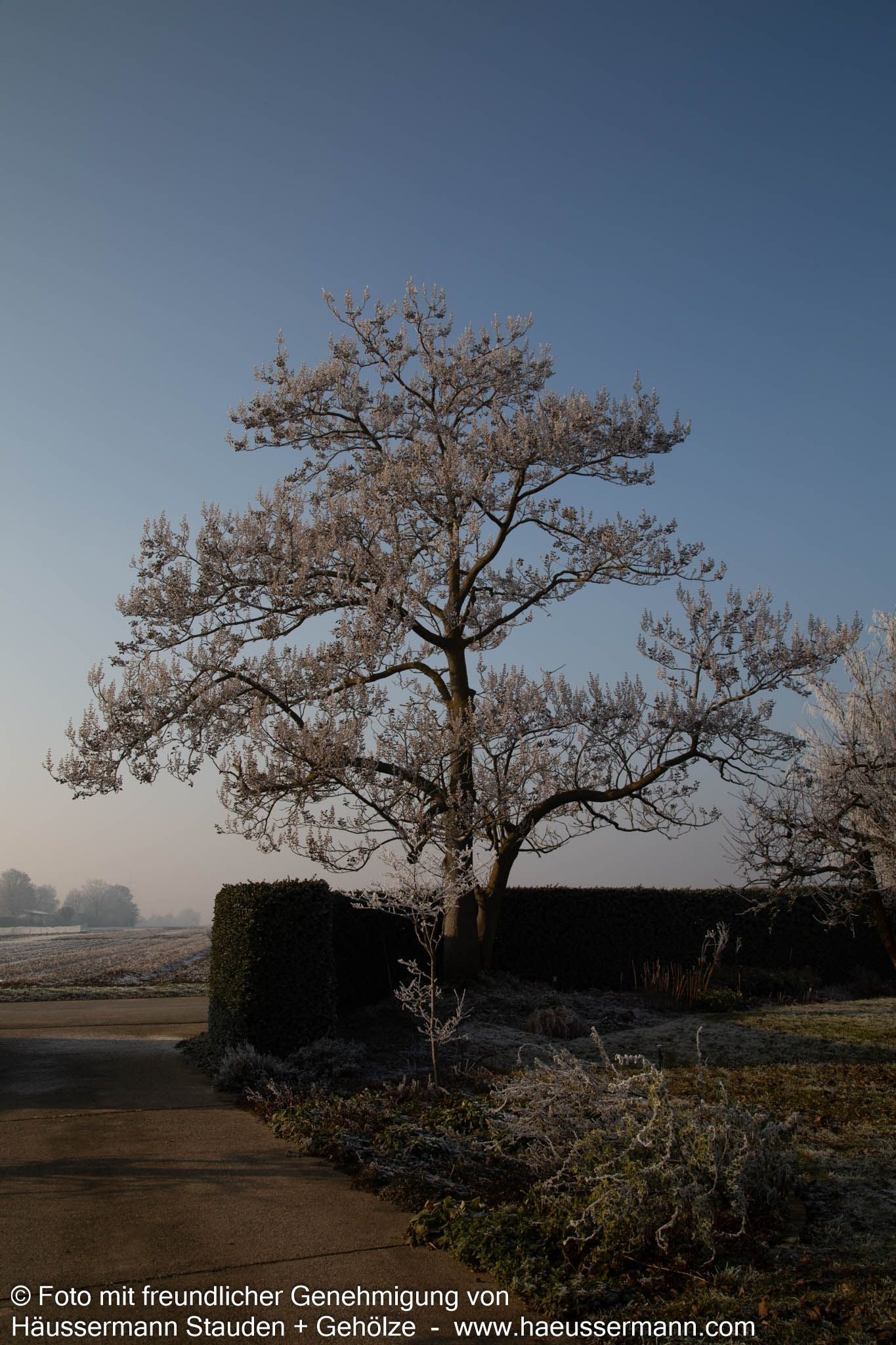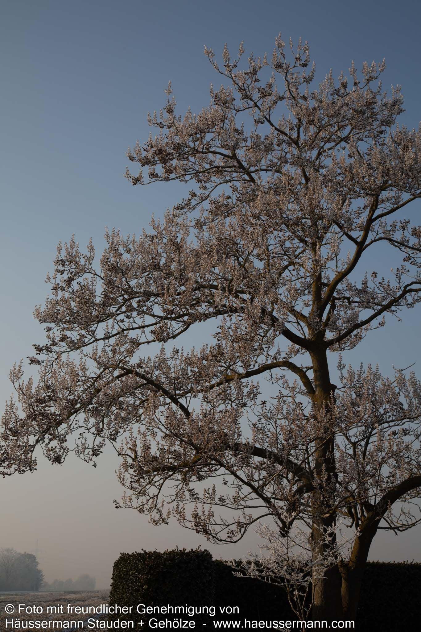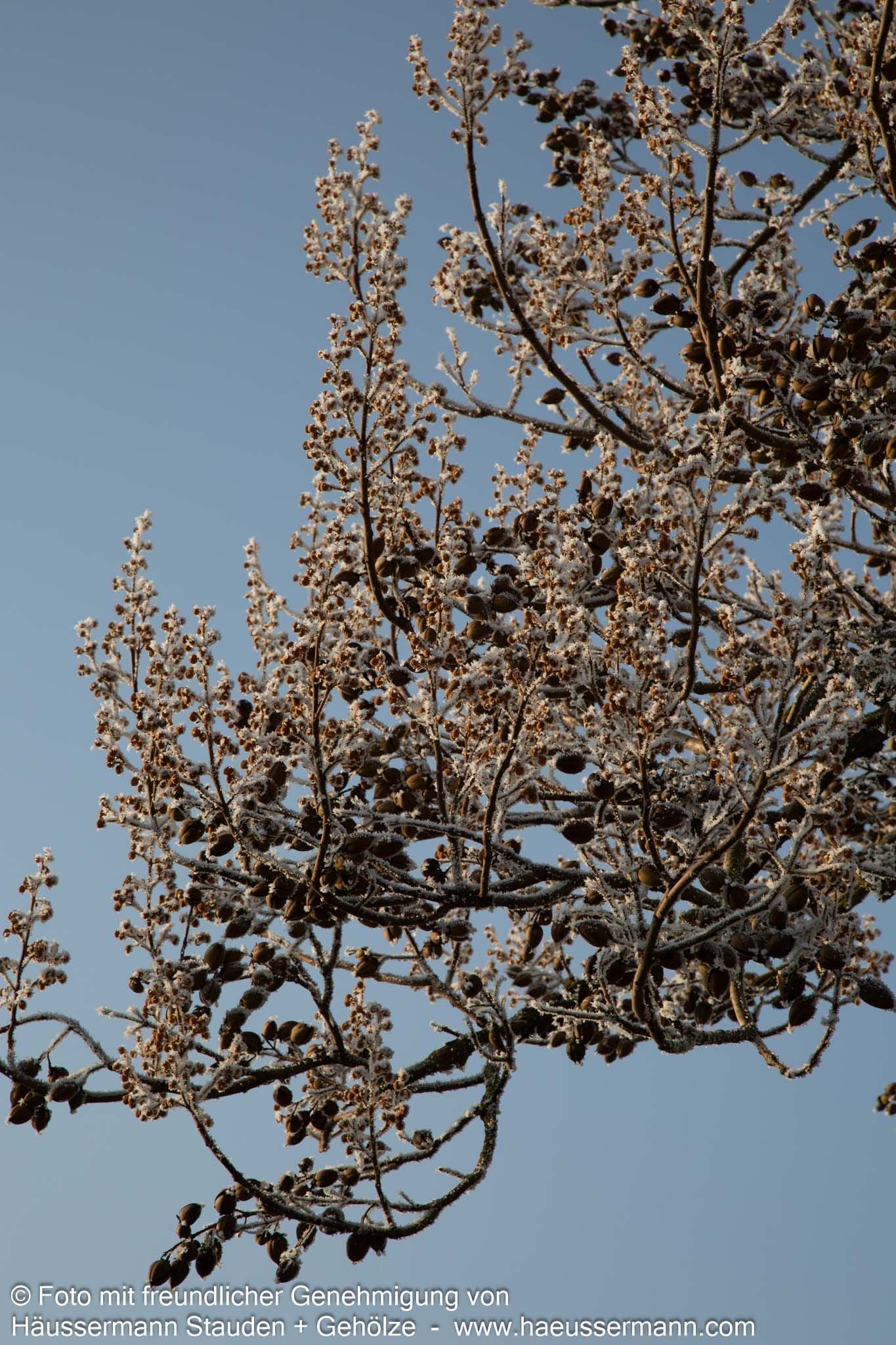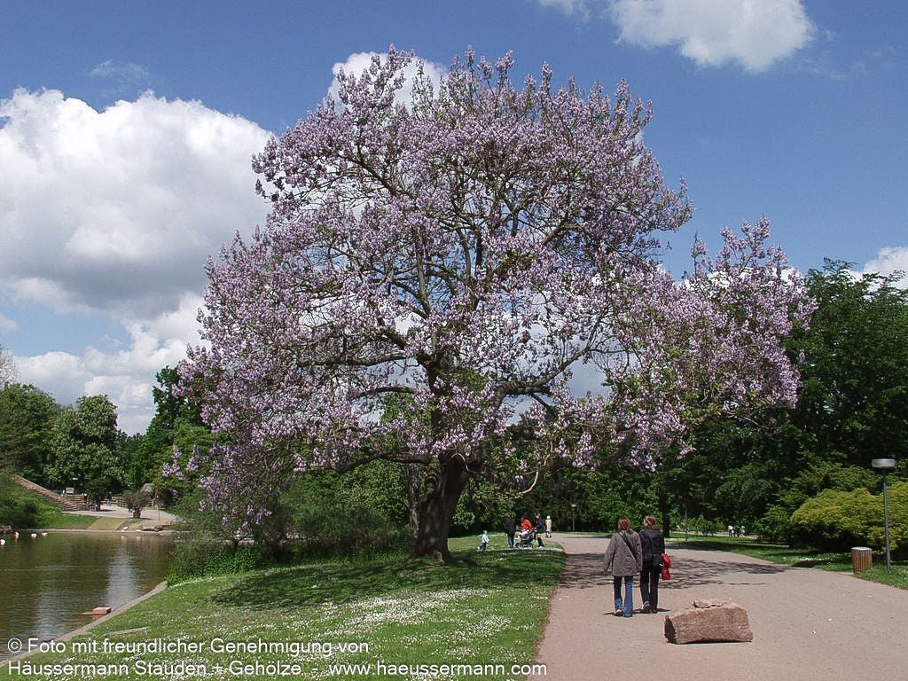 Der Blauglockenbaum (Paulownia tomentosa) ist ein spektakulärer mittelgroßer Baum, der mit seiner außergewöhnlichen Blütenpracht und den imposanten Blättern jeden Garten zu einem besonderen Erlebnis macht. Als mittelhoher Baum erreicht er eine Höhe von 12-15 Metern und entwickelt eine charakteristisch breit ausladende Krone. Das besondere Highlight dieses Laubgehölzes sind seine violettblauen Glockenblüten, die bereits im April und Mai vor dem Laubaustrieb erscheinen und einen atemberaubenden Blütenschmuck bieten. Die hellgrünen, herzförmigen Blätter zeigen eine besondere Blattform und können bis zu 40 cm groß werden. Dieser wärmeliebende Baum gedeiht optimal an sonnigen Standorten mit frischen Böden und ist mit seiner Winterhärtezone Z7b eine exotische Bereicherung für milde Lagen.