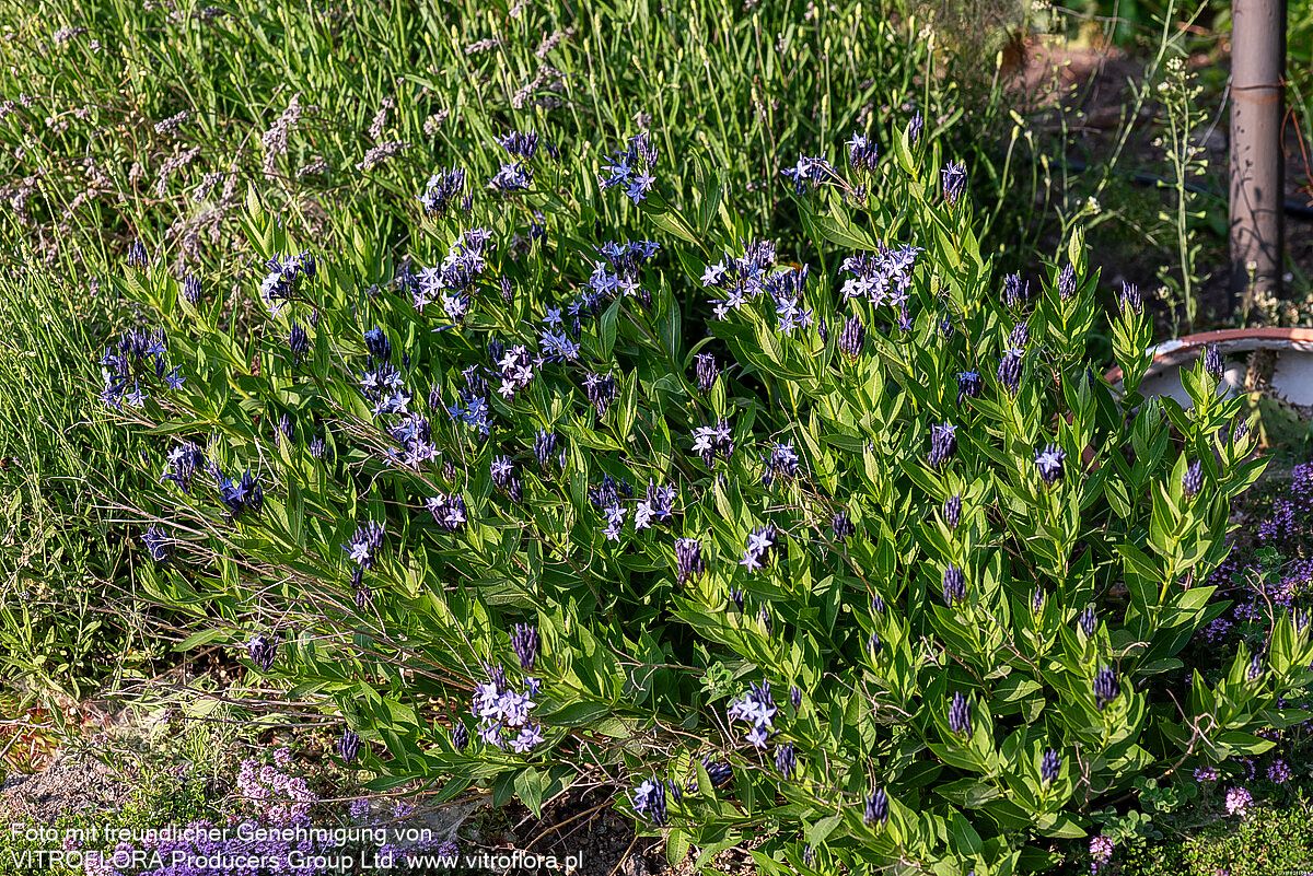 Der Blausternbusch (Amsonia tabernaemontana 'Blue Ice') verzaubert von Mai bis Juli mit seinen reichblühenden, violettblauen Blüten und wird 40-60 cm hoch. Diese außergewöhnliche Staude begeistert nicht nur mit ihrer violettblauen Blütenpracht, sondern auch mit dunkelgrünen Blättern, die sich im Herbst in ein leuchtendes Gelb verwandeln. Als robuste Freiflächenstaude gedeiht sie optimal an sonnigen bis absonnigen Plätzen auf frischen bis trockenen Böden. Diese sommergrüne Züchtung ist bis -17°C winterhart und eignet sich als Leitstaude hervorragend für naturnahe Gärten mit einem Pflanzabstand von 30-50 cm.