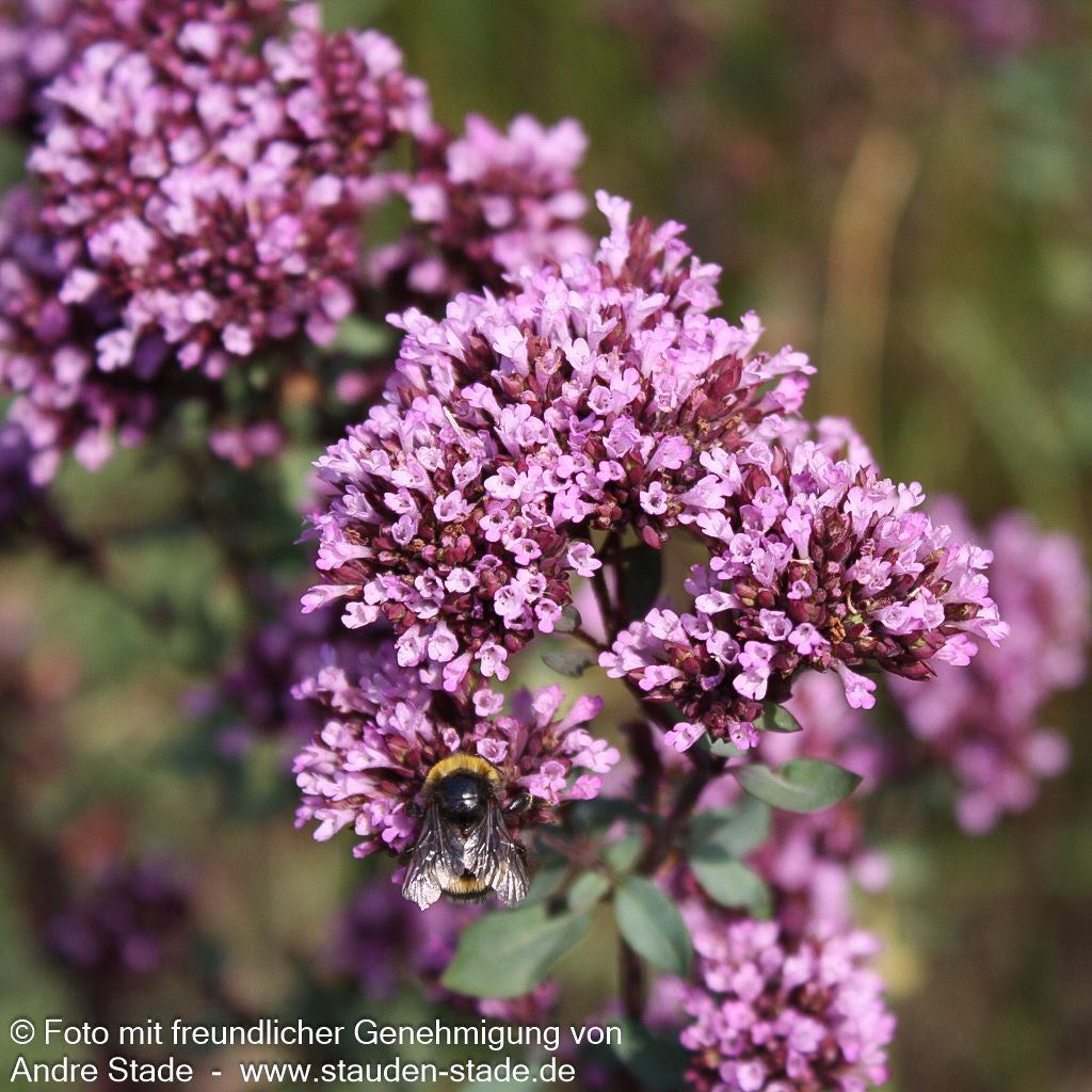 Der Blüten-Dost (Origanum laevigatum 'Herrenhausen') ist eine außergewöhnliche Staude, die mit ihren hell-purpurrosa Blüten von Juli bis September jeden Garten verzaubert. Diese preisgekrönte Sternensorte erreicht eine Wuchshöhe von 40-60 cm und entwickelt einen buschigen, dichtbuschigen Habitus. Das graugrüne Laub bildet einen wunderschönen Kontrast zu den dunkel-purpurrosa Blüten, die einen betörenden Blatt- oder Blütenduft verströmen. Diese robuste Insektennährpflanze gedeiht hervorragend an sonnigen Standorten mit trockenen Böden und ist ideal für den Bauerngarten oder die extensive Dachbegrünung geeignet. Mit ihrer Winterhärte bis -22°C und dem empfohlenen Pflanzabstand von 30 cm ist sie eine pflegeleichte Bereicherung für jeden Gartenliebhaber.