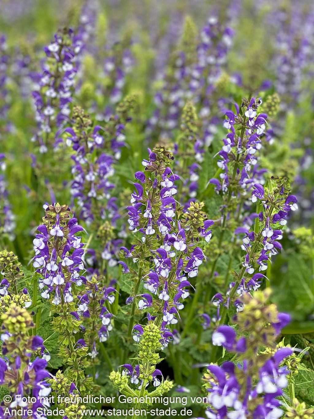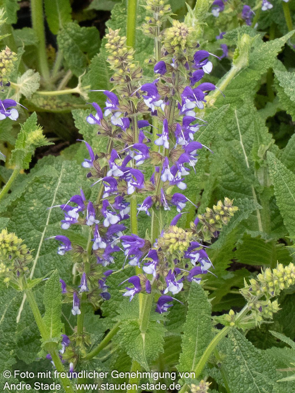 Der Blüten-Salbei (Salvia pratensis Color Spires 'Azure Snow') begeistert von Mai bis Juni mit seinen spektakulären tiefvioletten Blüten, die elegant mit weißen Akzenten durchzogen sind. Diese ausgezeichnete Sorte wurde nicht umsonst zur Staude des Jahres 2003 gekürt und erreicht eine beeindruckende Wuchshöhe von 60 cm. Mit ihren frischgrünen, sommergrünen Blättern setzt sie auch außerhalb der Blütezeit attraktive Akzente in sonnigen Freiflächen. Diese robuste Staude ist perfekt für naturnahe Gärten geeignet und lockt mit ihren duftenden Blüten zahlreiche Bienen und Schmetterlinge an.