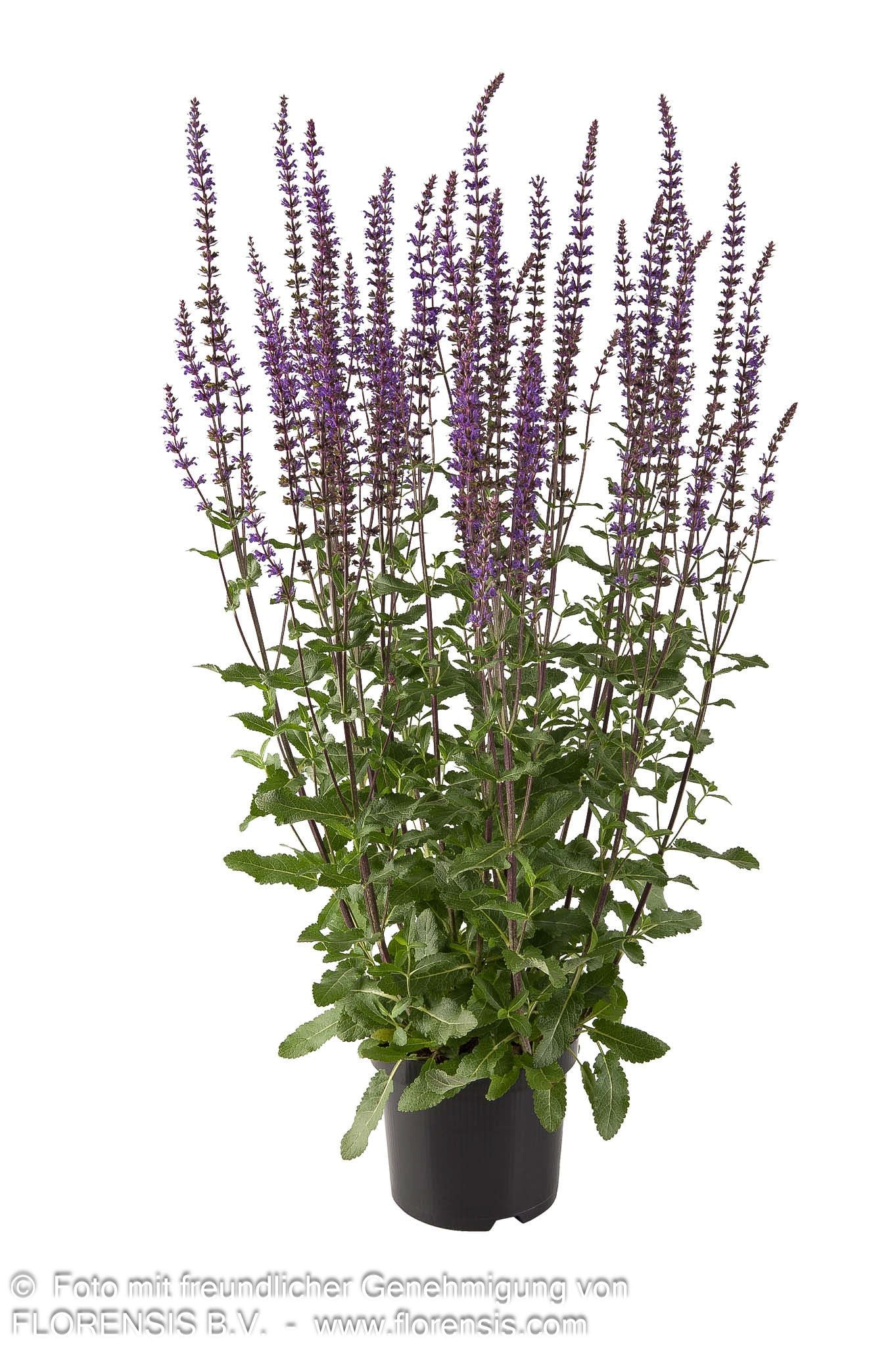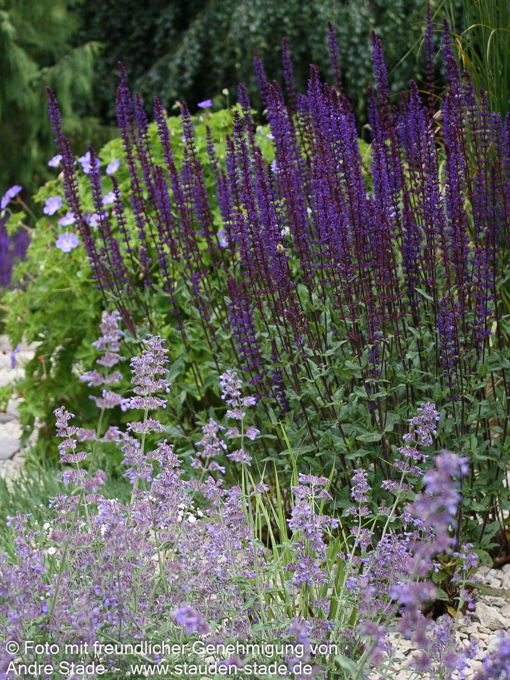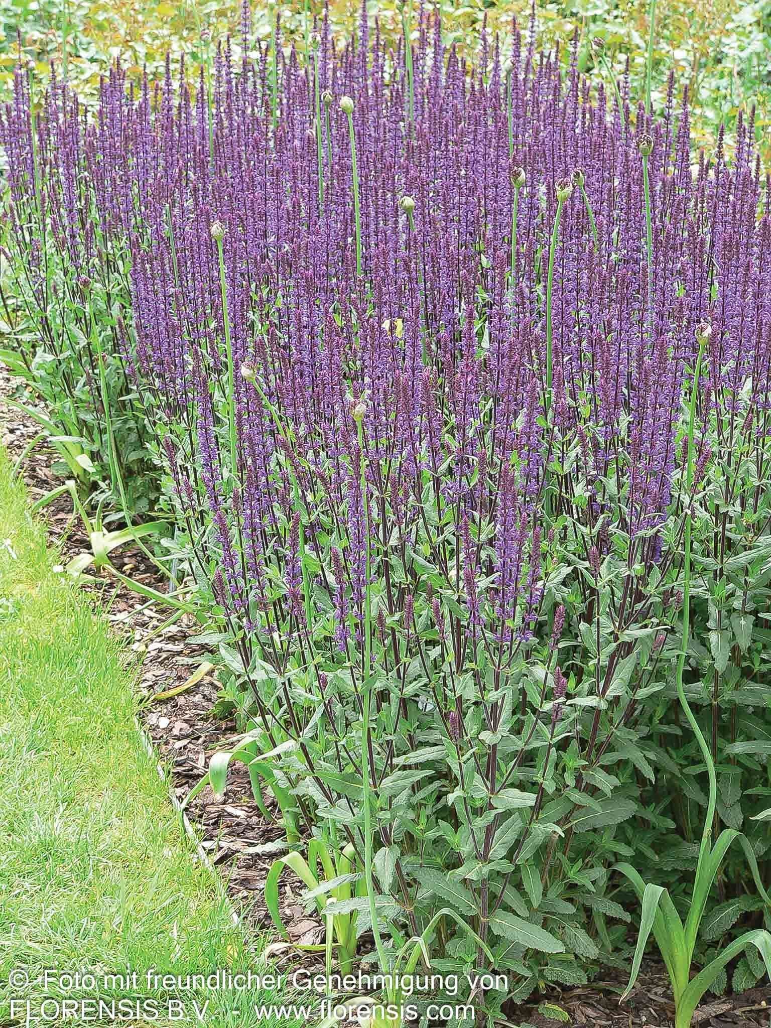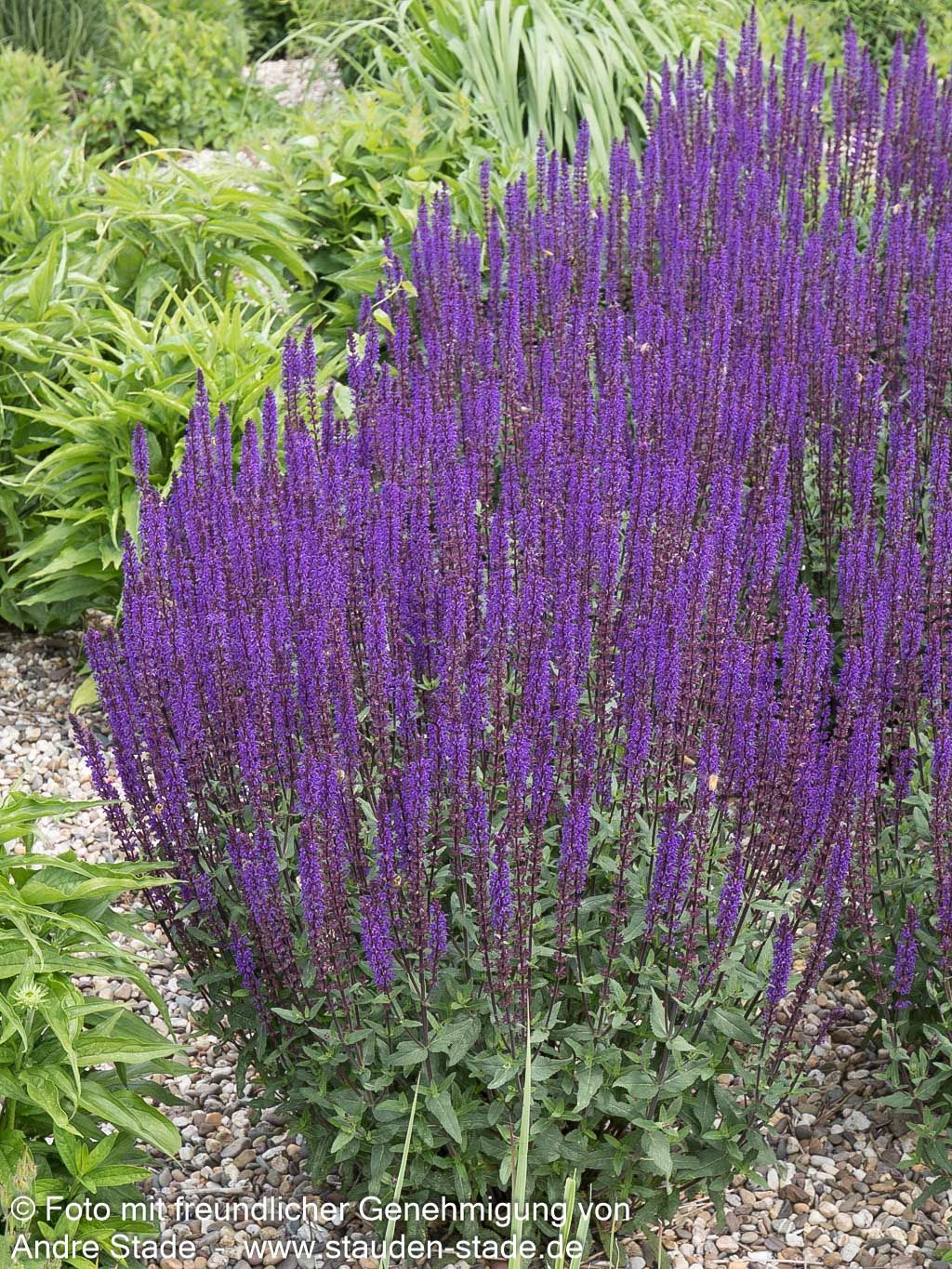 Der Blüten-Salbei (Salvia nemorosa 'Caradonna') ist eine außergewöhnliche Staude, die als Staude des Jahres 2003 ausgezeichnet wurde und zu den begehrten Sternesorten der deutschen Staudensichtung gehört. Diese prachtvolle Staude begeistert von Mai bis September mit ihren intensiv dunkel-violetten, einfachen Blüten, die sich auf dunklen Stielen 40-50 cm hoch erheben. Die tiefgrünen, sommergrünen Blätter verströmen einen angenehmen Blatt- und Blütenduft und bilden einen wunderbaren Kontrast zu der leuchtenden Blütenpracht. Diese robuste Insektennährpflanze gedeiht optimal an sonnigen Standorten auf frischen bis trockenen Böden und ist mit ihrer Winterhärte bis -28°C bestens für unser Klima geeignet. Als vielseitige Beetstaude und kleinflächiger Bodendecker mit straff aufrechter und buschiger Wuchsform setzt sie sowohl als Gerüststaude als auch als Füllstaude in Gruppen von 10-20 Stück wirkungsvolle Akzente.