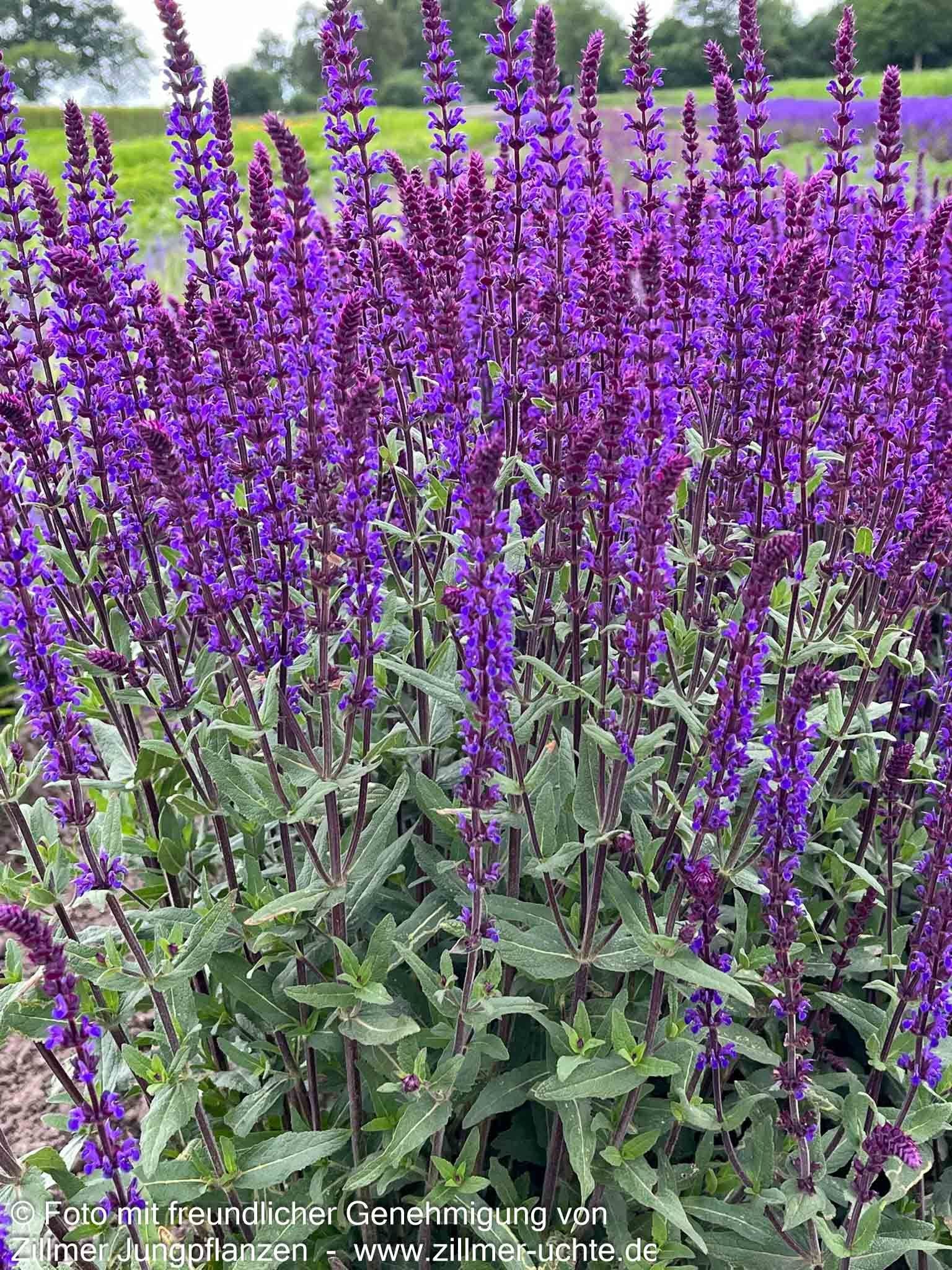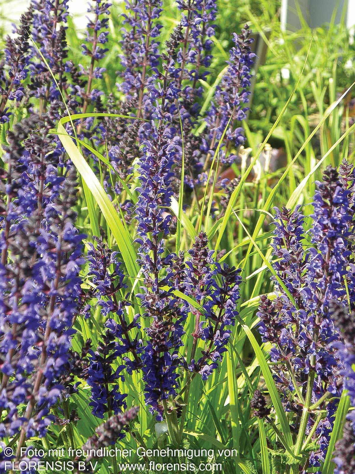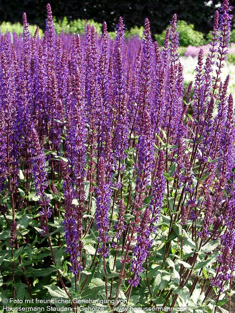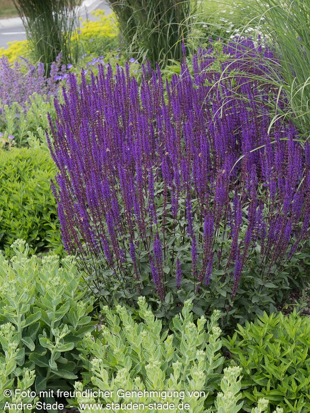 Der Blüten-Salbei (Salvia nemorosa 'Caradonna') ist eine außergewöhnliche Staude, die als Staude des Jahres 2003 ausgezeichnet wurde und zu den begehrten Sternesorten der deutschen Staudensichtung gehört. Diese prachtvolle Staude begeistert von Mai bis September mit ihren intensiv dunkel-violetten, einfachen Blüten, die sich auf dunklen Stielen 40-50 cm hoch erheben. Die tiefgrünen, sommergrünen Blätter verströmen einen angenehmen Blatt- und Blütenduft und bilden einen wunderbaren Kontrast zu der leuchtenden Blütenpracht. Diese robuste Insektennährpflanze gedeiht optimal an sonnigen Standorten auf frischen bis trockenen Böden und ist mit ihrer Winterhärte bis -28°C bestens für unser Klima geeignet. Als vielseitige Beetstaude und kleinflächiger Bodendecker mit straff aufrechter und buschiger Wuchsform setzt sie sowohl als Gerüststaude als auch als Füllstaude in Gruppen von 10-20 Stück wirkungsvolle Akzente.