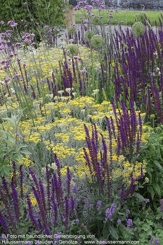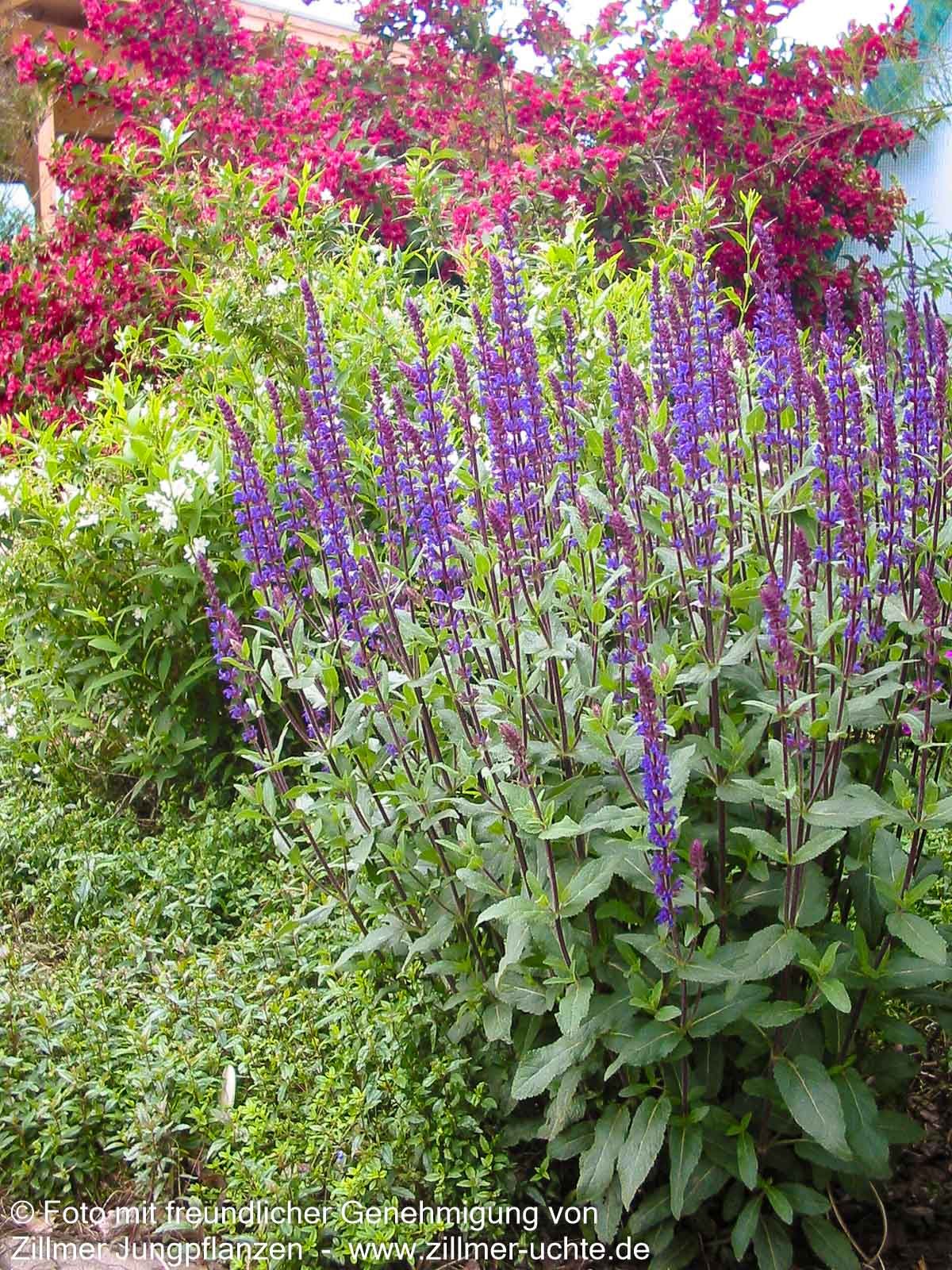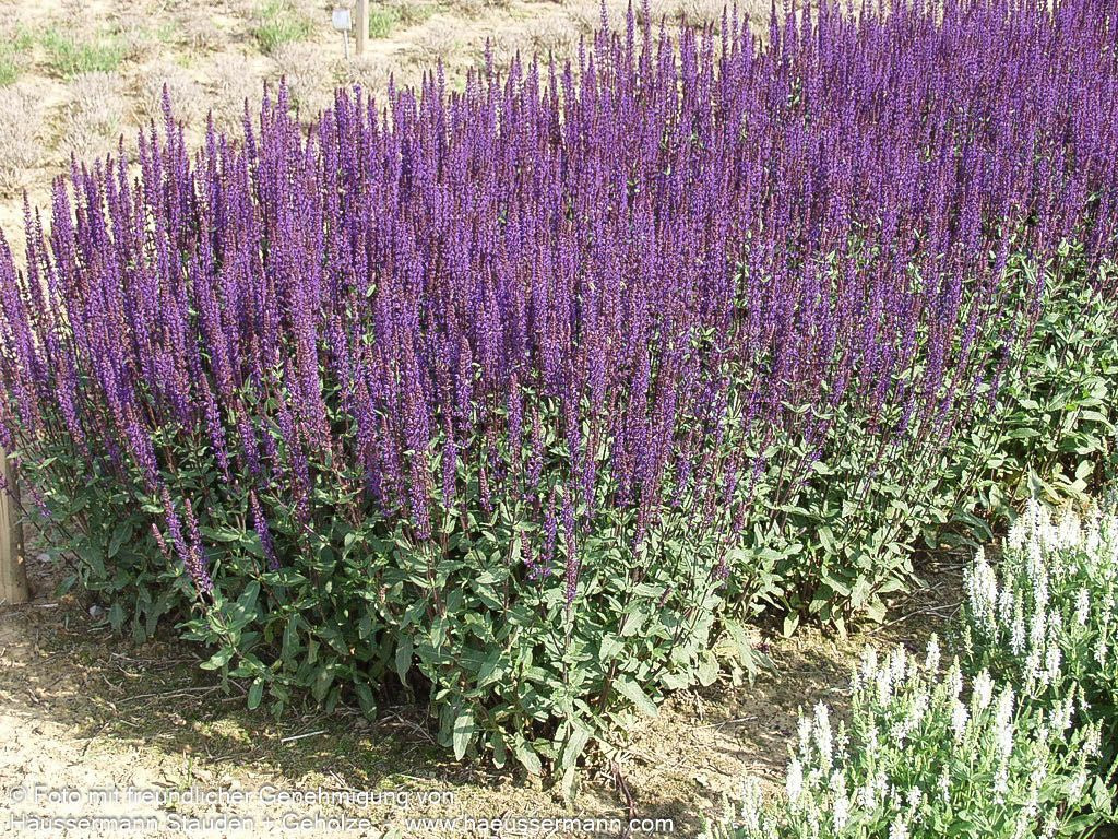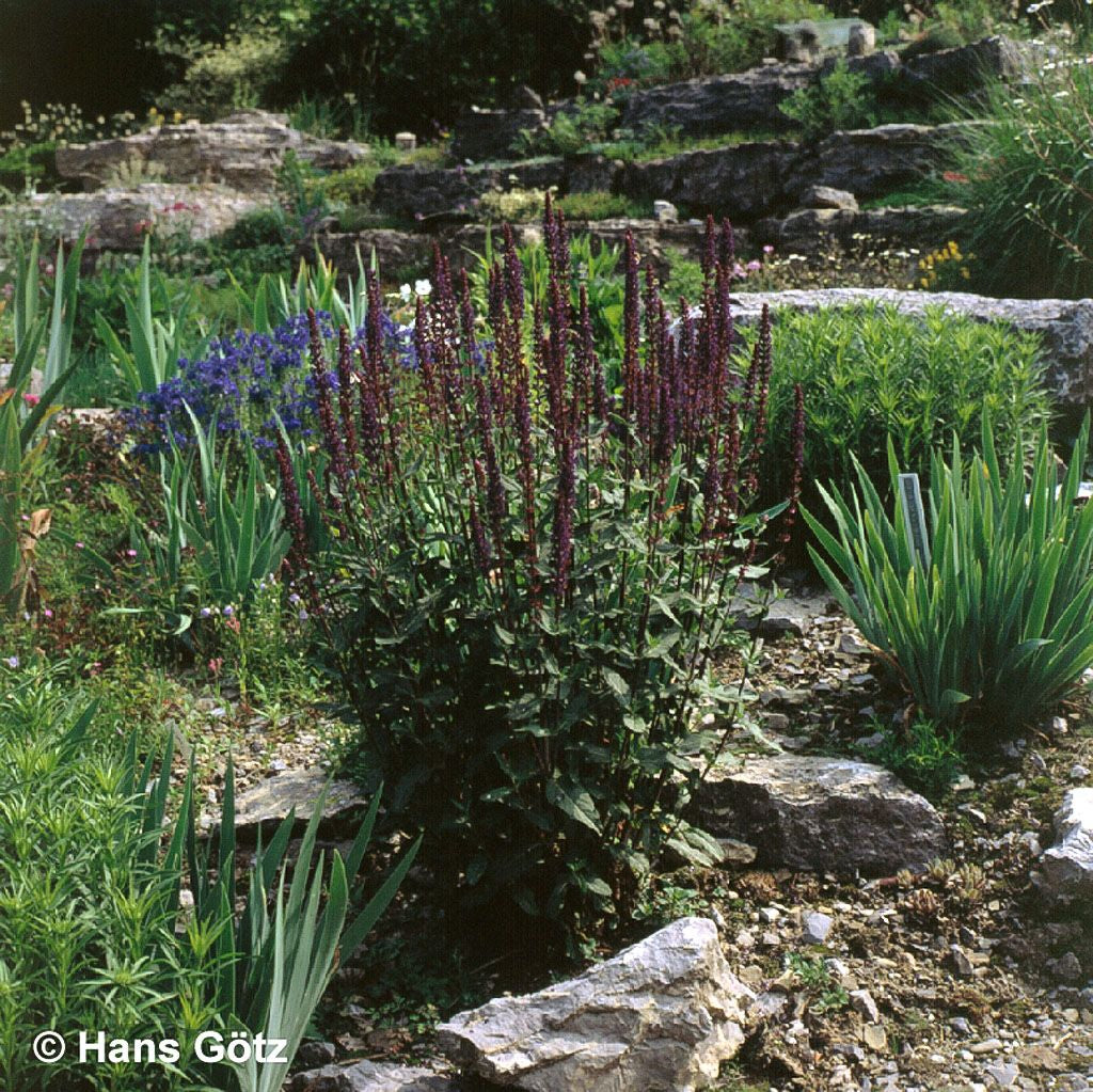 Der Blüten-Salbei (Salvia nemorosa 'Caradonna') ist eine außergewöhnliche Staude, die als Staude des Jahres 2003 ausgezeichnet wurde und zu den begehrten Sternesorten der deutschen Staudensichtung gehört. Diese prachtvolle Staude begeistert von Mai bis September mit ihren intensiv dunkel-violetten, einfachen Blüten, die sich auf dunklen Stielen 40-50 cm hoch erheben. Die tiefgrünen, sommergrünen Blätter verströmen einen angenehmen Blatt- und Blütenduft und bilden einen wunderbaren Kontrast zu der leuchtenden Blütenpracht. Diese robuste Insektennährpflanze gedeiht optimal an sonnigen Standorten auf frischen bis trockenen Böden und ist mit ihrer Winterhärte bis -28°C bestens für unser Klima geeignet. Als vielseitige Beetstaude und kleinflächiger Bodendecker mit straff aufrechter und buschiger Wuchsform setzt sie sowohl als Gerüststaude als auch als Füllstaude in Gruppen von 10-20 Stück wirkungsvolle Akzente.