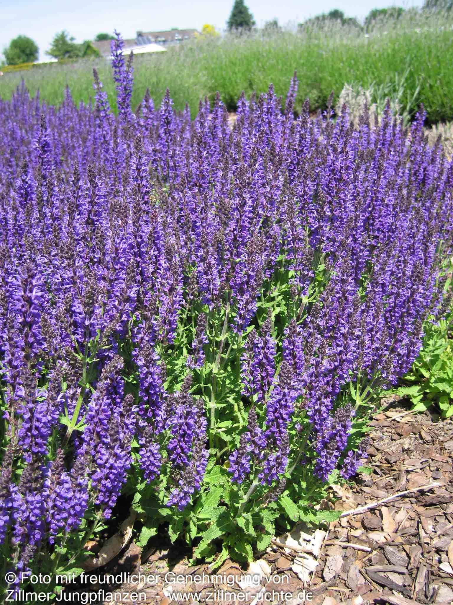 Der Blüten-Salbei (Salvia nemorosa 'Marcus') verzaubert mit seinen dunkel-violetten Blüten von Mai bis September und wurde nicht umsonst als Staude des Jahres 2003 ausgezeichnet. Diese prämierte Sternensorte erreicht eine Blütenhöhe von 20-30 cm und entwickelt sich buschig bis kissenartig. Als wertvolle Insektennährpflanze mit bezauberndem Blatt- und Blütenduft gedeiht sie optimal an sonnigen Standorten mit frischen bis trockenen Böden. Diese winterharte Staude eignet sich hervorragend als kleinflächiger Bodendecker und sollte mit einem Pflanzabstand von 30-40 cm als Füllstaude in Gruppen gepflanzt werden.