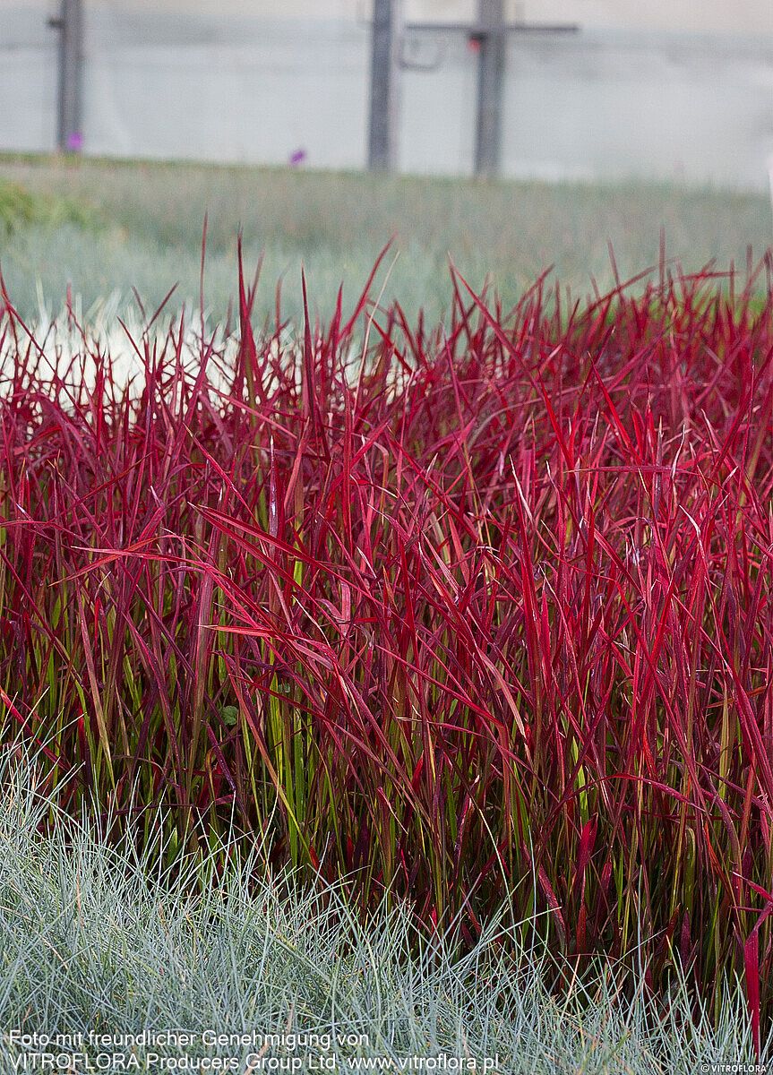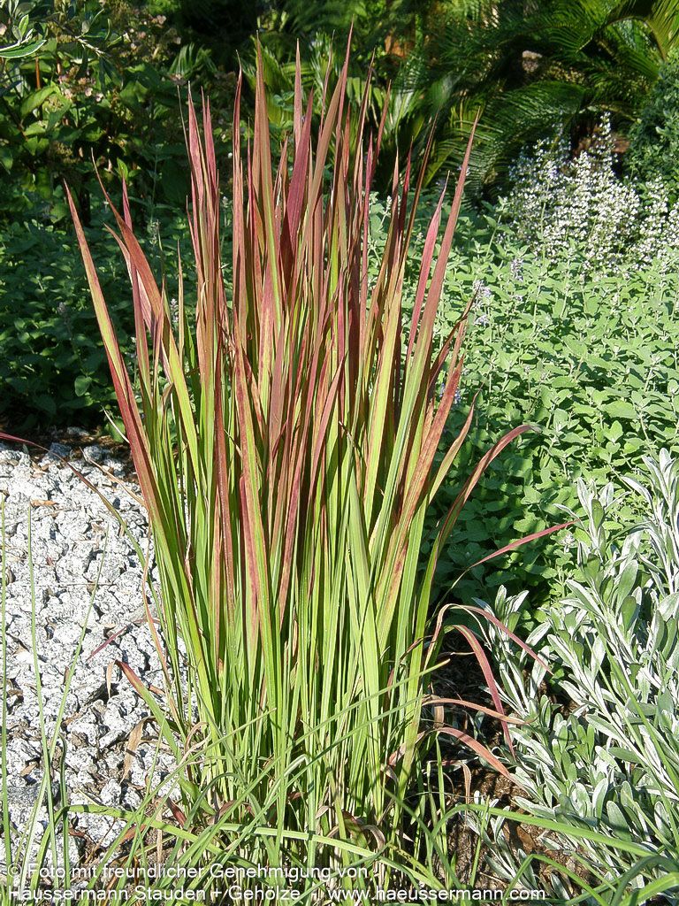 Das Blutgras (Imperata cylindrica var. koenigii 'Red Baron') ist ein spektakuläres Ziergras, das mit seinen braunroten bis grünen Blättern jeden Garten in ein Farbfeuerwerk verwandelt. Diese außergewöhnliche Grasart besticht durch ihre besondere Blattform und Textur und erreicht eine kompakte Höhe von 30-40 cm. Das wintergrüne Laub behält seine intensive Rotfärbung das ganze Jahr über und sorgt für dramatische Akzente im Beet. Als Beetstaude bevorzugt das Blutgras einen sonnigen Standort mit frischem Boden. Die kleinen, bräunlichroten Blüten erscheinen von Juni bis Juli und setzen dezente Akzente. Mit seiner aufrecht bis locker aufrechten Wuchsform und dem rhizombildenden Wuchsverhalten ist dieses eindrucksvolle Gras perfekt als Leitstaude geeignet und winterhart bis -11°C.