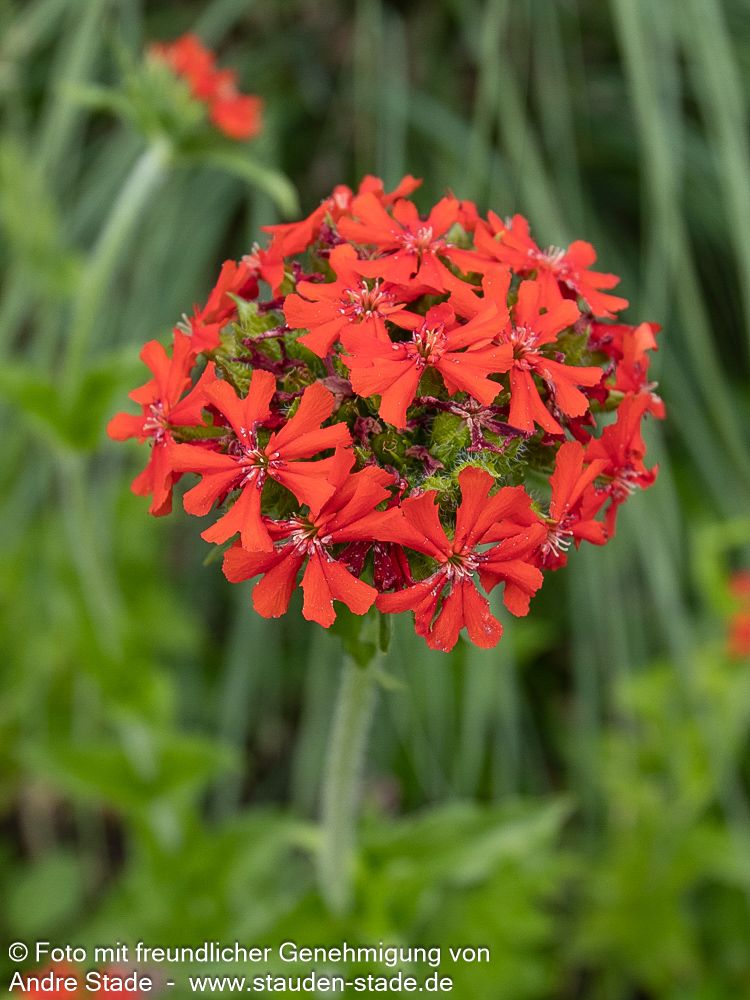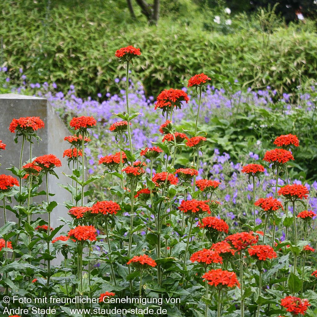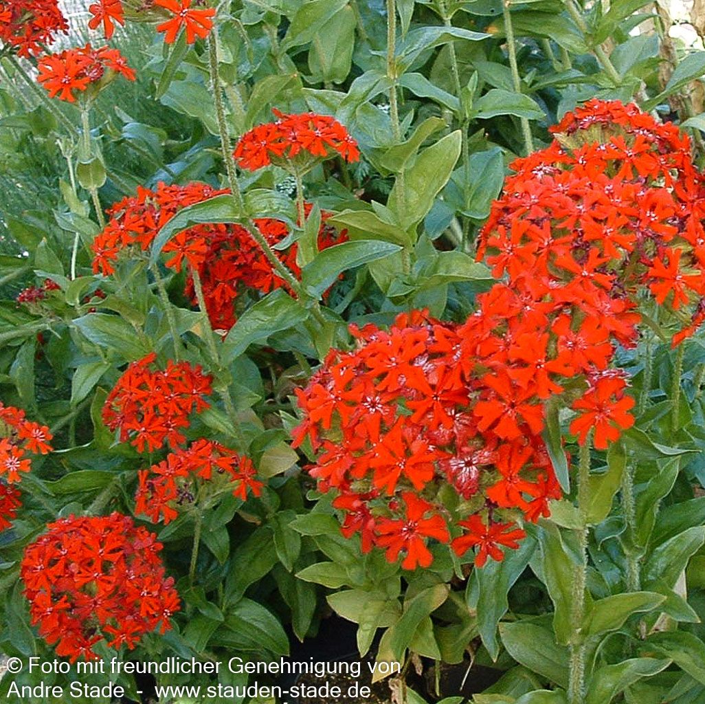 Die Brennende Liebe (Lychnis chalcedonica) ist eine beeindruckende Staude, die mit ihren leuchtend-roten, einfachen Blüten von Juni bis Juli jeden Garten zum Strahlen bringt. Diese winterharte Gerüststaude erreicht eine Blütenhöhe von 60 bis 100 cm und bildet mit ihren aufrechten Stängeln und dem grundständigen Blattschopf aus tief-grünen, wintergrünen Blättern einen wunderbaren Blickfang. Die robuste Staude gedeiht optimal an sonnigen bis halbschattigen Standorten auf frischen Böden und ist mit ihrer Winterhärtezone Z4 bis -34°C äußerst frostbeständig. Besonders im Bauerngarten entfaltet sie ihre nostalgische Wirkung und eignet sich hervorragend für Schnittzwecke. Als vielseitige Freiflächenstaude mit beetstaudenartigem Charakter sollte sie in Tuffs von 3-5 Stück mit einem Pflanzabstand von 20 cm gesetzt werden.