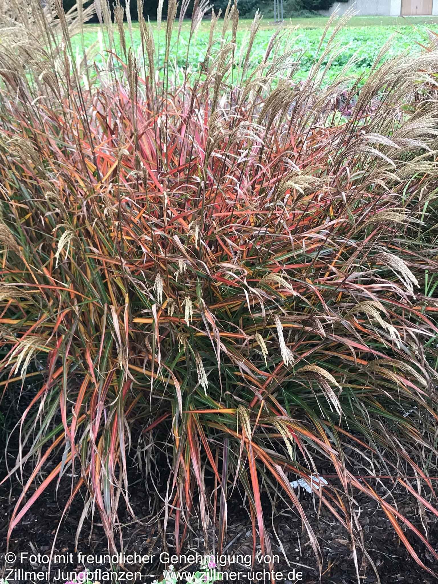 Das Chinaschilf (Miscanthus sinensis 'Dronning Ingrid') ist ein beeindruckendes Ziergras, das mit seinem straff aufrechten Wuchs und einer Höhe von 100-120 cm jeden Garten bereichert. Die spektakulären dunkelroten Blüten verwandeln sich im Verlauf der Saison elegant zu weißen Blütenständen und schaffen ein faszinierendes Farbspiel. Besonders reizvoll sind die relativ breiten, olivgrünen Blätter mit ihrem rötlichen Schimmer, der sich zum Herbst hin intensiviert und für eine prachtvolle Herbstfärbung sorgt. Dieses robuste Gras gedeiht optimal an einem sonnigen Standort und ist die perfekte Wahl für moderne Gartengestaltung, Staudenbeete oder als attraktiver Solitär. Mit seinen roten Blütentönen setzt es vom Sommer bis in den Herbst hinein leuchtende Akzente.