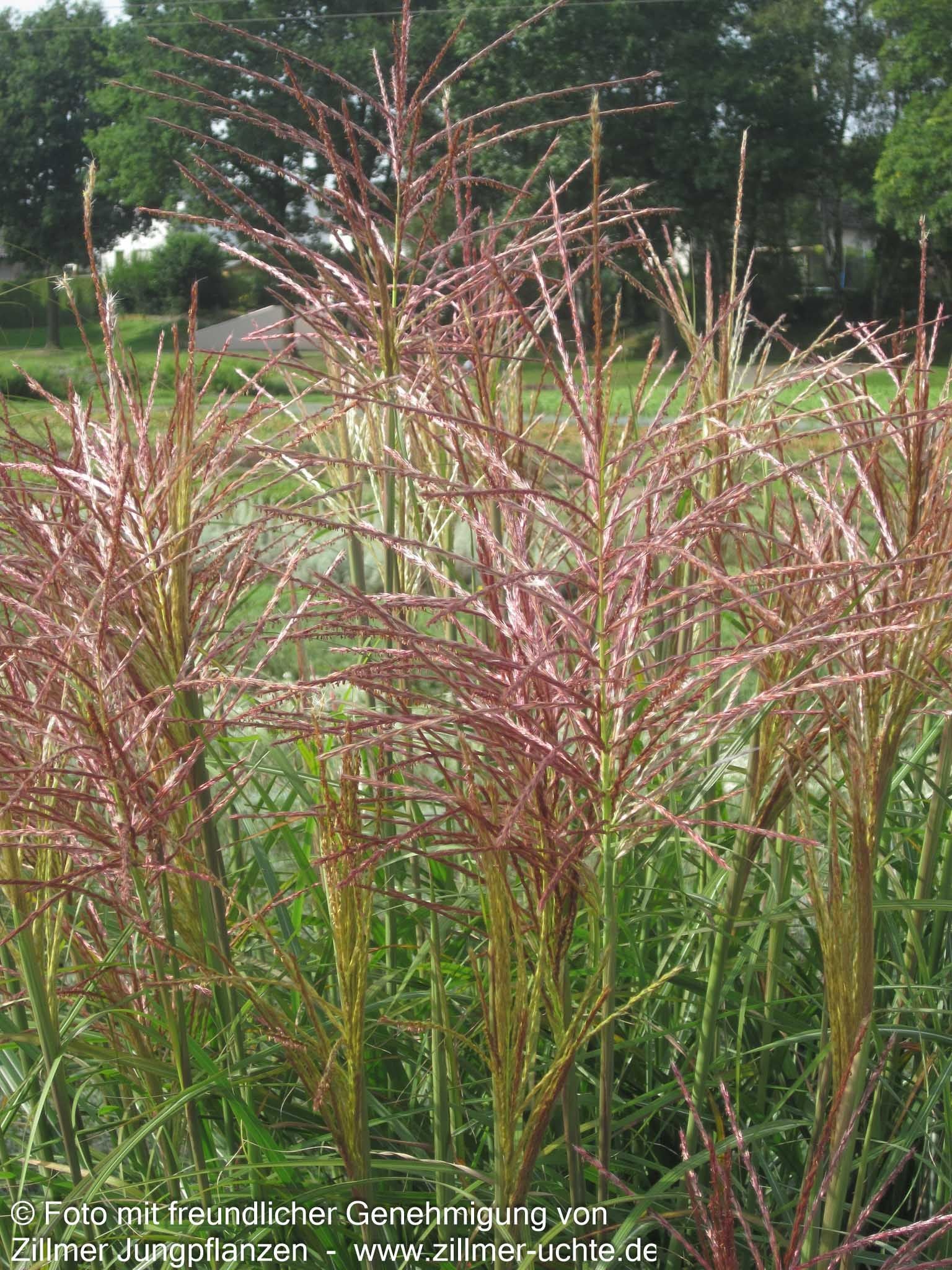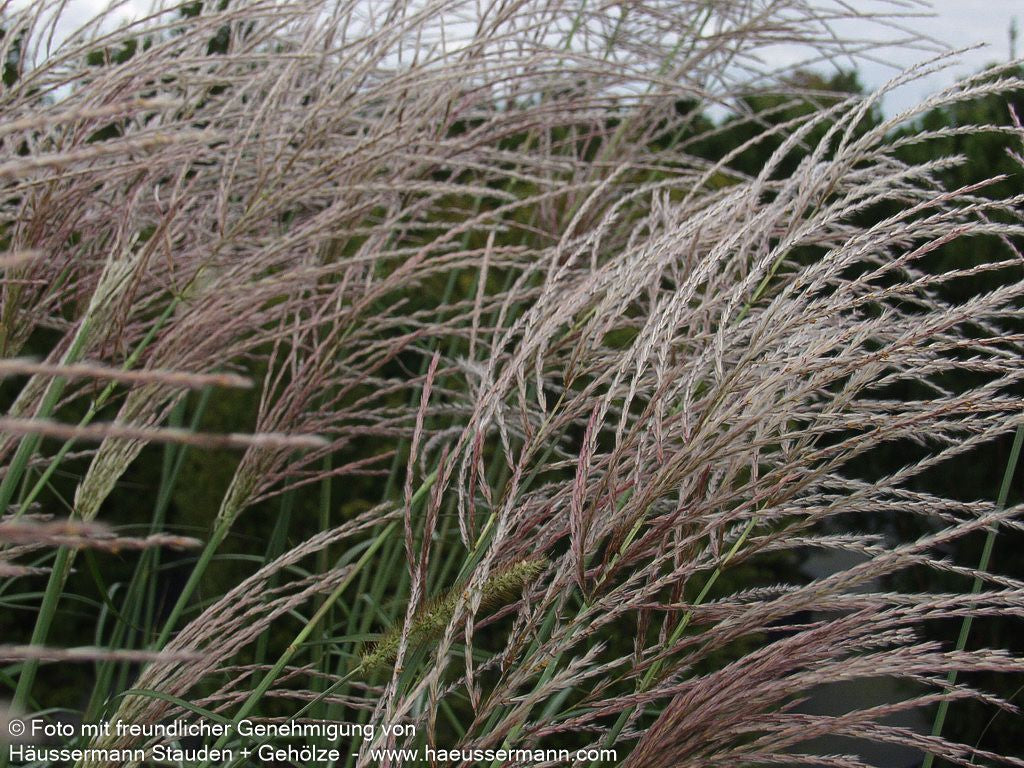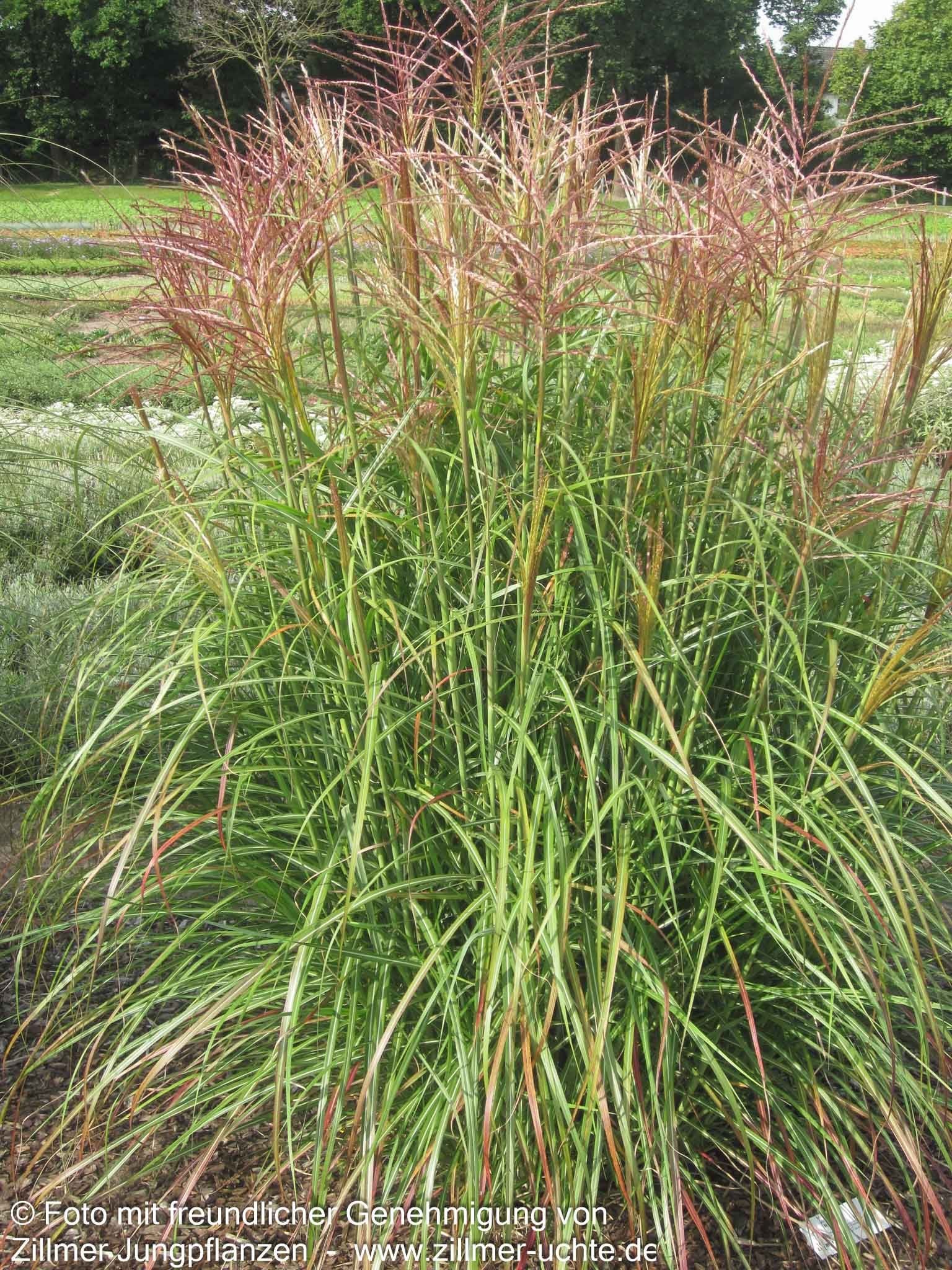 Das Chinaschilf (Miscanthus sinensis 'Rotsilber') ist ein spektakuläres Ziergras, das mit seinen eleganten, bogig überhängenden Halmen und der rosasilbrigen Blütenpracht von August bis Oktober jeden Garten bereichert. Diese Sternensorte erreicht eine beeindruckende Blütenhöhe von bis zu 170 cm und bildet mit ihren grünen Blättern einen attraktiven Kontrast zu den rosaweißen Blütenständen. Als Ziergras bevorzugt es einen sonnigen Standort mit frischem Boden und eignet sich hervorragend als Leitstaude in Freiflächenpflanzungen. Dank seiner Winterhärte bis -22°C und dem dekorativen Fruchtschmuck ist es auch für die Floristik sehr geschätzt.