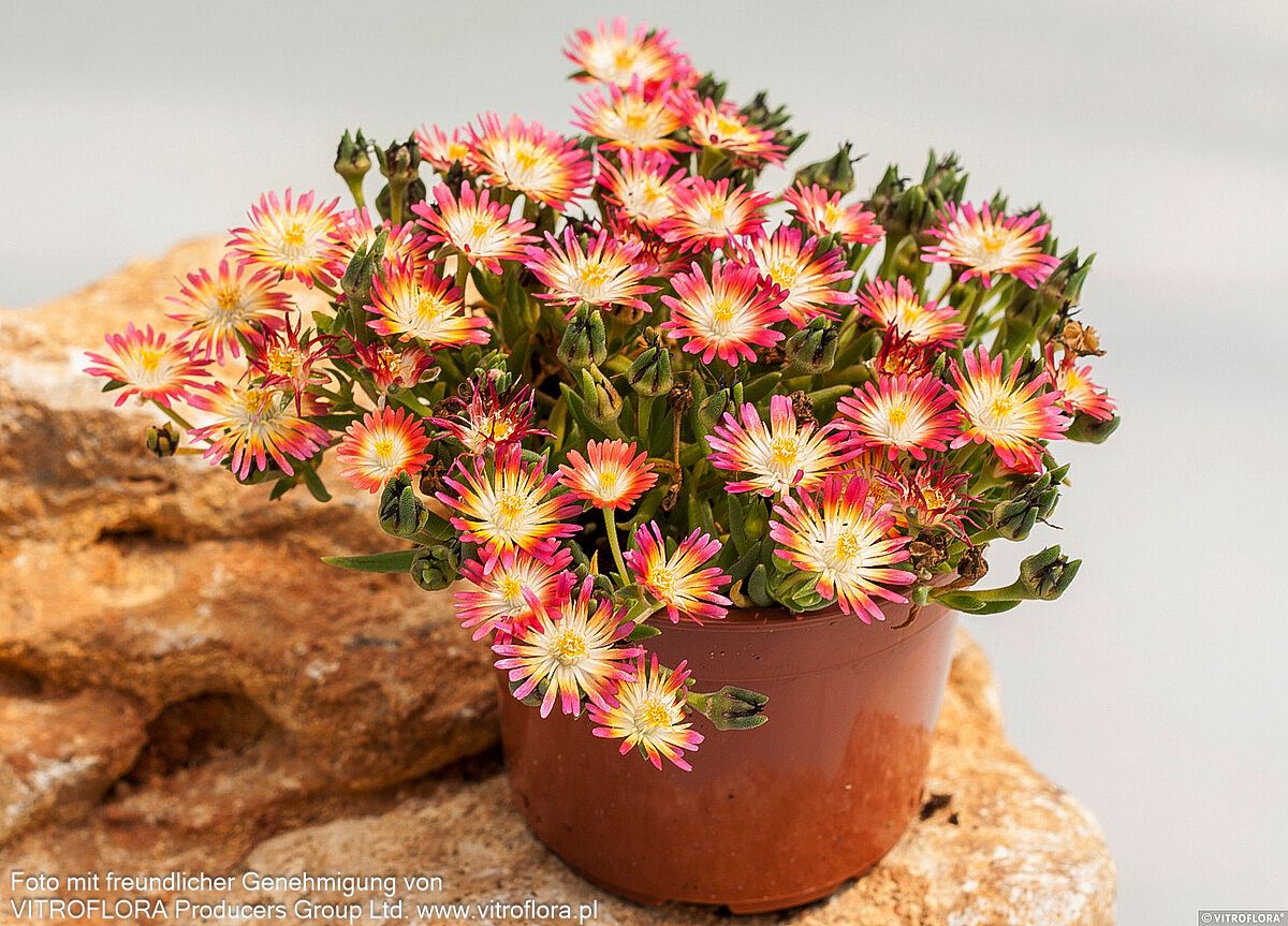 Die Coopers Mittagsblume (Delosperma cooperi 'JD Ruby') ist eine bezaubernde Sukkulente, die von Mai bis Oktober mit ihren leuchtend rosa Blüten für Farbtupfer im Garten sorgt. Diese wintergrüne Staude bildet mit ihren fleischigen, grünen Blättern einen dichten Teppich und eignet sich perfekt als Bodendecker für kleinflächige Bereiche. Die etwa 10 cm großen rosa Blüten öffnen sich bei Sonnenschein und verwandeln jeden Steingarten in ein wahres Blütenmeer. Diese pflegeleichte Schönheit liebt sonnige Plätze und kommt hervorragend mit trockenen Böden zurecht – ideal für wassersparende Gärten und mediterrane Gestaltungskonzepte.