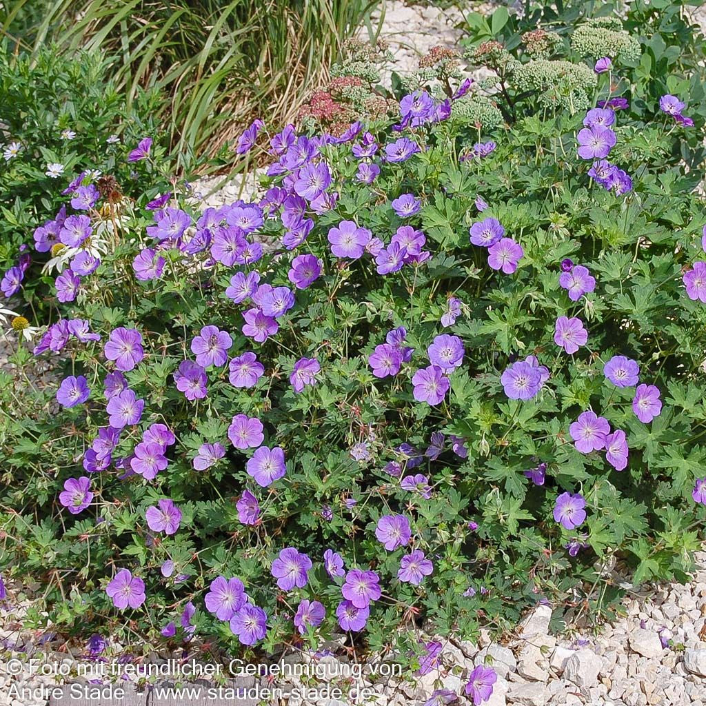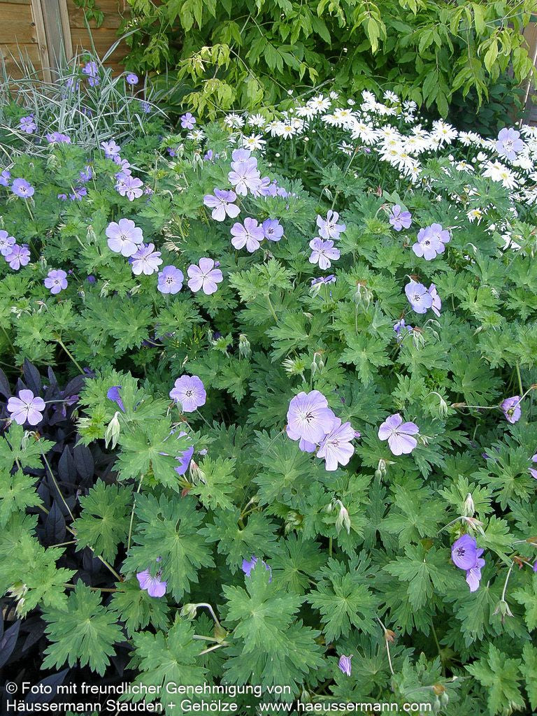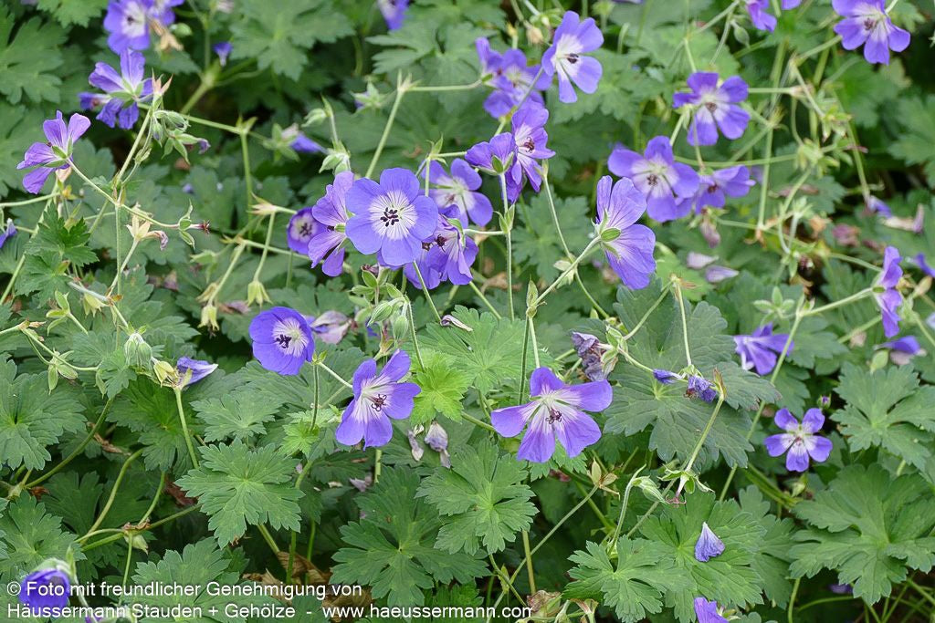 Der Dauerblühende Storchschnabel (Geranium wallichianum 'Rozanne') ist eine außergewöhnliche Staude, die als Staude des Jahres 2004 ausgezeichnet wurde und ihrem Namen alle Ehre macht. Von Juni bis Oktober verzaubert diese Züchtung mit ihren violettblauen Blüten und weißem Auge in einer beeindruckend langen Blütephase. Die kissenartig und breitausladend wachsende Pflanze erreicht eine Höhe von 40 bis 50 cm und eignet sich hervorragend als Bodendecker. An sonnigen Standorten mit frischem Boden gedeiht sie sowohl als Beetstaude als auch als Gehölzrandstaude. Mit ihrer Winterhärte bis -28°C und den attraktiven sommergrünen Blättern ist sie eine zuverlässige Bereicherung für jeden Garten.