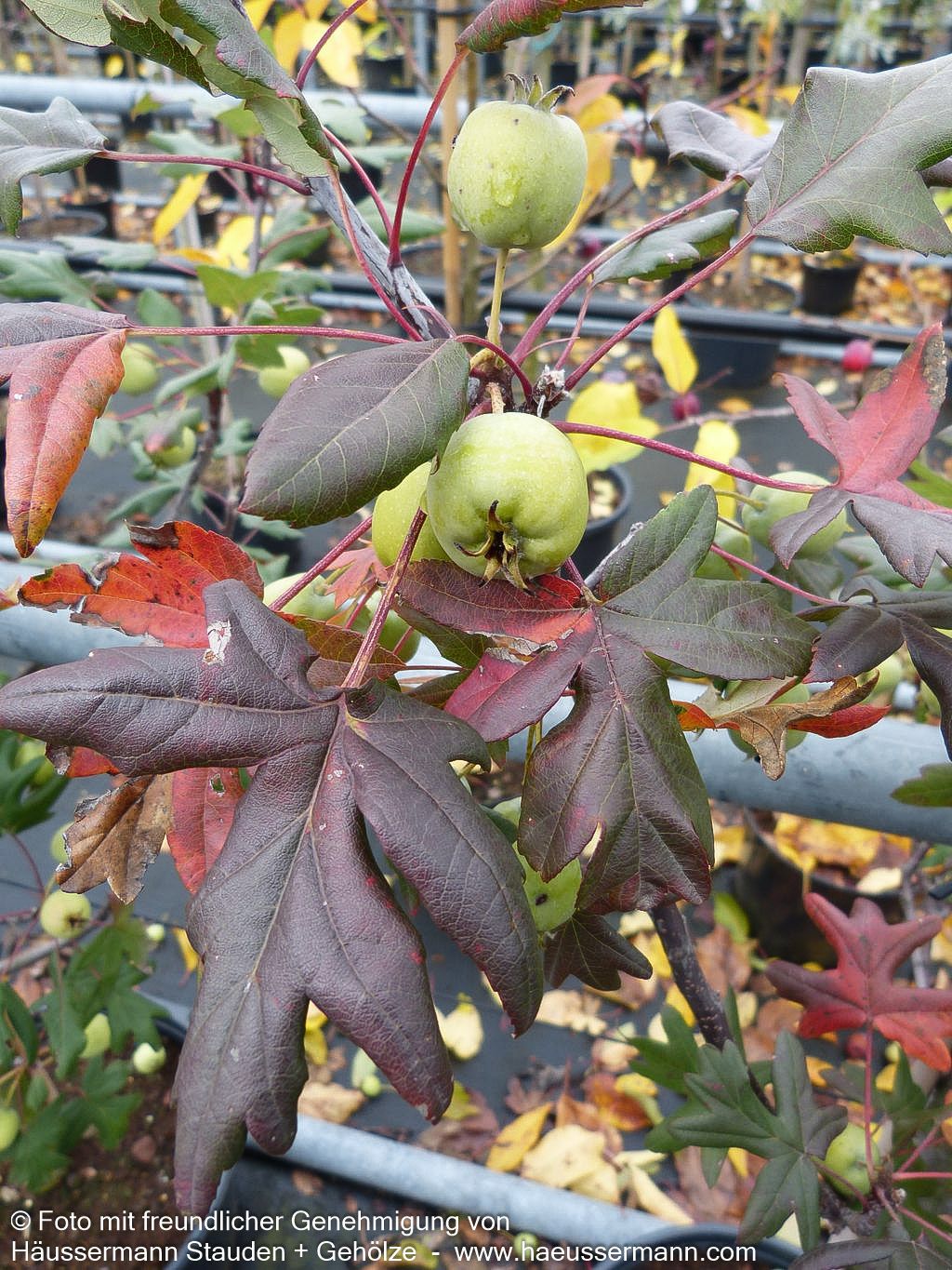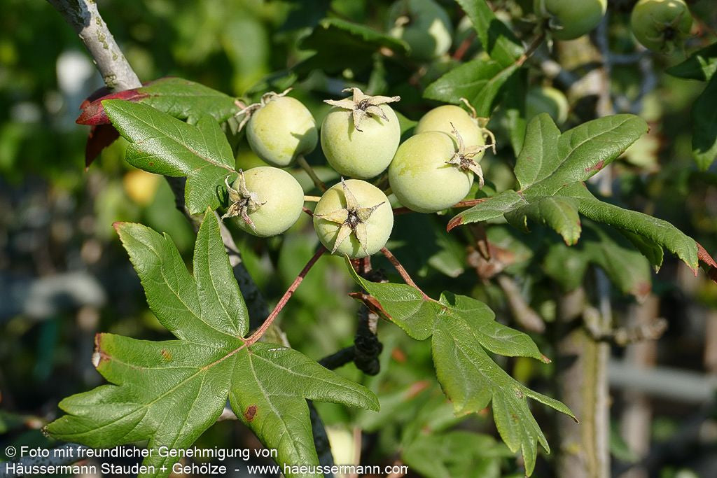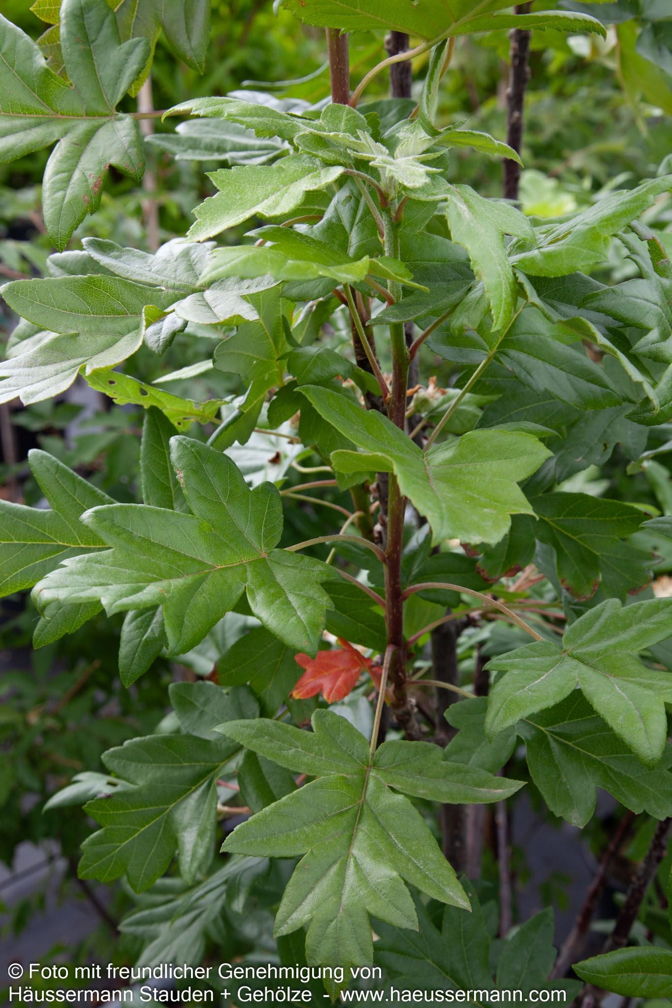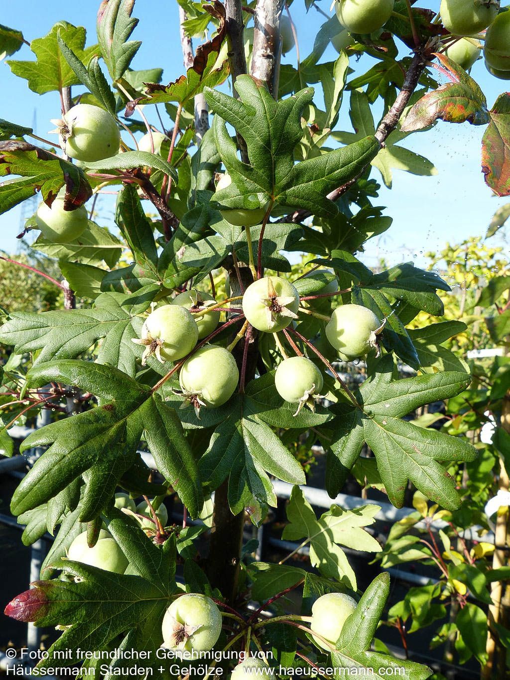 Der Dreilappige Apfel (Malus trilobata) ist ein außergewöhnlicher Laubbaum mit charakteristischen, glänzend dunkel-grünen Blättern, die eine markante dreilappige Form aufweisen. Dieser elegante Kleinbaum wächst schmal aufrecht und kegelförmig und erreicht eine imposante Höhe bis 15 Meter. Von April bis Mai verzaubert er mit seinem herrlichen Blütenschmuck aus weißen Blüten, gefolgt von dekorativen grün-roten Früchten als attraktiver Fruchtschmuck. Im Herbst begeistert das sommergrüne Laub mit einer spektakulären Herbstfärbung in leuchtenden Gelb-, Rot- und Purpurtönen. Dieser vielseitige Baum gedeiht an sonnigen bis halbschattigen Standorten auf frischen bis feuchten Böden und dient gleichzeitig als wertvolle Insektennährpflanze und Vogelnährpflanze, während seine Früchte auch kulinarisch bedeutsam sind.