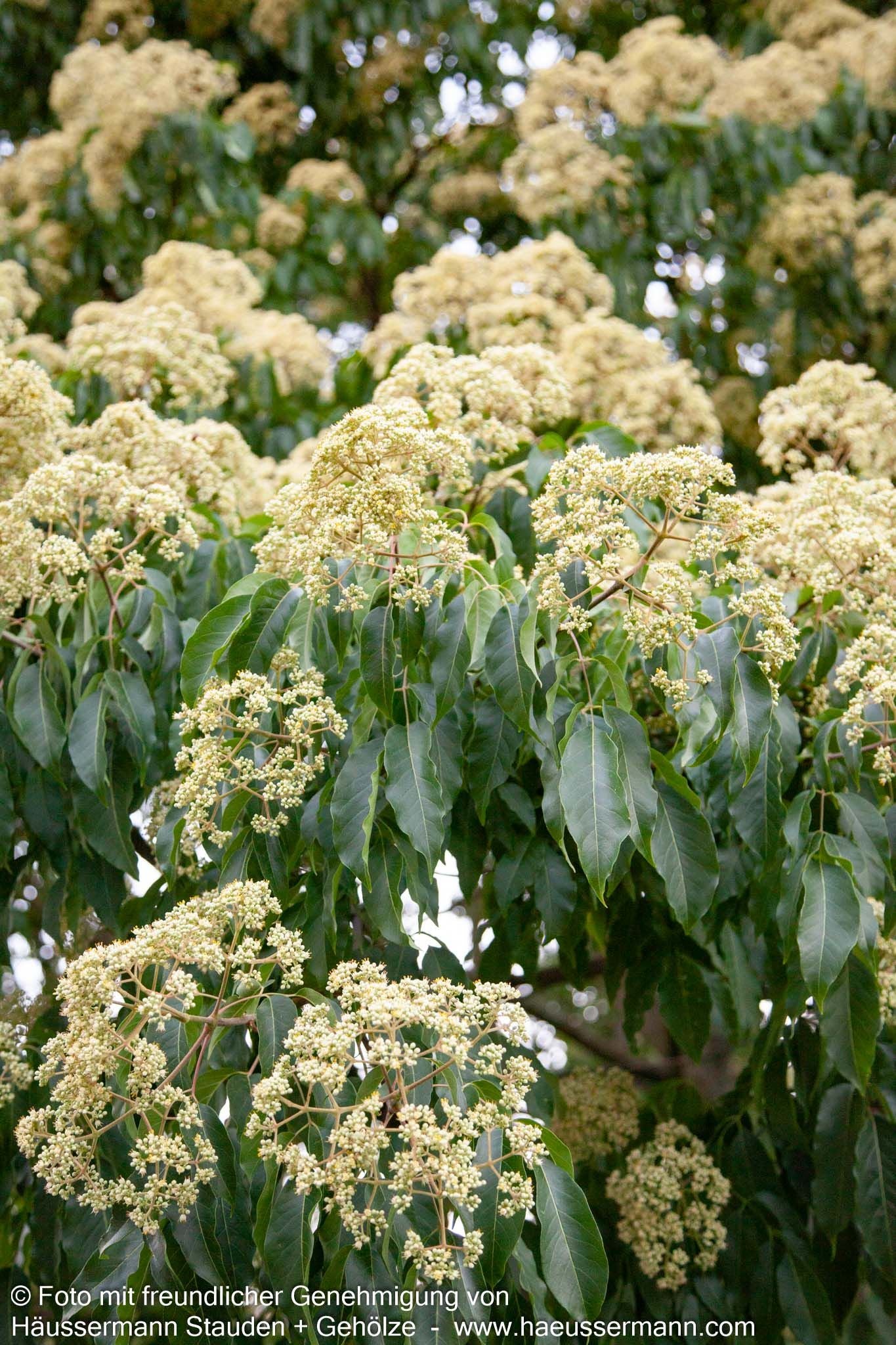 Die Duftesche (Euodia hupehensis) ist ein außergewöhnliches Laubgehölz, das als Großgehölz mit 6-8 Metern Höhe beeindruckt. Dieser breit aufrecht wachsende Großstrauch oder kleine Baum entfaltet im September seine wahre Pracht mit zahlreichen weißen, intensiv duftenden Schirmrispen. Als wertvolle Insektennährpflanze und exzellentes Bienennährgehölz ist sie ein unverzichtbarer Baustein für naturnahe Gärten. Die wärmeliebende Duftesche gedeiht an sonnigen Plätzen auf trockenen bis feuchten Böden und begeistert nicht nur mit ihrem Blütenschmuck, sondern auch mit ihrer Herbstfärbung. Dieses sommergrüne wertvolle Gartengehölz ist winterhart und als Spätsommerblüher eine Bereicherung für jeden Garten.