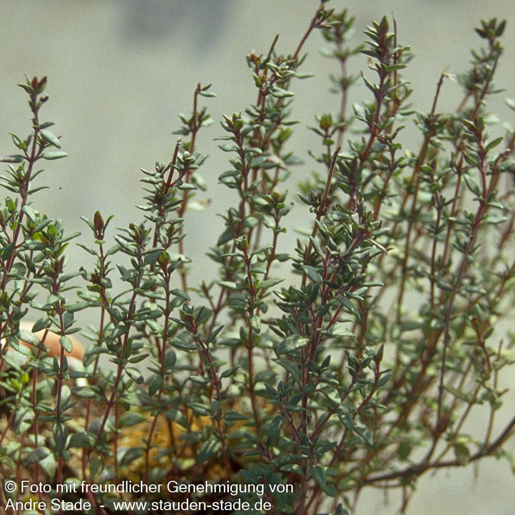 Der Echte Thymian (Thymus vulgaris) ist eine vielseitige und aromatische Staude, die als Heil- und Gewürzpflanze in keinem Garten fehlen sollte. Diese kissenartig wachsende Pflanze erreicht eine Höhe von 10-25 cm und schmückt sich von Juni bis September mit zarten hell-violetten Blüten, die Insekten magisch anziehen. Die graugrünen, wintergrünen Blätter verströmen einen intensiven Duft und können sowohl frisch als auch getrocknet als Koch-Kräuter verwendet werden. Als bewährte Heilpflanze lindert Thymian Atemwegs- und Magen-Darm-Beschwerden. Ideal für sonnige Standorte mit trockenen Böden, gedeiht er hervorragend in Steinanlagen und im Bauerngarten und eignet sich auch als kleinflächiger Bodendecker.