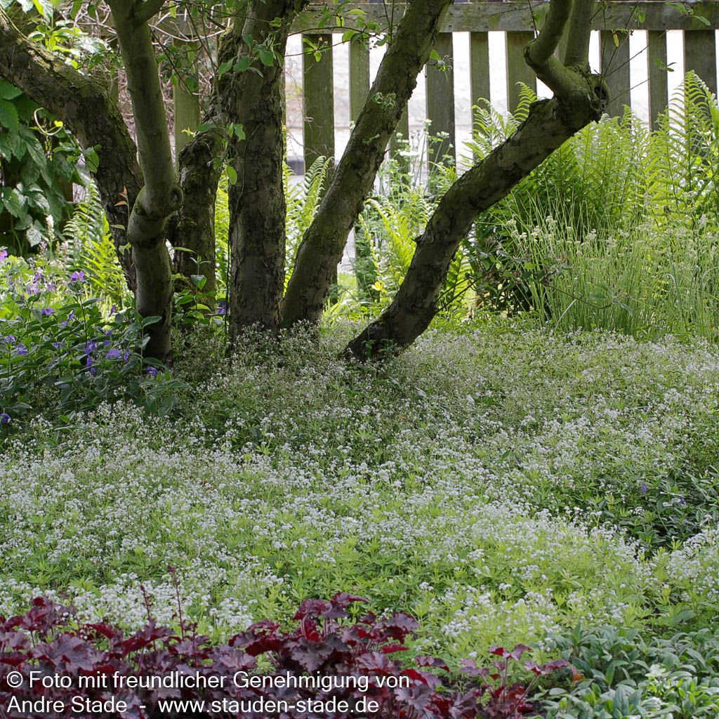 Der Echte Waldmeister (Galium odoratum) ist eine bezaubernde heimische Staude, die mit ihren weißen, einfachen Blüten von April bis Mai verzaubert und als klassische Zutat für die traditionelle Maibowle geschätzt wird. Diese duftende Heil- und Medizinpflanze gedeiht optimal an halbschattigen bis schattigen Plätzen unter Gehölzen und entwickelt sich zu einem attraktiven, flächigen Bodendecker mit ausläuferbildendem Wuchsverhalten. Die sommergrünen, grünen Blätter verströmen einen charakteristischen Duft und eignen sich hervorragend zur Teezubereitung. Als Insektennährpflanze und geschätzte Bauerngartenpflanze ist dieser winterharte Bodendecker (Z5) eine wertvolle Bereicherung für schattige Gartenbereiche und Rhododendronpflanzungen, wo er mit seiner natürlichen Unkrautverdrängung durch Wurzelausscheidungen überzeugt.