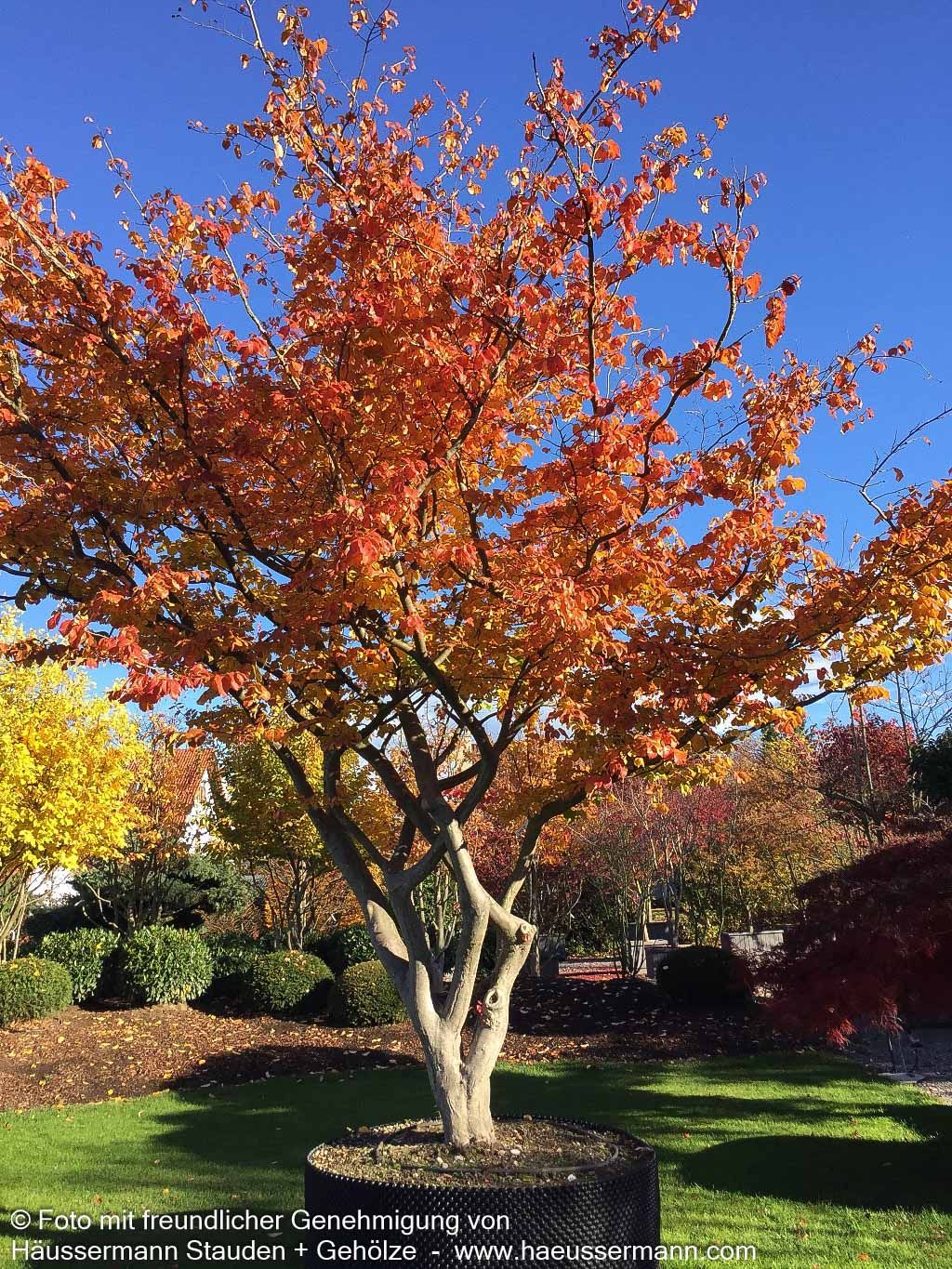 Der Eisenholzbaum (Parrotia persica) ist ein außergewöhnlich wertvoller Laubbaum mit breit aufrechtem Wuchs, der als Kleinbaum eine imposante Höhe von 5-7 Metern erreicht. Seine wahre Pracht entfaltet dieser sommergrüne Strauch bereits früh im Jahr mit zahlreichen gelben Blüten und auffälligen roten Staubgefäßen, die von März bis April erscheinen. Besonders spektakulär zeigt sich die Herbstfärbung in leuchtenden Tönen von Gelb über Orangerot bis hin zu violett überlaufenem Rot. An sonnigen Standorten mit frischen bis feuchten Böden gedeiht dieser unempfindliche und wertvolle Gartenstrauch prächtig und wird zum Blickfang in großen Gärten und Parks.
