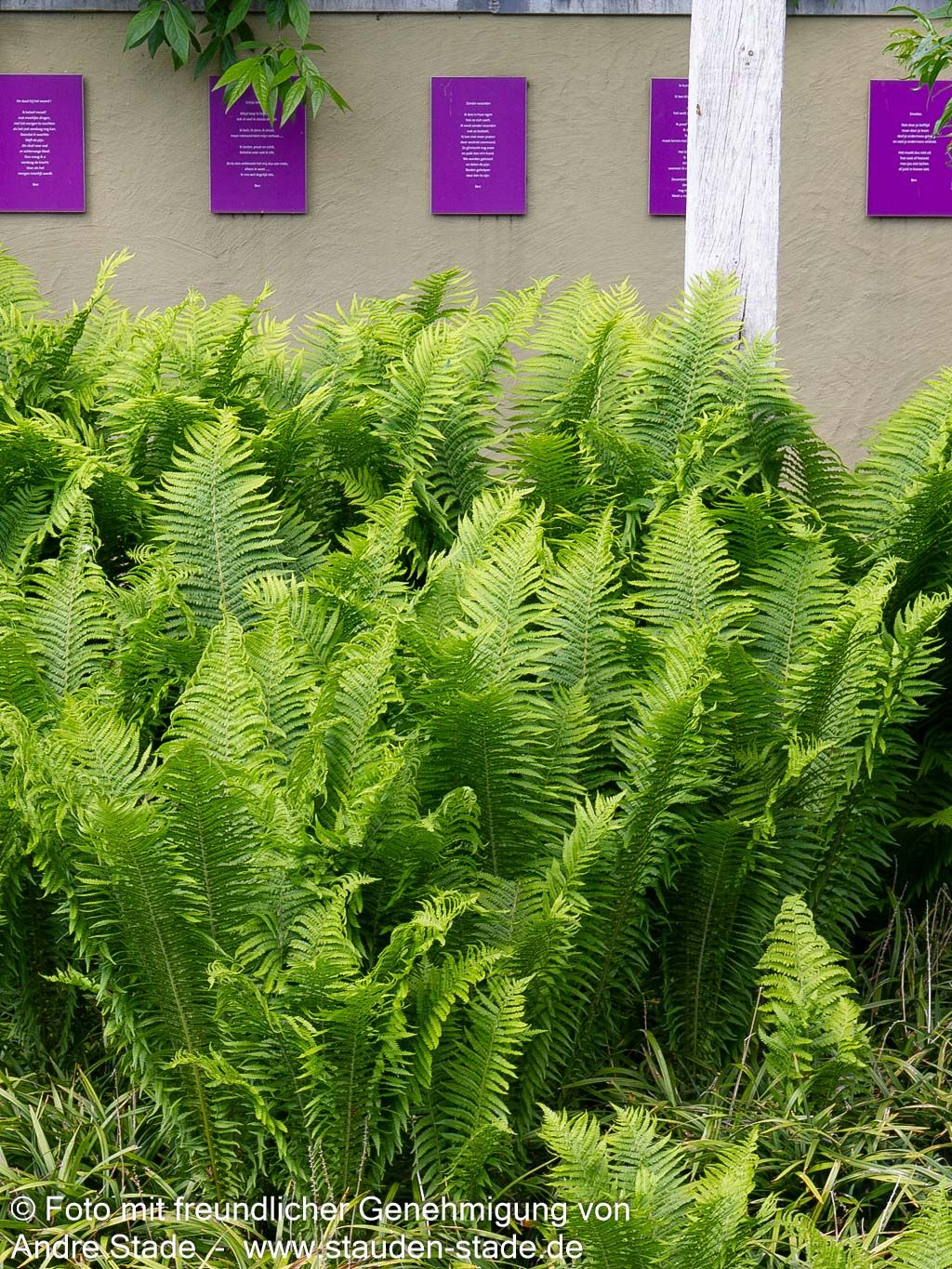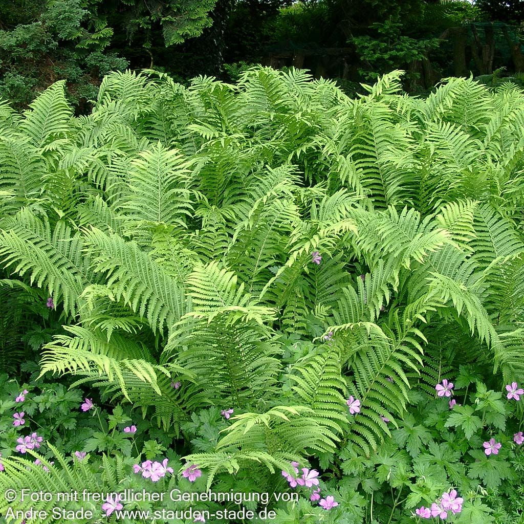 Der Europäische Straußenfarn (Matteuccia struthiopteris) ist ein majestätischer Farn mit einer beeindruckenden Wuchshöhe von 80-100 cm, der durch seine außergewöhnliche Blattform jeden Schattengarten bereichert. Diese heimische Prachtstaude entwickelt ihre olivgrünen, sommergrünen Wedel in charakteristischer trichterförmiger Anordnung und gedeiht optimal an halbschattigen bis schattigen Plätzen unter Gehölzen. Der ausläuferbildende Straußenfarn bevorzugt frische bis feuchte Böden und ist mit seiner extremen Winterhärte bis -43°C absolut zuverlässig. Als ausgezeichnete Sternensorte eignet sich dieser starkwüchsige Farn hervorragend für die Unterpflanzung von Rhododendren und als Gehölzrandstaude.