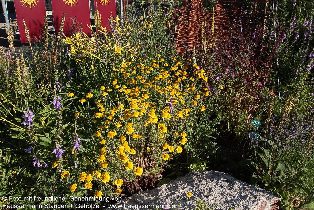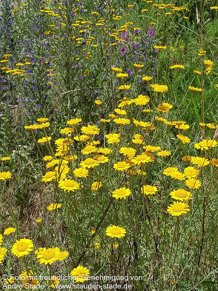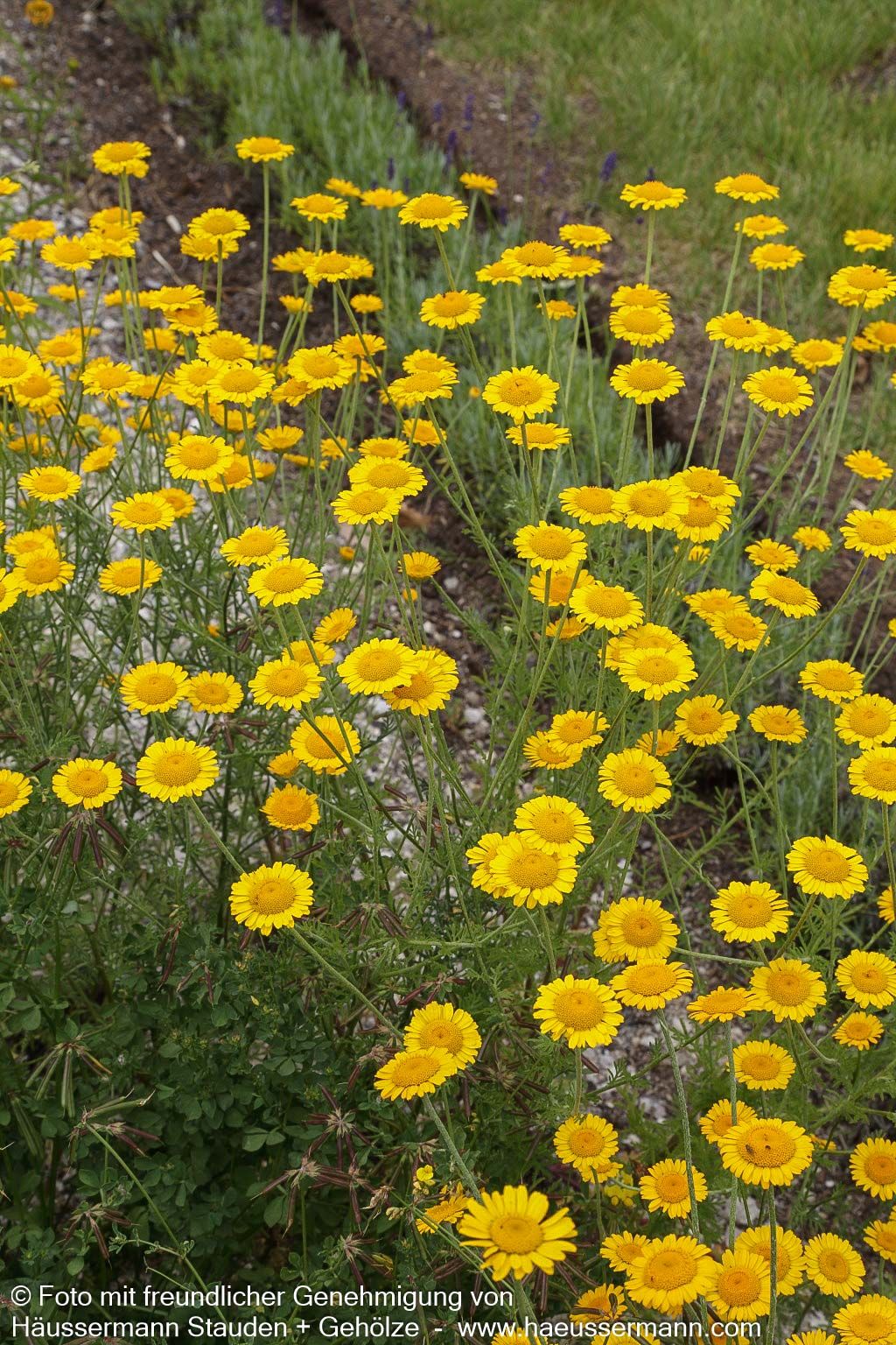 Die Färber-Hundskamille (Anthemis tinctoria) ist eine bezaubernde heimische Staude, die mit ihren leuchtend gelben, einfachen Blüten von Juli bis September jeden Garten bereichert. Diese robuste Staude erreicht eine Blütenhöhe von 30 bis 60 cm und überzeugt mit ihren attraktiven graugrünen, sommergrünen Blättern. Als wertvolle Insektennährpflanze gedeiht sie optimal an sonnigen Standorten auf trockenen Böden und eignet sich hervorragend für Freiflächenstauden, Steinanlagen oder die extensive Dachbegrünung. Mit ihrer Winterhärte bis -22°C und dem dezenten Blatt- oder Blütenduft ist diese buschige Staude eine Bereicherung für jeden naturnahen Garten.