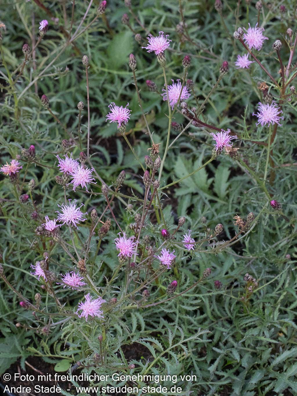 Die Färber-Scharte (Serratula tinctoria) ist eine beeindruckende heimische Staude, die mit ihren rotvioletten Blüten von Juli bis September besticht. Diese robuste Staude entwickelt eine buschig-dichtbuschige Wuchsform mit einer Blütenhöhe von 40 bis 100 cm und zeigt ihre tiefgrünen, sommergrünen Blätter besonders schön an sonnigen Standorten. Als vielseitige Gehölzrandstaude und Freiflächenstaude gedeiht sie optimal in frischen bis feuchten Böden und ist mit ihrer Winterhärte bis -22°C eine zuverlässige Bereicherung für jeden Garten. Als Leitstaude sollte sie in Gruppen von 1-3 Stück mit einem Pflanzabstand von 50 bis 60 cm gesetzt werden.
