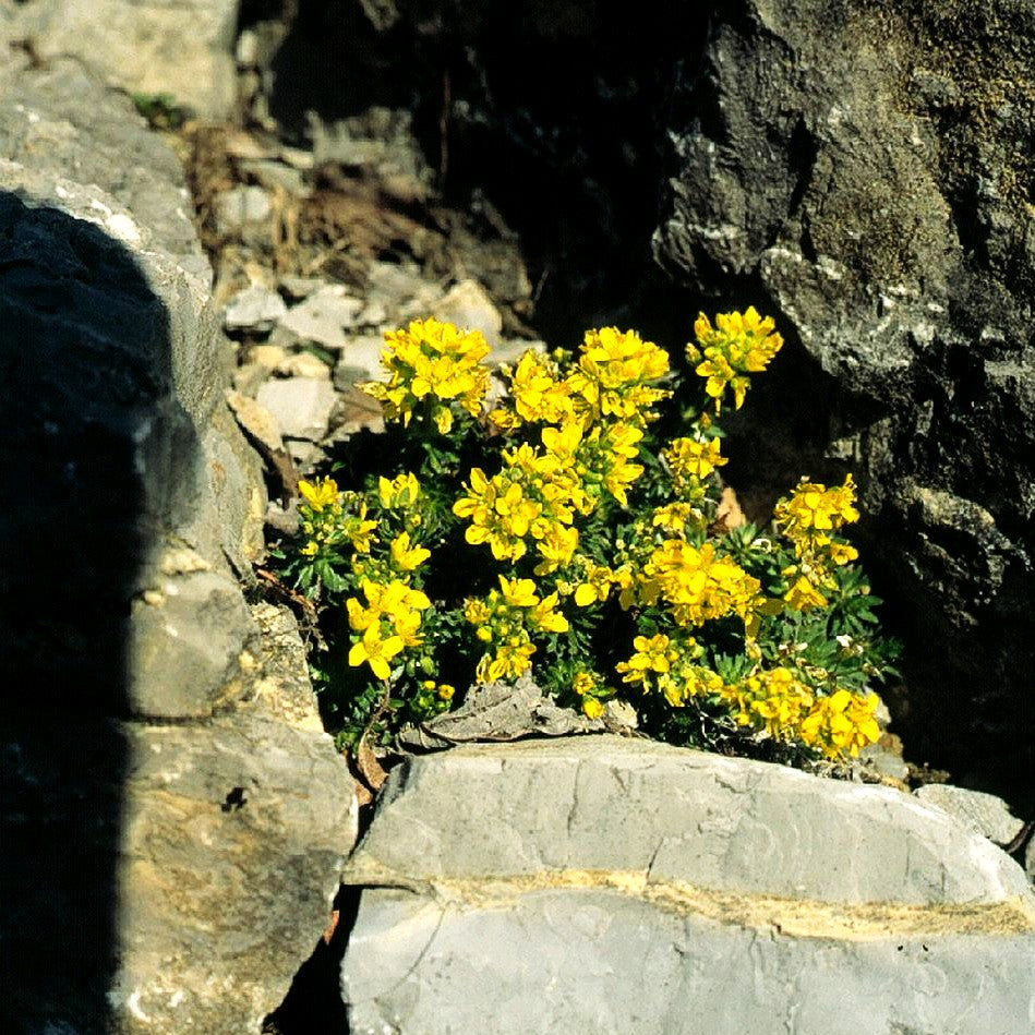 Pflanzen Sie diese charmante Leitstaude in kleinen Gruppen von 1-3 Stück mit einem Abstand von 10-15 cm – so entfaltet das Felsenblümchen seine volle Wirkung in Ihrem Steingarten.