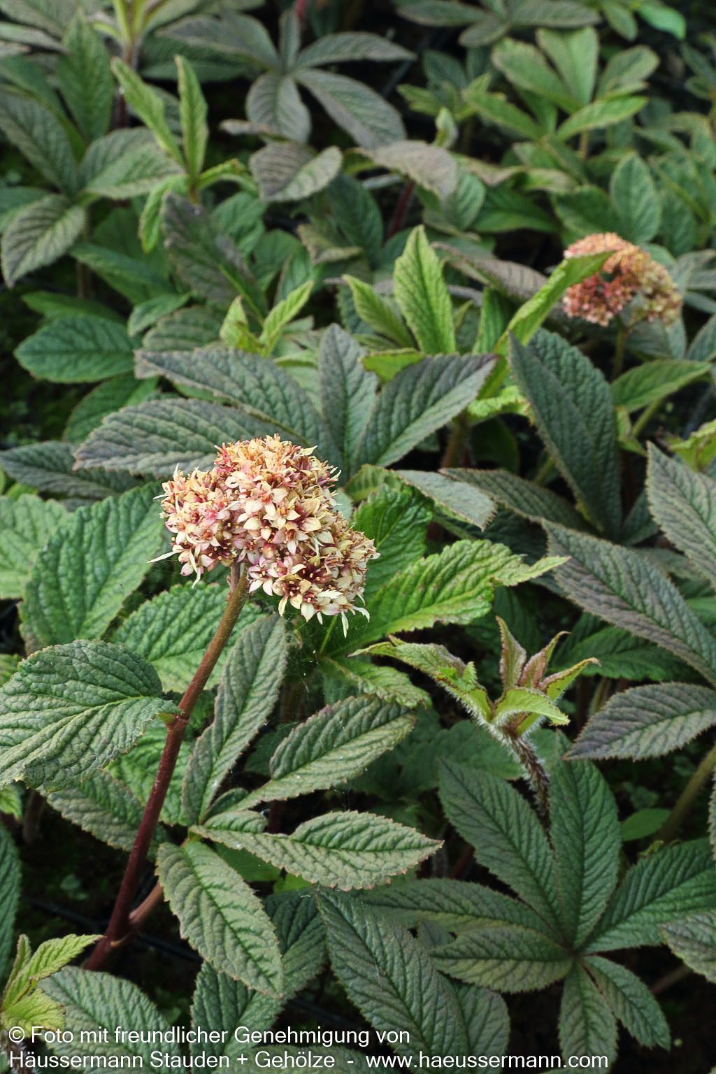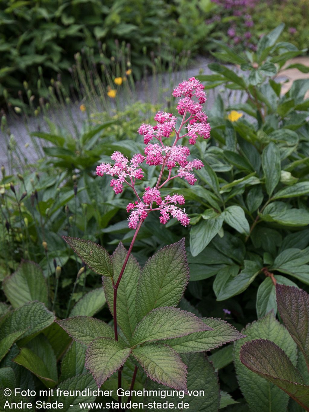 Das Fiederblättrige Schaublatt (Rodgersia pinnata 'Chocolate Wings') ist eine außergewöhnliche Staude, die mit ihrem spektakulären Farbwechsel der Blätter vom bronzebraunen Austrieb über dunkelgrün im Sommer bis hin zu bronzebraun im Herbst begeistert. Diese imposante Staude entwickelt von Mai bis Juli beeindruckende rosa Blütenstände, die sich später rot färben und stolze 80 cm Höhe erreichen. Mit ihrer ausladend bis breitausladenden Wuchsform und dem rhizombildenden Wuchsverhalten eignet sie sich hervorragend als Leitstaude für halbschattige Bereiche. Diese winterharte Prachtstaude der Winterhärtezone Z6 gedeiht optimal an frischen bis feuchten Standorten und ist perfekt geeignet für Pflanzungen unter Gehölzen, als Gehölzrandstaude oder im Staudenbeet.