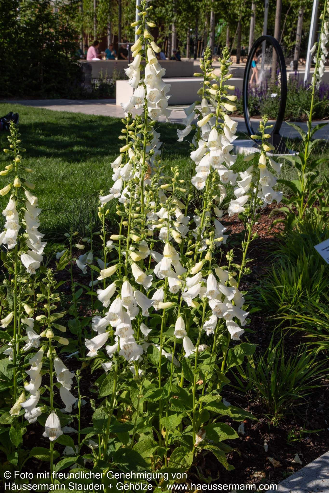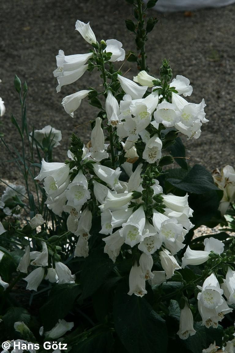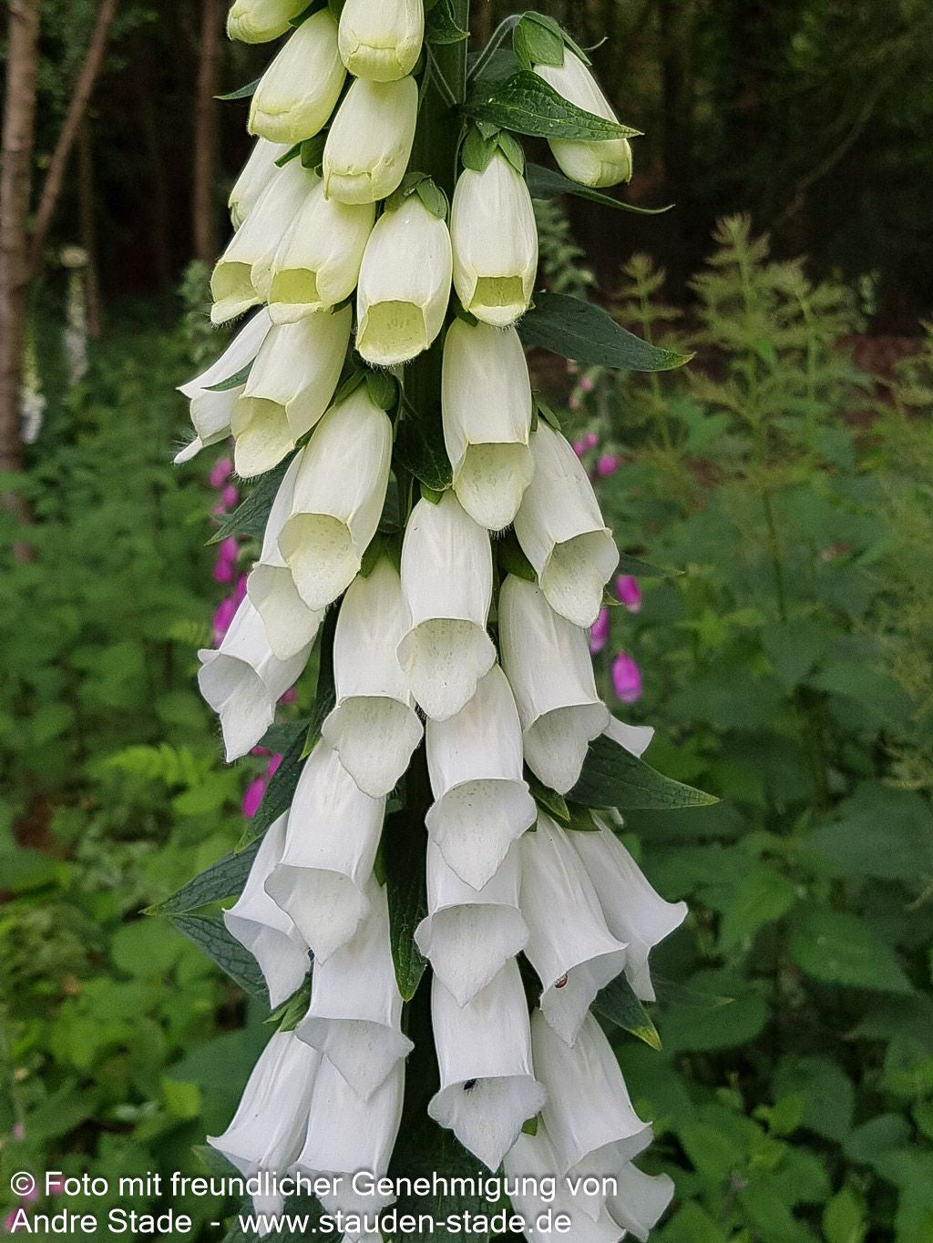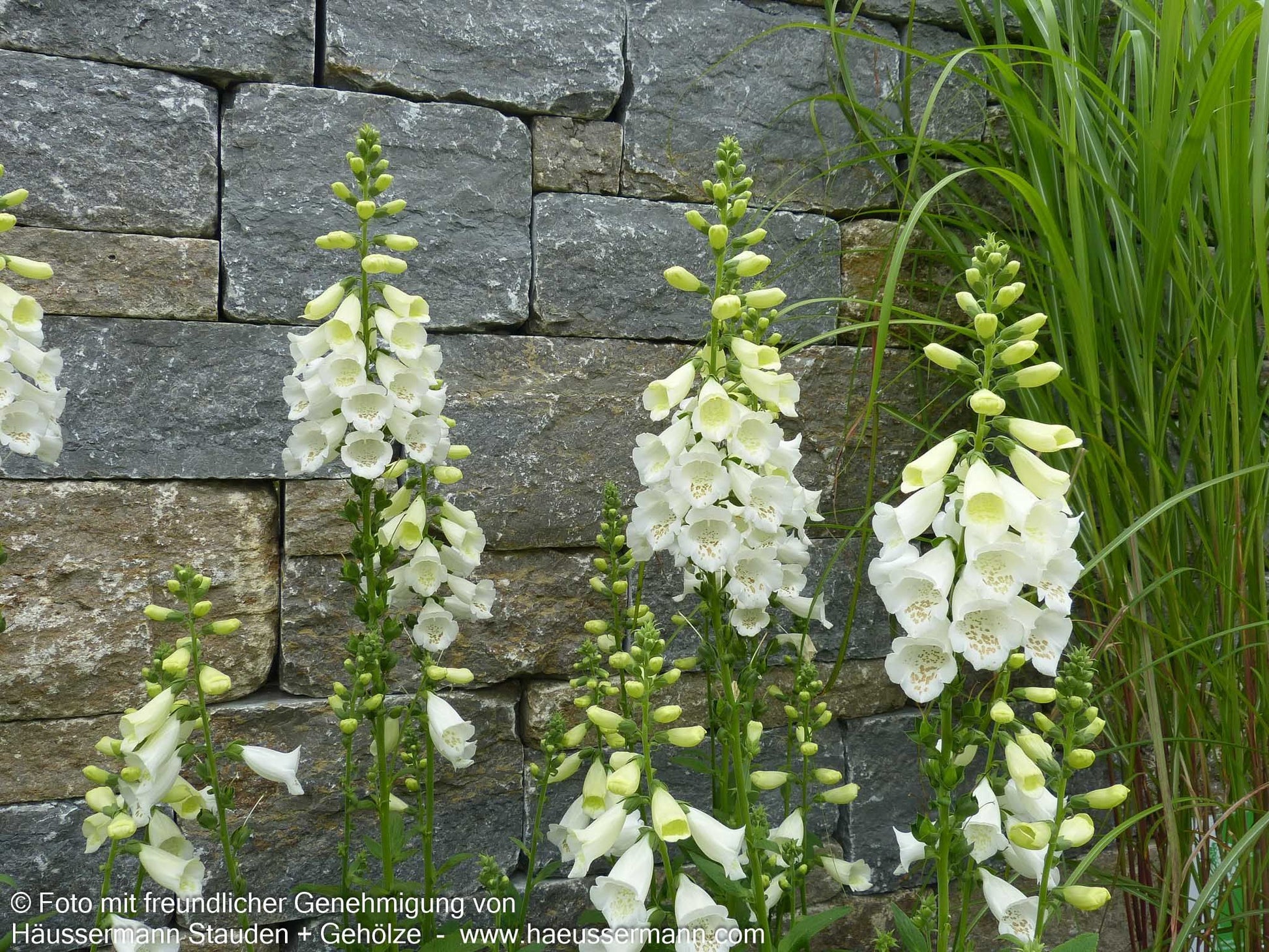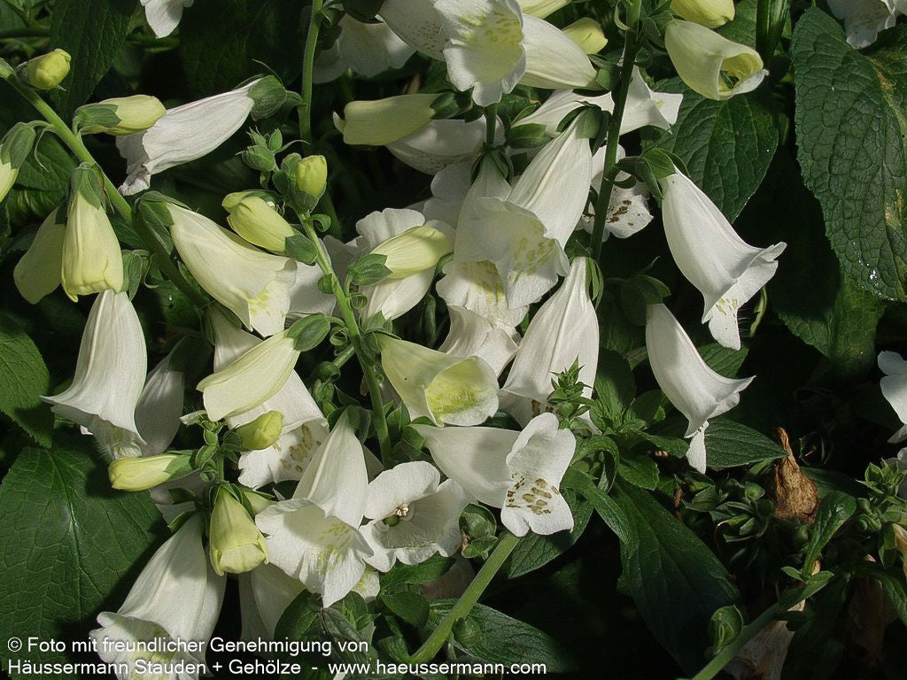 Der Fingerhut (Digitalis purpurea 'Alba') ist eine majestätische zweijährige Staude, die mit ihren eleganten weißen Blütenähren von Juni bis September für spektakuläre Höhepunkte im Garten sorgt. Diese beeindruckende Staude erreicht eine imposante Höhe von 80-130 cm und entwickelt ihre charakteristische rosettenartige Wuchsform mit aufrechten Stängeln und grundständigem Blattschopf. Die tief-grünen, wintergrünen Blätter bilden einen wunderschönen Kontrast zu den strahlend weißen, einfachen Blüten. Diese robuste zweijährige Pflanze gedeiht optimal an sonnigen bis halbschattigen Standorten auf frischem Boden und ist winterhart bis -28°C. Als wertvolle Insektennährpflanze bereichert sie nicht nur den Bauerngarten, sondern eignet sich auch hervorragend als Gehölzrandstaude und passt wunderbar zu Rhododendron.