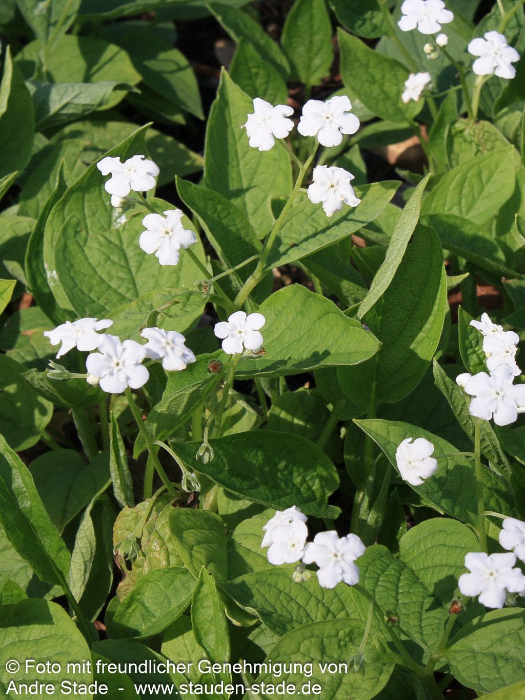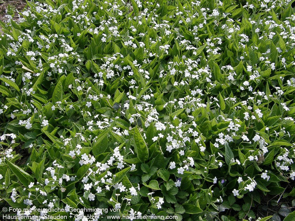 Das Frühlings-Gedenkemein (Omphalodes verna 'Alba') ist eine bezaubernde frühlingsblühende Staude, die mit ihren reinweißen, einfachen Blüten von März bis Mai jeden Garten verzaubert. Diese zierliche Staude erreicht eine Blütenhöhe von 10-12 cm bei einer Blattwerkhöhe von 8-10 cm und entwickelt sich zu einem dichten, teppichartigen Bodendecker durch ihr ausläuferbildendes und kriechendes Wuchsverhalten. Das sommergrüne Laub in frischem Grün bildet einen perfekten Kontrast zu den strahlend weißen Blüten. Als vielseitige Gehölzrandstaude gedeiht sie optimal an sonnigen bis halbschattigen Standorten auf frischen Böden und ist mit ihrer Winterhärtezone Z6 bis -22°C bestens für unser Klima geeignet. Besonders schön wirkt sie als kleinflächiger Bodendecker oder als Begleitstaude zu Rhododendron, wobei ein Pflanzabstand von 20 cm optimal ist.