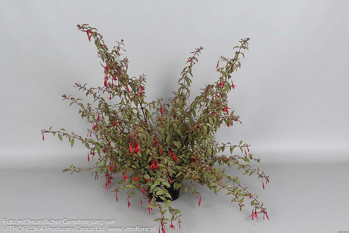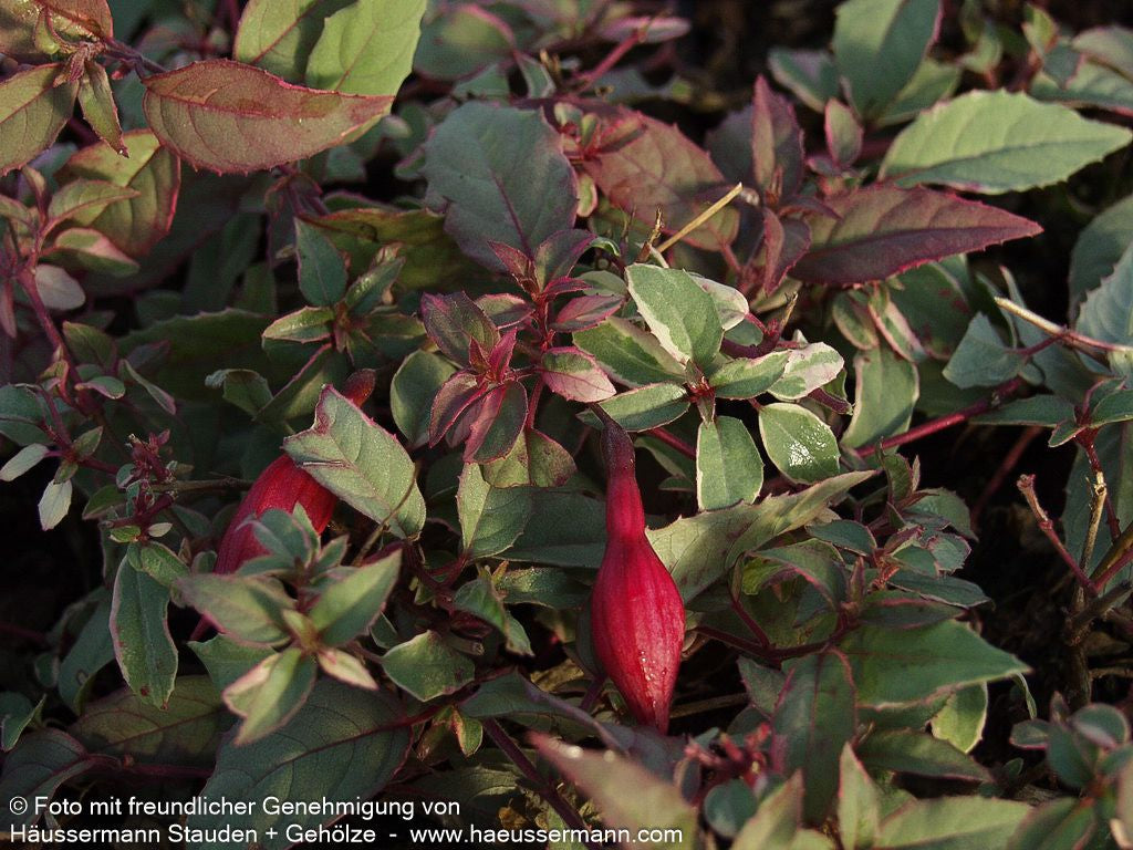 Die Garten-Fuchsie (Fuchsia magellanica 'Tricolor') ist eine außergewöhnliche Züchtung, die mit ihrer spektakulären Blatt- und Blütenpracht jeden Garten bereichert. Diese sommergrüne Staude begeistert von August bis Oktober mit ihren eleganten, einfachen Blüten in dunkelrot und violett. Das dreifarbige Laub in grün, rotbraun und weiß verleiht dieser besonderen Blattschmuckstaude ganzjährig Attraktivität. Mit ihrer buschigen Wuchsform erreicht sie eine Höhe von 40-60 cm und gedeiht optimal an absonnigen Standorten mit frischem Boden. Als Leitstaude eignet sie sich hervorragend für den Bauerngarten und ist zudem kulinarisch bedeutsam. Diese winterharte Sorte der Zone 7 verträgt Temperaturen bis -17°C und sollte mit einem Pflanzabstand von 40-60 cm als Beetstaude kultiviert werden.
