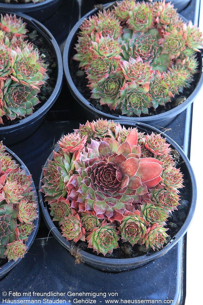 Die Garten-Hauswurz (Sempervivum x cult.'Crispijn') beeindruckt mit ihren außergewöhnlichen braunroten Rosetten und ist ein wahres Juwel für jeden Steingarten. Diese robuste Staude entwickelt von Juni bis Juli elegante, einfache Blüten in braunrot, die 15-20 cm hoch werden und einen reizvollen Kontrast zu den immergrünen, 3-5 cm breiten Blättern bilden. Die Hauswurz 'Crispijn' gedeiht optimal an sonnigen Standorten mit trockenem Boden und ist dank ihrer extremen Anspruchslosigkeit ideal für die extensive Dachbegrünung geeignet. Mit ihrer spektakulären roten Farbgebung setzt diese pflegeleichte Sukkulente das ganze Jahr über markante Akzente in Ihrem Garten.