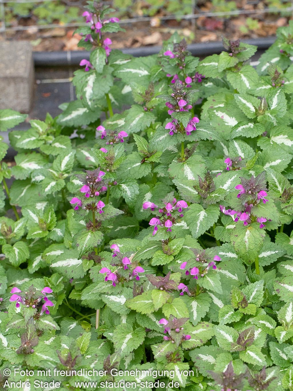 Die Gefleckte Taubnessel (Lamium maculatum 'Chequers') ist eine ausgezeichnete Sternensorte, die mit ihren violettrosa Blüten von Mai bis Juli begeistert. Diese vielseitige Staude besticht durch ihre weiß-silbrig gefleckten Blätter, die der Pflanze auch außerhalb der Blütezeit einen hohen Zierwert verleihen. Als zuverlässige Bodendecker gedeiht sie sowohl an halbschattigen als auch schattigen Standorten. Die wintergrüne Staude ist nicht nur ein Augenschmaus, sondern auch eine wertvolle Insektennährpflanze und sogar kulinarisch nutzbar. Mit ihrer Winterhärte bis -34°C und der Eignung als Rhododendron-Begleiter ist sie eine perfekte Wahl für naturnahe Gärten.