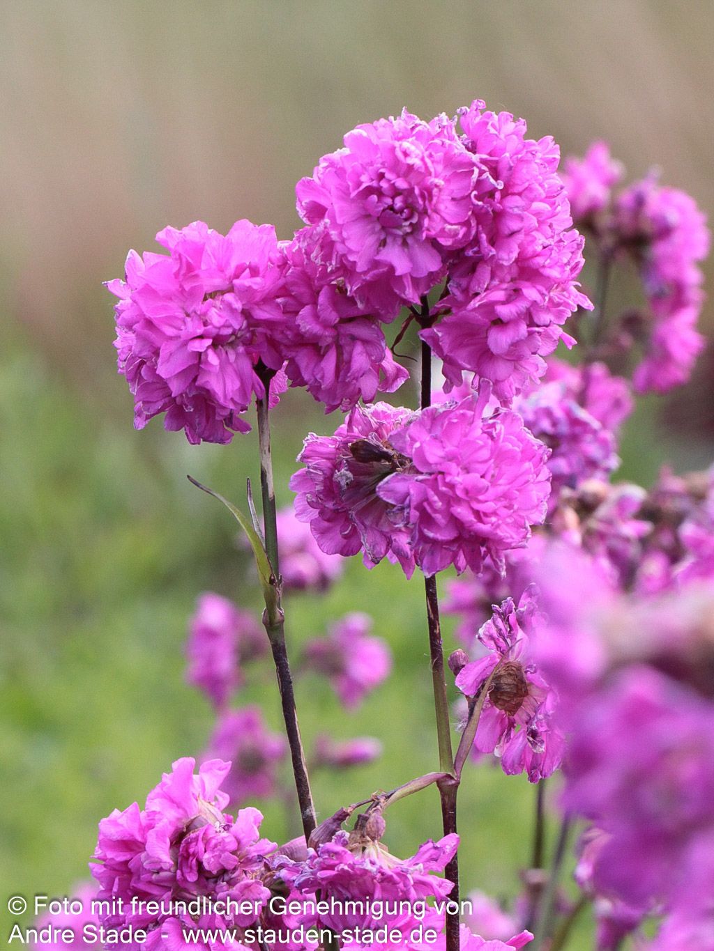 Die Gefülltblühende Pechnelke (Lychnis viscaria 'Plena') ist eine bezaubernde Staude, die mit ihren gefüllten purpurrosa Blüten von Mai bis Juli jeden Garten bereichert. Diese ausgezeichnete Sternensorte erreicht eine Blütenhöhe von 40-50 cm und bildet mit ihrem rosettenartigen Wuchs und den tief-grünen, wintergrünen Blättern das ganze Jahr über einen attraktiven Blickfang. Als vielseitige Beetstaude gedeiht sie optimal an sonnigen Standorten mit frischen bis trockenen Böden und ist mit ihrer Winterhärte bis -34°C äußerst robust. Perfekt für den Bauerngarten und ideal für Schnittzwecke, sollte diese Gerüststaude in Gruppen von 3-5 Stück gepflanzt werden.