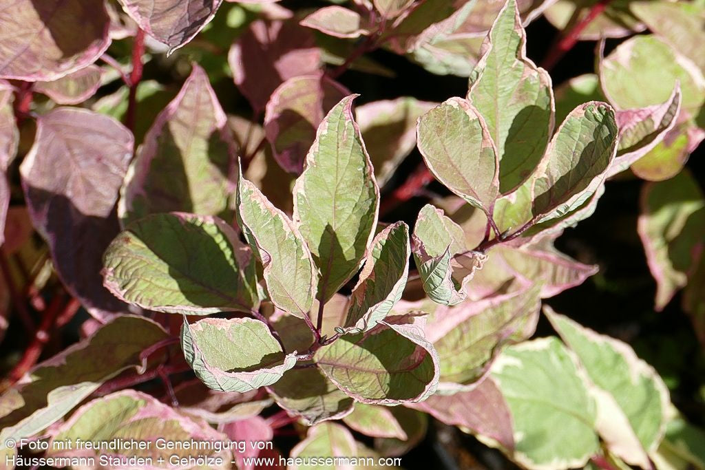Der Gelbbunter Hartriegel (Cornus alba 'Cream Cracker') ist ein außergewöhnliches Laubgehölz mit spektakulärem Zierwert das ganze Jahr über. Dieser mittelhohe Strauch beeindruckt mit seinem breit aufrechten Wuchs und erreicht eine Höhe von 2-2,5 Metern. Das hellgrüne Laub zeigt einen attraktiven cremegelben Rand und sorgt für eine besondere Blattfarbe, die im Austrieb sogar rosa getönt erscheint. Von Mai bis Juni schmücken weiße Blüten den sommergrünen Strauch, gefolgt von bläulich-weißen Früchten. Besonders wertvoll ist der Rindenschmuck der purpurroten Triebe, die einen besonderen Winteraspekt schaffen und als herbstfärbende Bereicherung dienen. Diese vielseitige Pflanze gedeiht an sonnigen, halbschattigen bis absonnigen Standorten auf frischen bis feuchten Böden und eignet sich hervorragend für Blütenhecken.