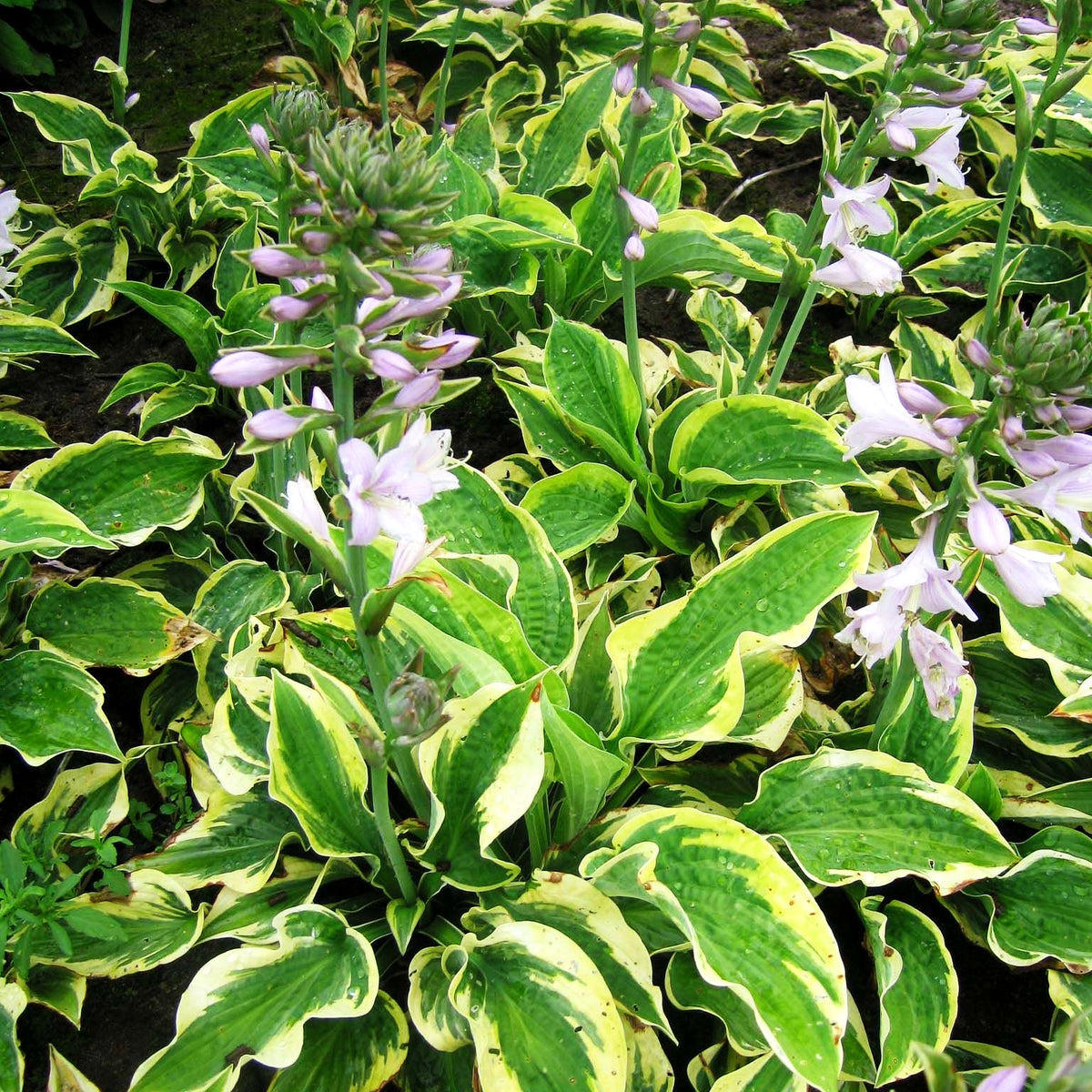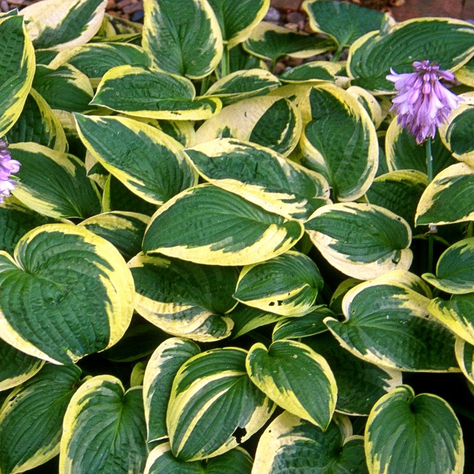 Die Gelbrandige Funkie (Hosta sieboldiana 'Wide Brim') ist eine prachtvolle Staude, die mit ihrem außergewöhnlichen Blattschmuck jeden halbschattigen Gartenbereich bereichert. Das graugrüne Laub mit dem charakteristischen breiten gelben Rand erreicht eine Höhe von 40-50 cm und entwickelt eine ausladende, bogige Wuchsform. Von Juni bis August erscheinen elegante, hell-violette einfache Blüten auf 60-80 cm hohen Stielen.