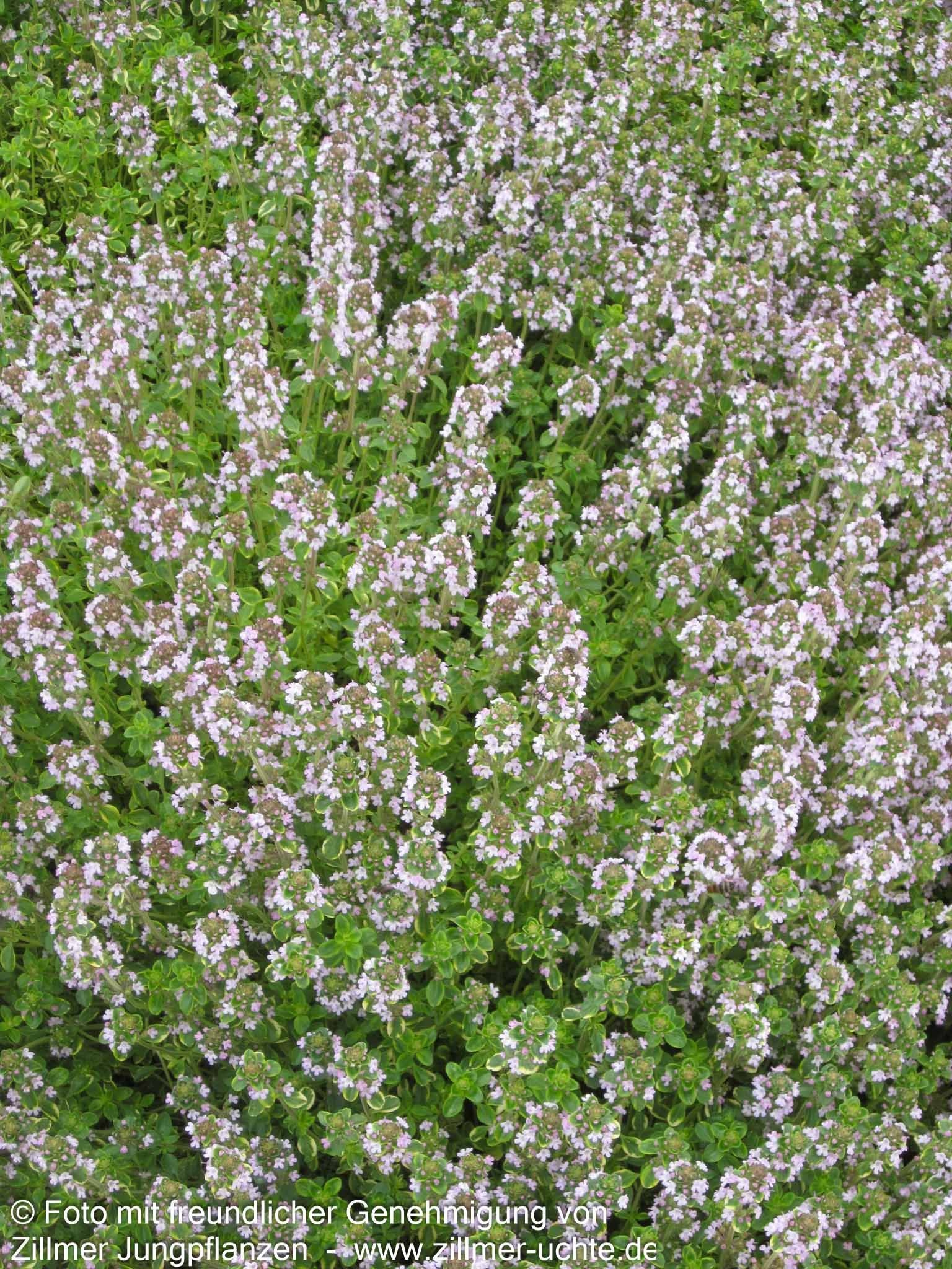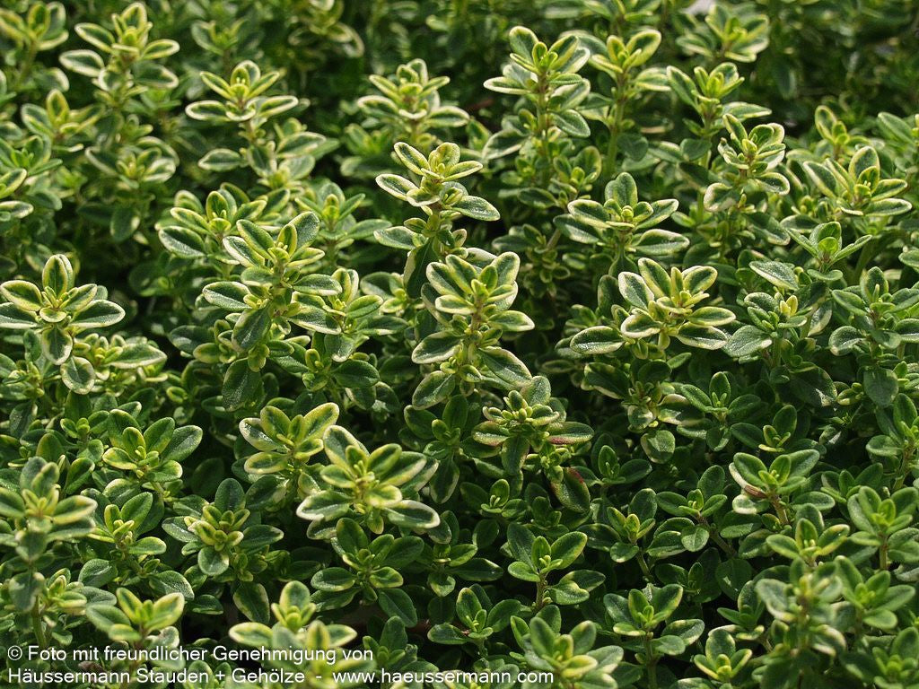 Der Gelbrandige Zitronen-Thymian 'Golden King' (Thymus x citriodorus 'Golden King') ist eine bezaubernde Züchtung, die Aroma und Schönheit perfekt vereint. Diese außergewöhnliche Staude besticht durch ihr grünes Blattwerk mit goldgelben Sprenkeln und verströmt einen herrlich frischen Zitronenduft. Von Juni bis August schmückt sich das 12-15 cm hohe Koch-Kraut mit zarten rosa Blüten, die als wertvolle Insektennährpflanze Bienen und Hummeln magisch anziehen. Das wintergrüne Laub mit seiner besonderen Blattfarbe macht diese Pflanze zum Publikumsmagneten in jedem Kräuterbeet. Sie gedeiht optimal an sonnigen Standorten mit trockenen Böden und eignet sich hervorragend für Steinanlagen, Felssteppe oder Mauerkronen. Als kleinflächiger Bodendecker mit kissenartiger Wuchsform sollten Sie 3-5 Stück pro Gruppe in 25-30 cm Abstand pflanzen.