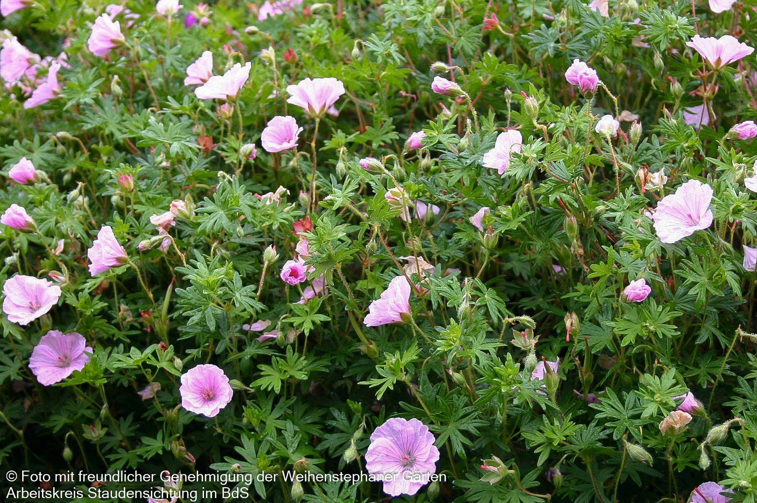 Der Gestreifte Blut-Storchschnabel (Geranium sanguineum var. striatum) ist eine ausgezeichnete Wahl für naturnahe Gärten und wurde nicht ohne Grund zur Staude des Jahres 2004 gekürt. Diese robuste Staude begeistert von Mai bis September mit ihren charmanten zart-rosa einfachen Blüten, die sich wunderschön über dem tief-grünen, sommergrünen Laub präsentieren. Als Sternensorte der deutschen Staudensichtung überzeugt sie durch ihre Vielseitigkeit und gedeiht sowohl als Gehölzrandstaude als auch in Steinanlagen. Die kissenartig wachsende Pflanze liebt sonnige Standorte mit trockenen Böden und eignet sich hervorragend als kleinflächiger Bodendecker oder für die extensive Dachbegrünung. Mit ihrer Winterhärte bis -28°C und einer kompakten Wuchshöhe von 25-30 cm ist sie eine pflegeleichte Bereicherung für jeden Garten.