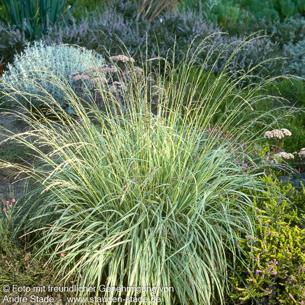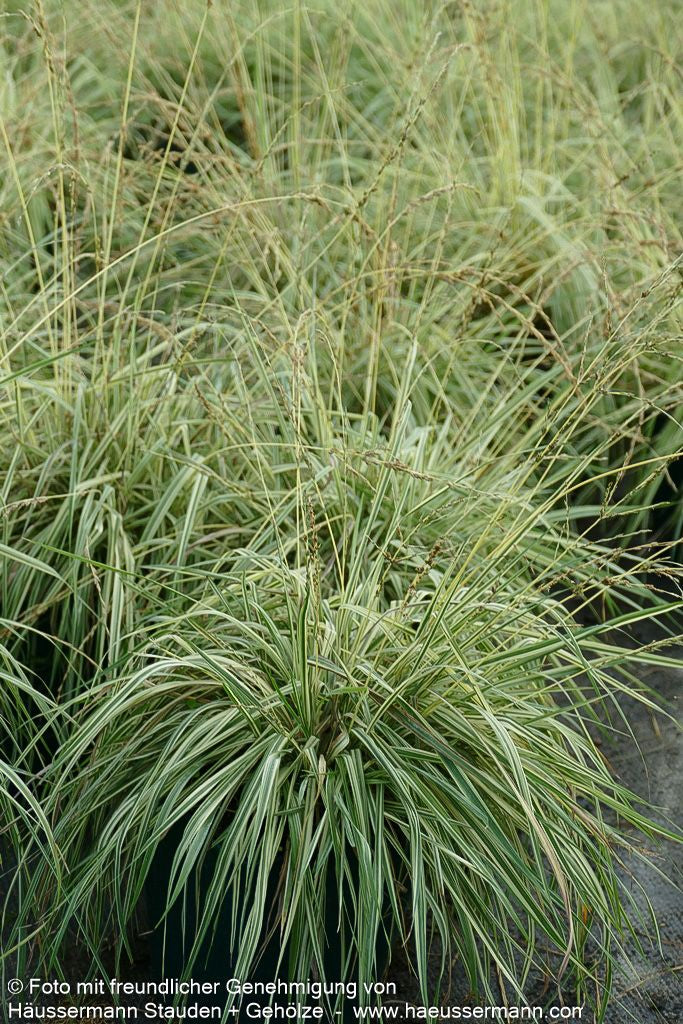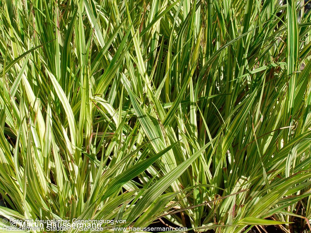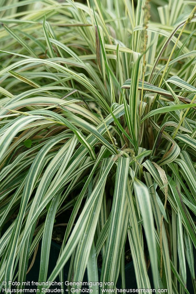 Das Gestreifte Pfeifengras (Molinia caerulea 'Variegata') ist ein außergewöhnlich attraktives Ziergras mit einer besonderen Blattform und Textur. Die elegant bogig überhängenden Blätter zeigen eine reizvolle gelb-grüne Streifung und erreichen eine Höhe von etwa 20 cm. Von August bis Oktober erscheinen die gelblich schimmernden Blütenrispen in einer Höhe von 40-50 cm. Diese als Sternensorte ausgezeichnete Staude gedeiht sowohl sonnig als auch halbschattig auf frischen bis feuchten Böden. Als vielseitige Gehölzrandstaude eignet sie sich hervorragend als Begleitung zu Rhododendron, für die Floristik und sogar für Grabstätten.