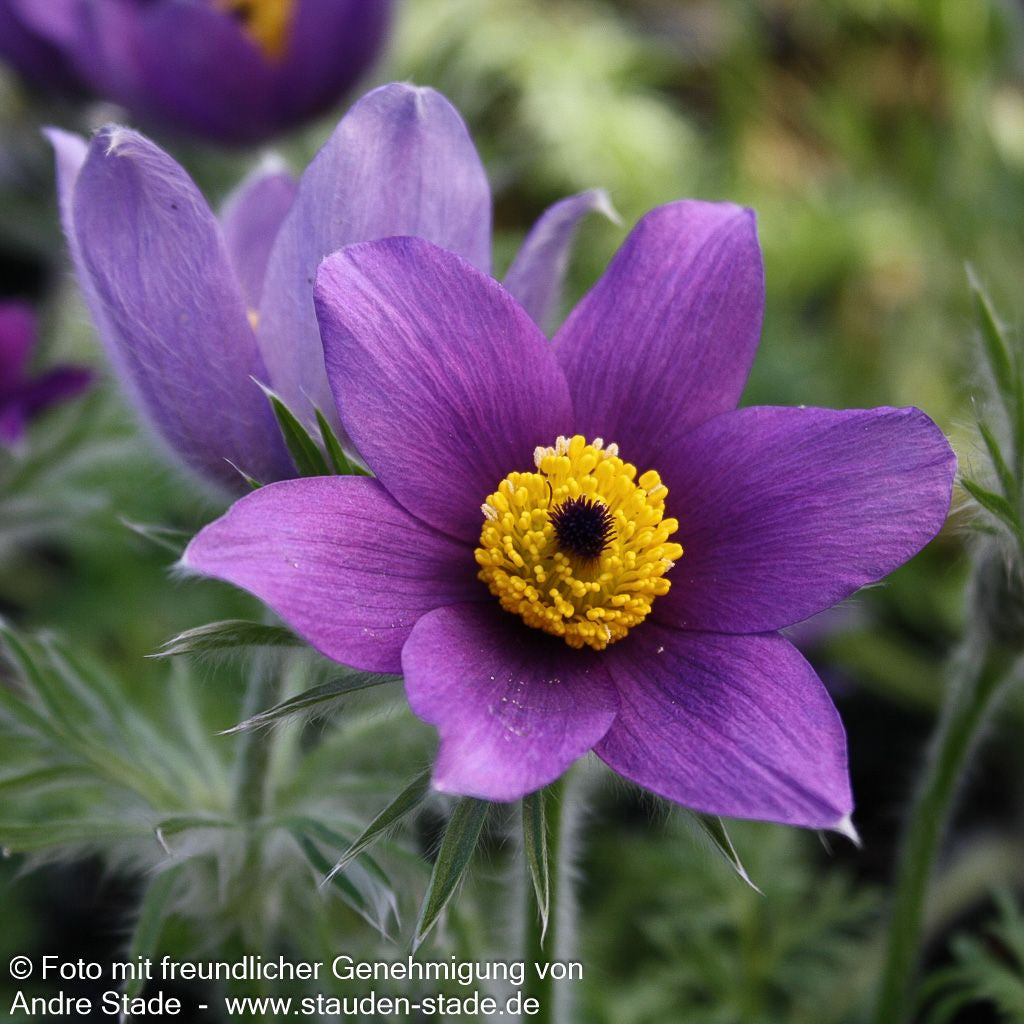 Die Gewöhnliche Kuhschelle (Pulsatilla vulgaris) ist eine bezaubernde heimische Staude, die bereits im zeitigen Frühjahr mit ihren violetten, einfachen Blüten begeistert. Diese frühlingshafte Sternensorte erreicht eine Blütenhöhe von 20 cm und blüht von März bis Mai. Das tiefgrüne Blattwerk bildet einen grundständigen Blattschopf von 5-10 cm Höhe und bietet nach der Blüte attraktiven Fruchtschmuck. Diese robuste Staude gedeiht optimal an sonnigen Standorten mit trockenen Böden und eignet sich hervorragend für Steinanlagen, Bauerngärten oder als Insektennährpflanze. Mit ihrer Winterhärte bis -28°C ist diese heimische Heilpflanze eine wertvolle Bereicherung für jeden naturnahen Garten.