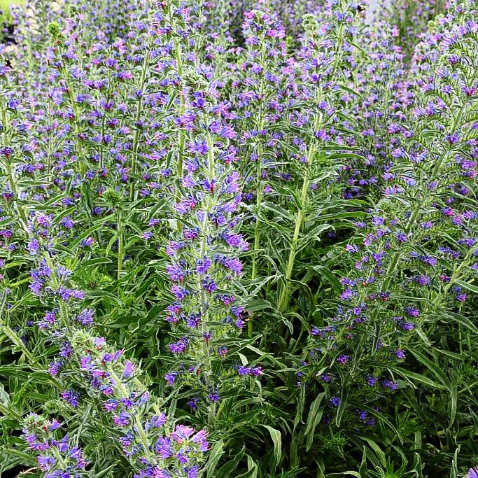 Der Gewöhnliche Natternkopf (Echium vulgare) verzaubert mit seinen leuchtend violettblauen Blüten, die von Mai bis August zahlreiche Insekten anlocken. Diese heimische zweijährige Freiflächenstaude erreicht eine beeindruckende Blütenhöhe von 40 bis 100 cm und setzt mit ihren einfachen Blüten natürliche Akzente im Garten. Die grünen, sommergrünen Blätter bilden einen reizvollen Kontrast zur blauen Blütenpracht.