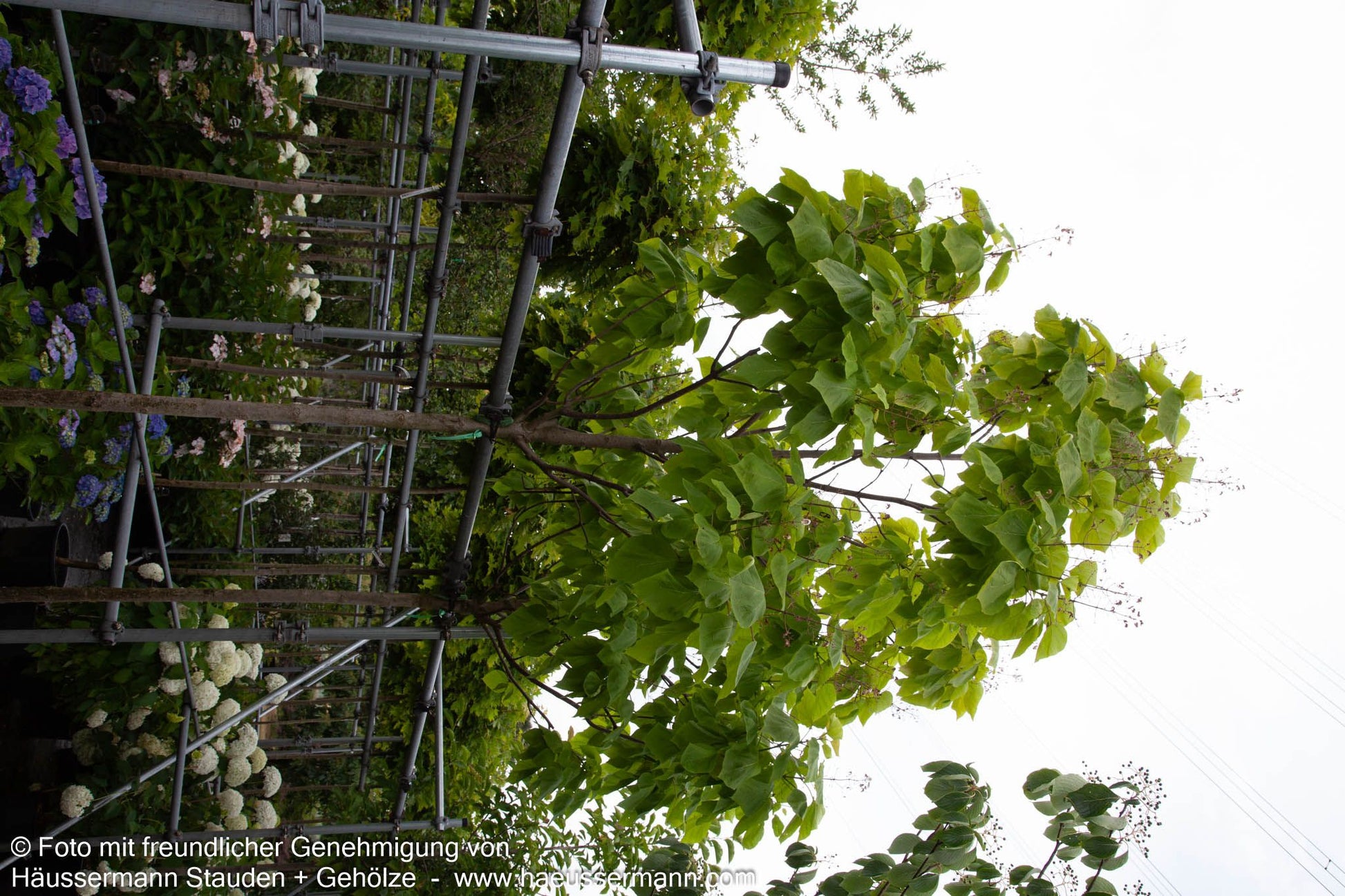 Der Gold-Trompetenbaum (Catalpa bignonioides 'Aurea') ist ein außergewöhnlich schöner Laubbaum, der mit seinem spektakulären Farbspiel durch die Gartensaison führt. Als mittelgroßer Kleinbaum erreicht er eine Höhe von 8-10 Metern und eine Breite von 5-8 Metern mit breit aufrechter Wuchsform. Seine großen Blätter begeistern mit leuchtend goldgelbem Austrieb, der später in ein frisches Hellgelbgrün übergeht und eine außergewöhnliche Blattform aufweist. Der herbstfärbende Baum entwickelt von Juli bis August auffallend weiße Blüten als prächtigen Blütenschmuck und dient als wertvolle Insektennährpflanze. Das sommergrüne Gehölz gedeiht an sonnigen, halbschattigen bis absonnigen Standorten und toleriert sowohl trockene als auch frische Böden.