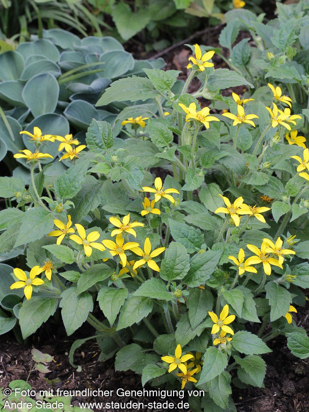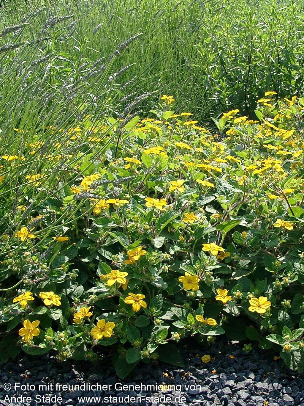 Das Goldkörbchen (Chrysogonum virginianum 'Andre Viette') verzaubert von Mai bis August mit seinen leuchtend tief-gelben, einfachen Blüten und bildet dabei dichte, goldgelbe Blütenteppiche. Diese robuste Staude entwickelt sich zu einem flach ausgebreiteten, kleinflächigen Bodendecker mit grünem, wintergrünem Laub. An sonnigen Standorten mit frischem bis feuchtem Boden fühlt sich diese Insektennährpflanze besonders wohl und eignet sich hervorragend als Gehölzrandstaude oder für Matten-Pflanzungen. Mit ihrer Winterhärte bis -17°C ist diese Züchtung eine zuverlässige Bereicherung für jeden Garten.